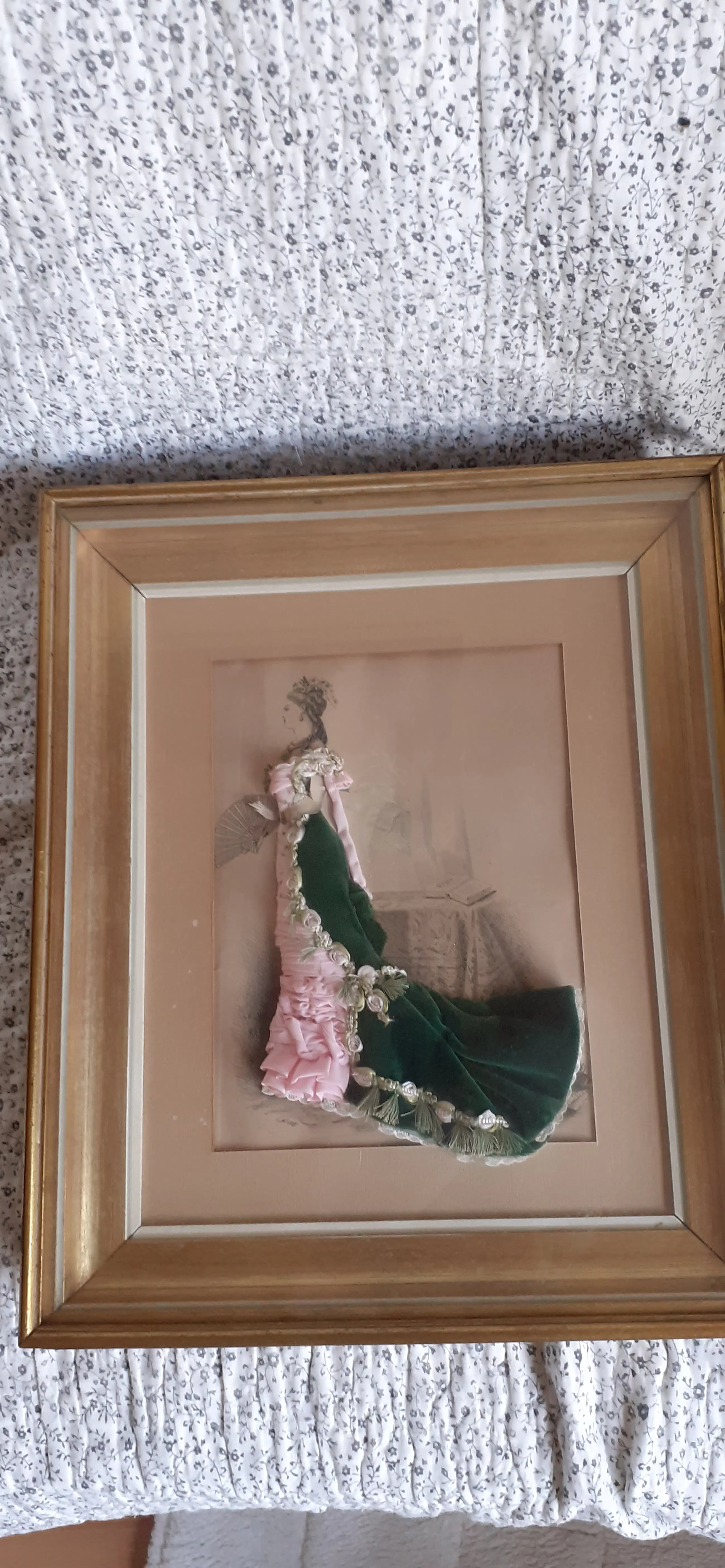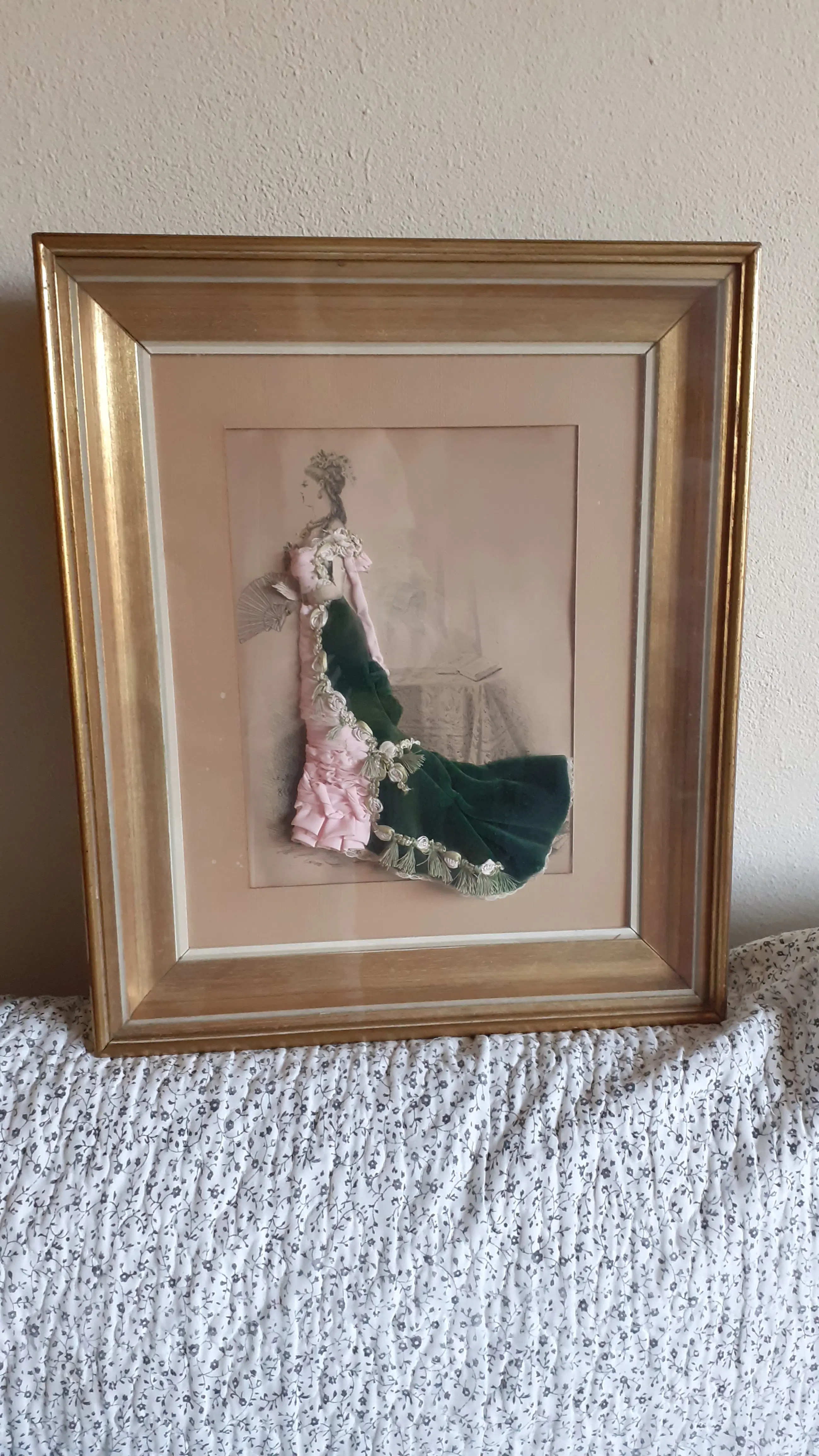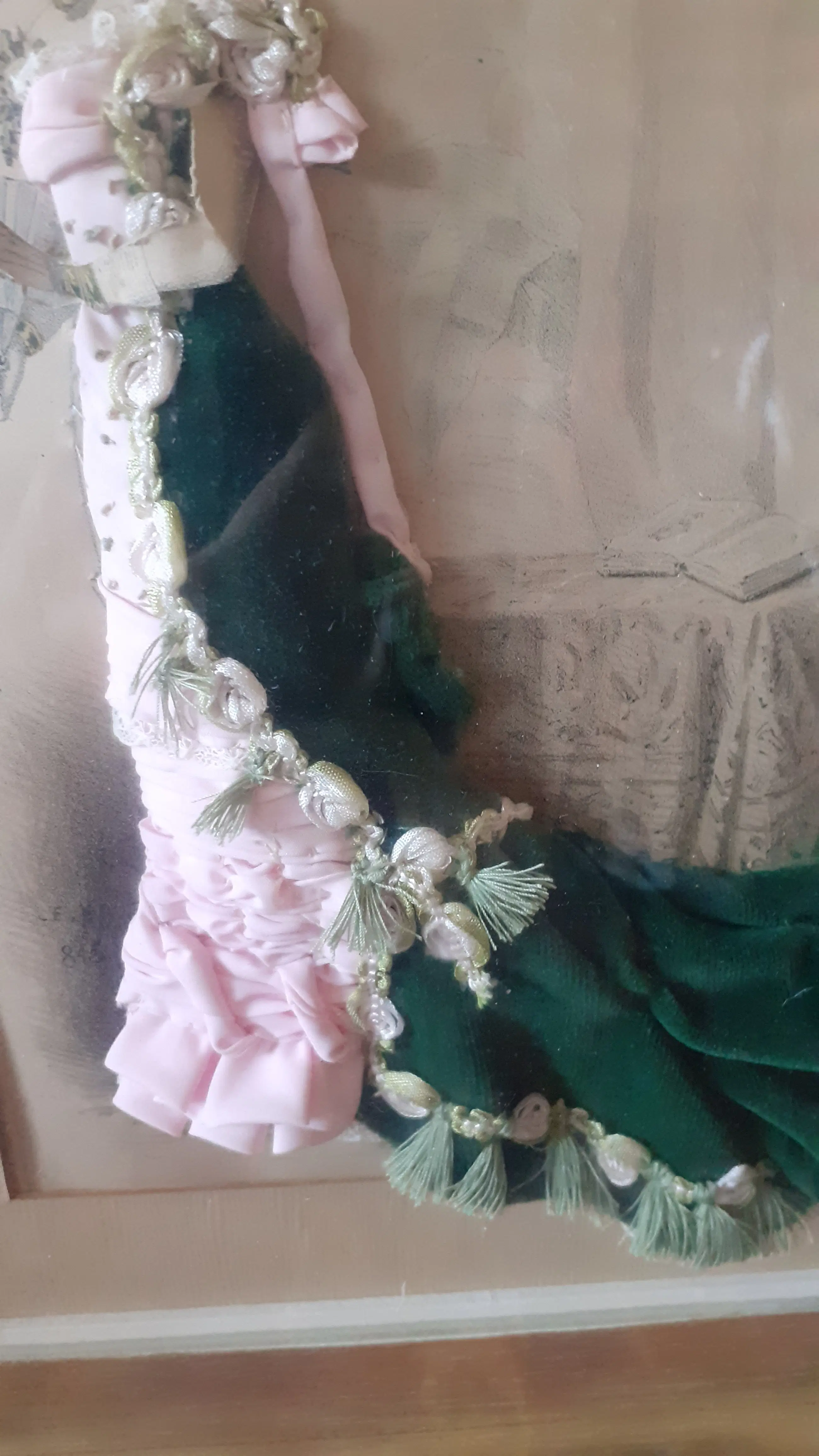 Dit is een ingelijste afbeelding of een kunstwerk dat een persoon in historische kleding toont, mogelijk uit de 19e eeuw, gezien de stijl van de jurk en het kapsel. Het is een combinatie te zijn van een tekening of print met driedimensionale elementen, zoals stof of linten, die de jurk extra textuur en diepte geven.