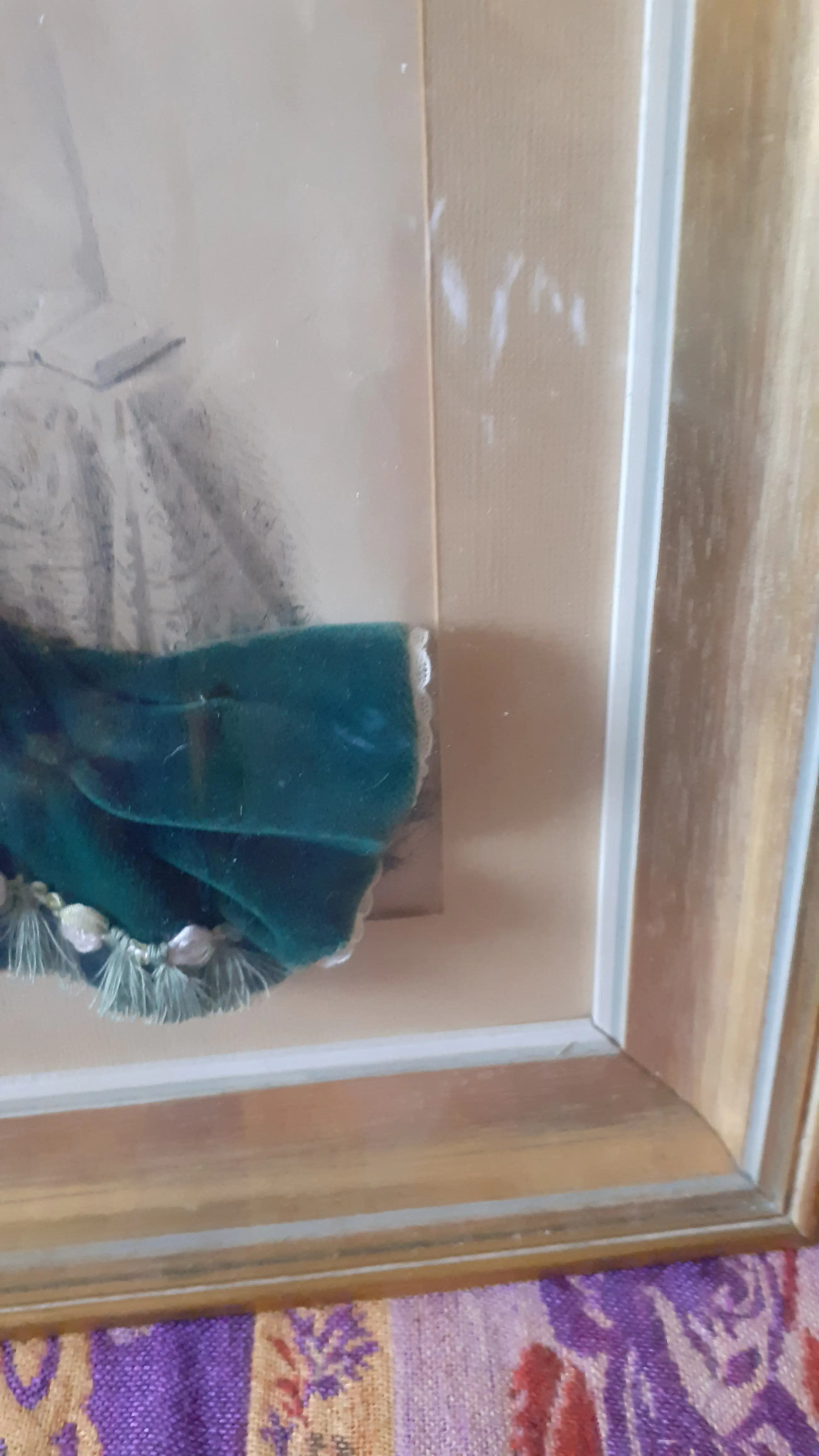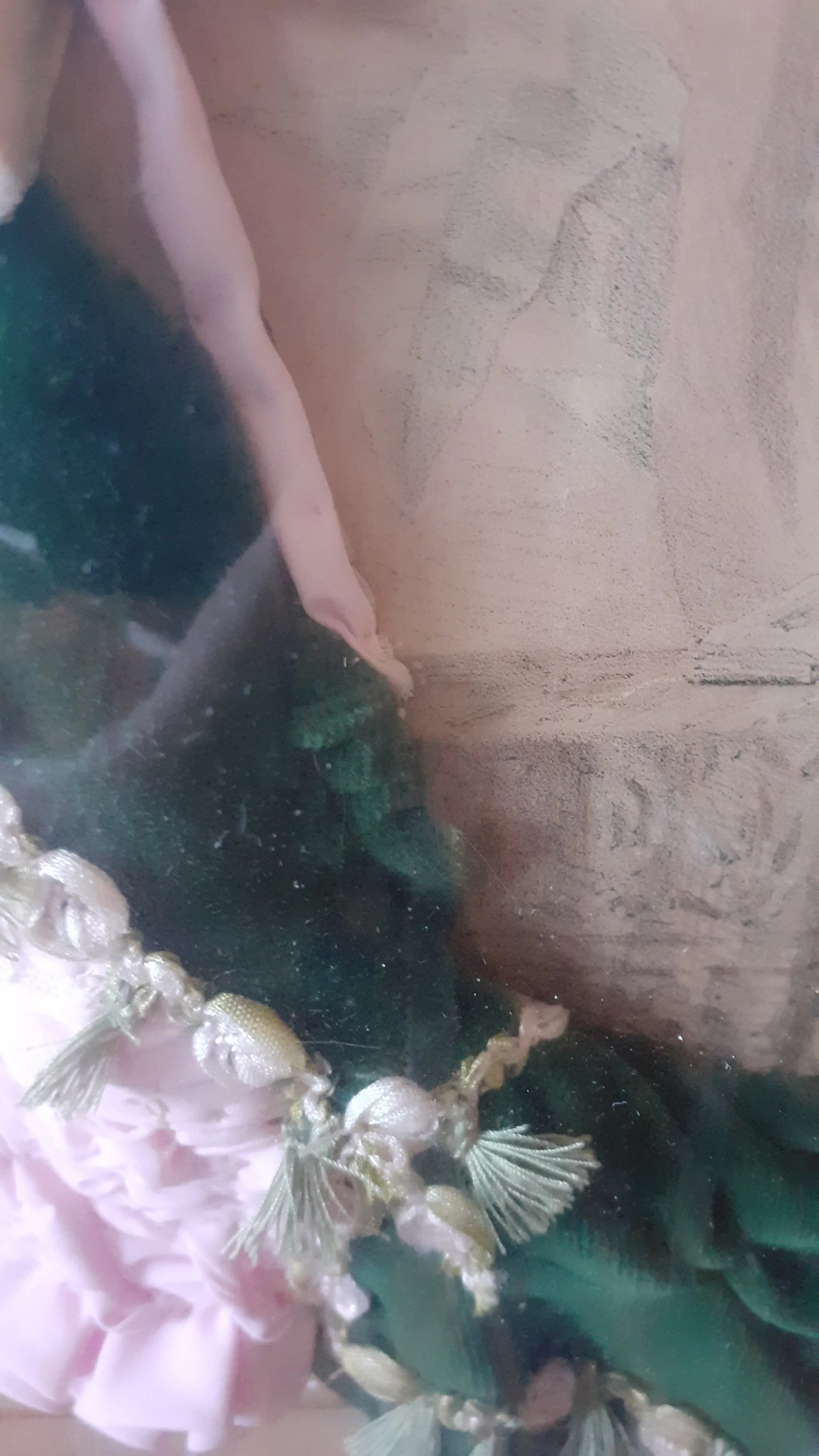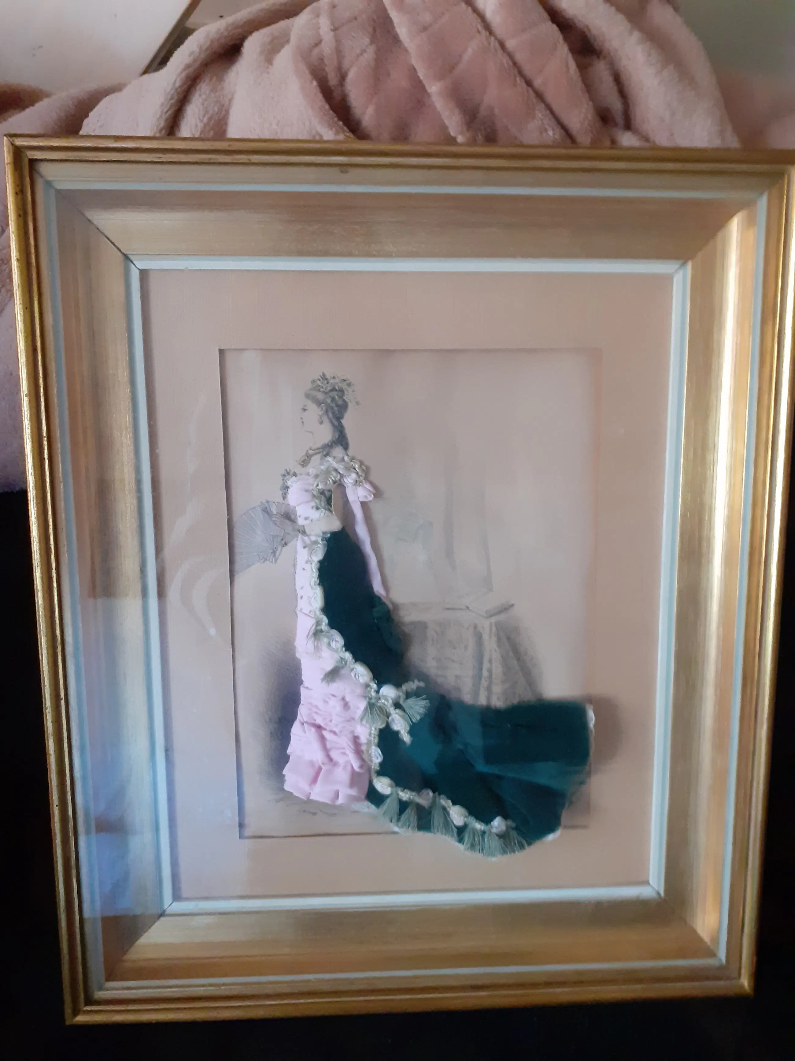 Dit is een ingelijste afbeelding of een kunstwerk dat een persoon in historische kleding toont, mogelijk uit de 19e eeuw, gezien de stijl van de jurk en het kapsel. Het is een combinatie te zijn van een tekening of print met driedimensionale elementen, zoals stof of linten, die de jurk extra textuur en diepte geven.