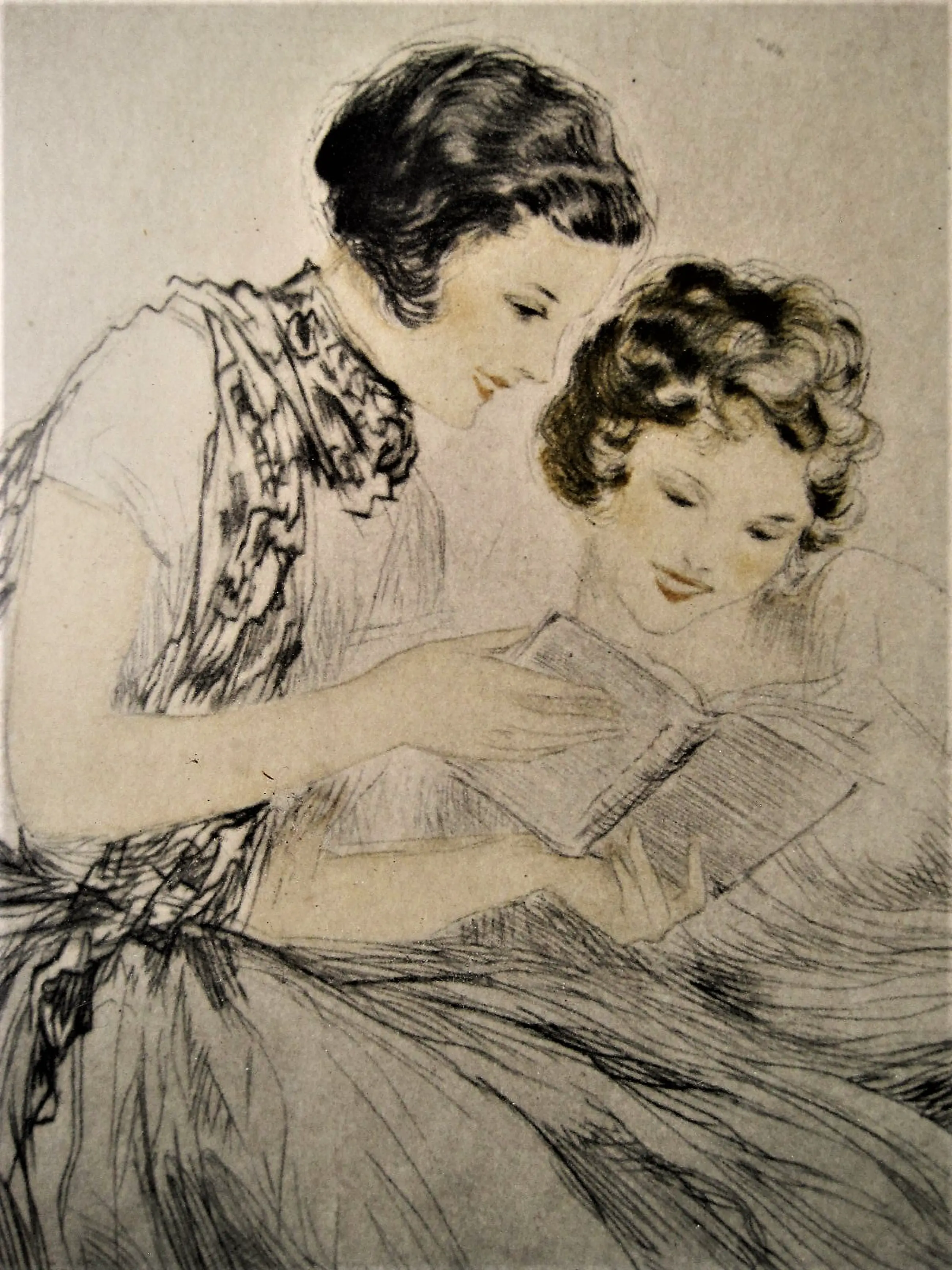 Originele, waarschijnlijk Franse, omstreeks 1880/1890 Potlood/Sepia in de art Nouveau stijl gemaakte tekening "jonge dames met boek". Aparte ovalen voorstelling (bladmaat 23x33 cm) in een sobere vroeg 20e eeuwse houten lijst. Geen signatuur op te herkennen. Het aquarel verkeert in goede conditie. De lijst heeft wel de nodige beschadigingen.