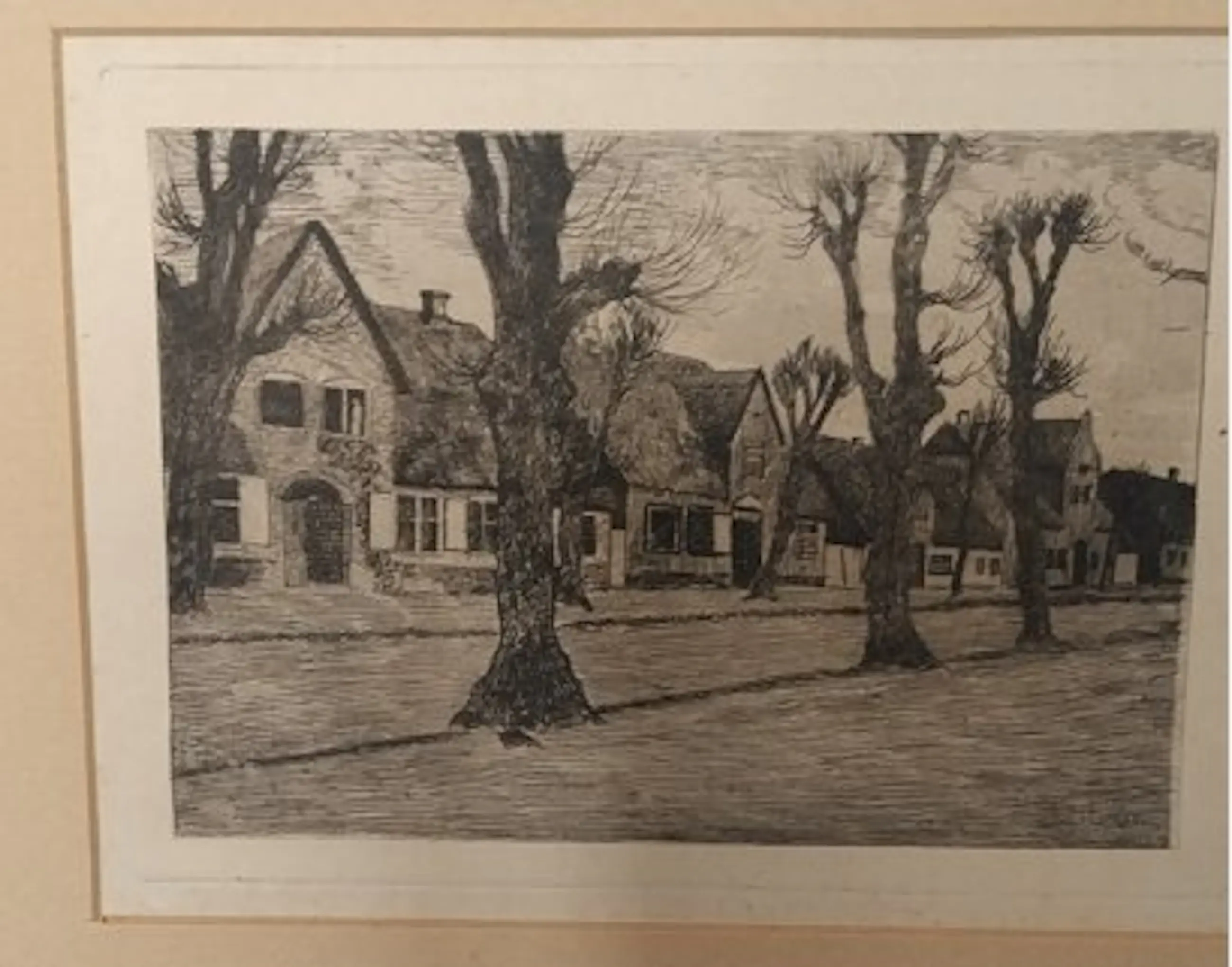 Sfeervolle radering van de Deense kunstenaar Axel Emil Jensen‑Stevns, bekend om zijn verstilde dorpsgezichten en karakteristieke bomenrijen. Landsbygade toont een rustige straat met oude huizen en hoge, kale bomen — een typisch motief uit zijn oeuvre.