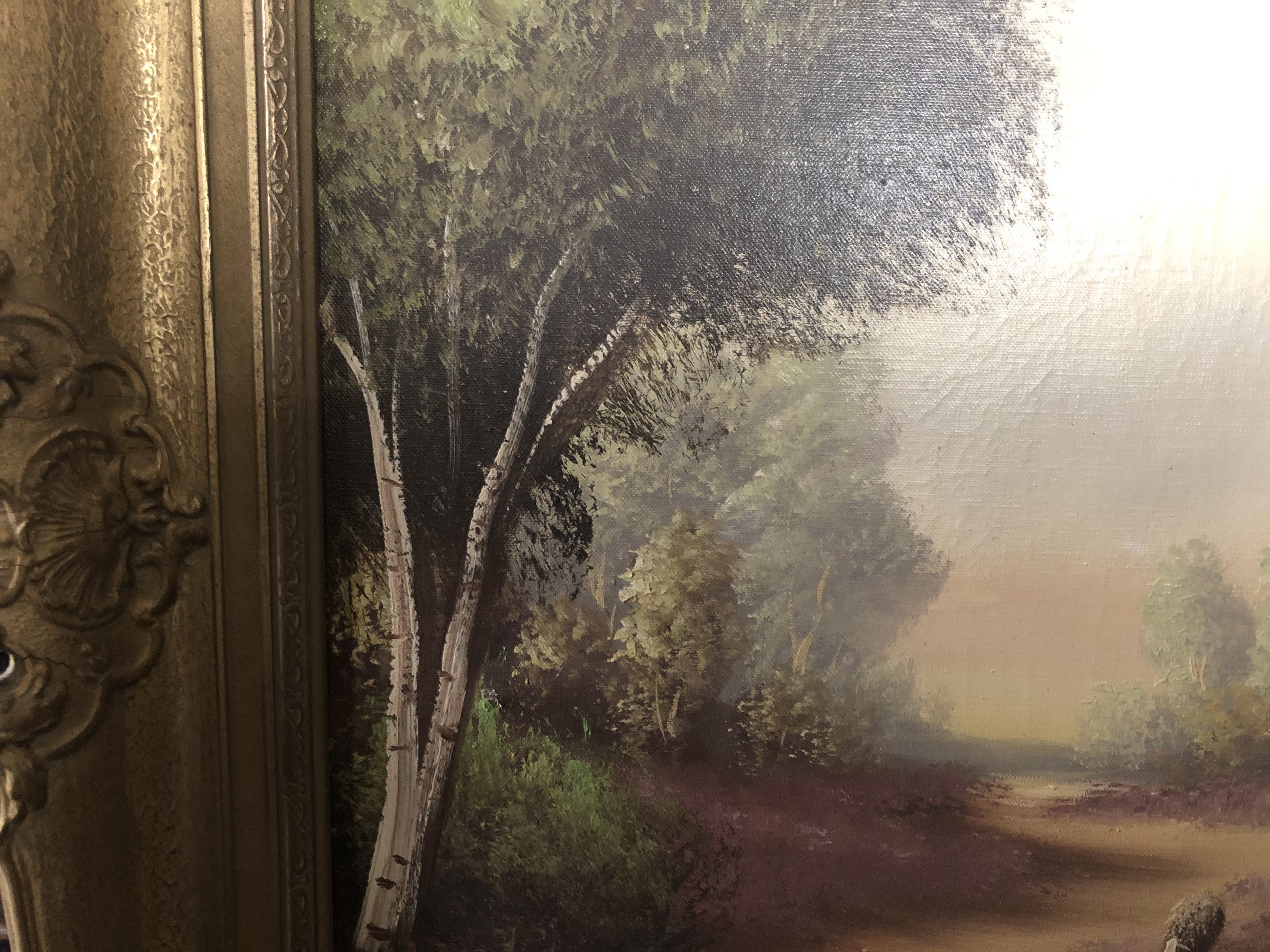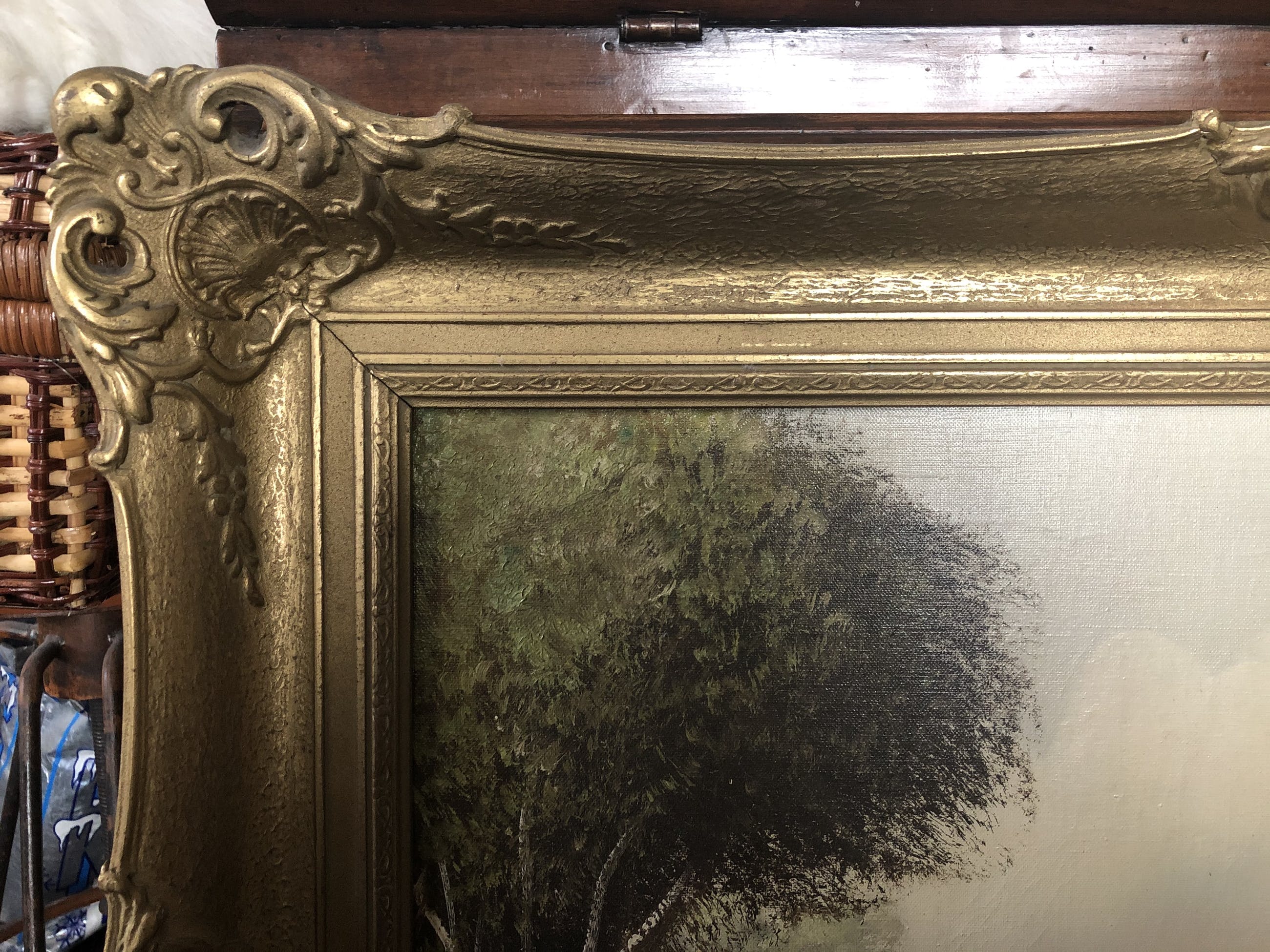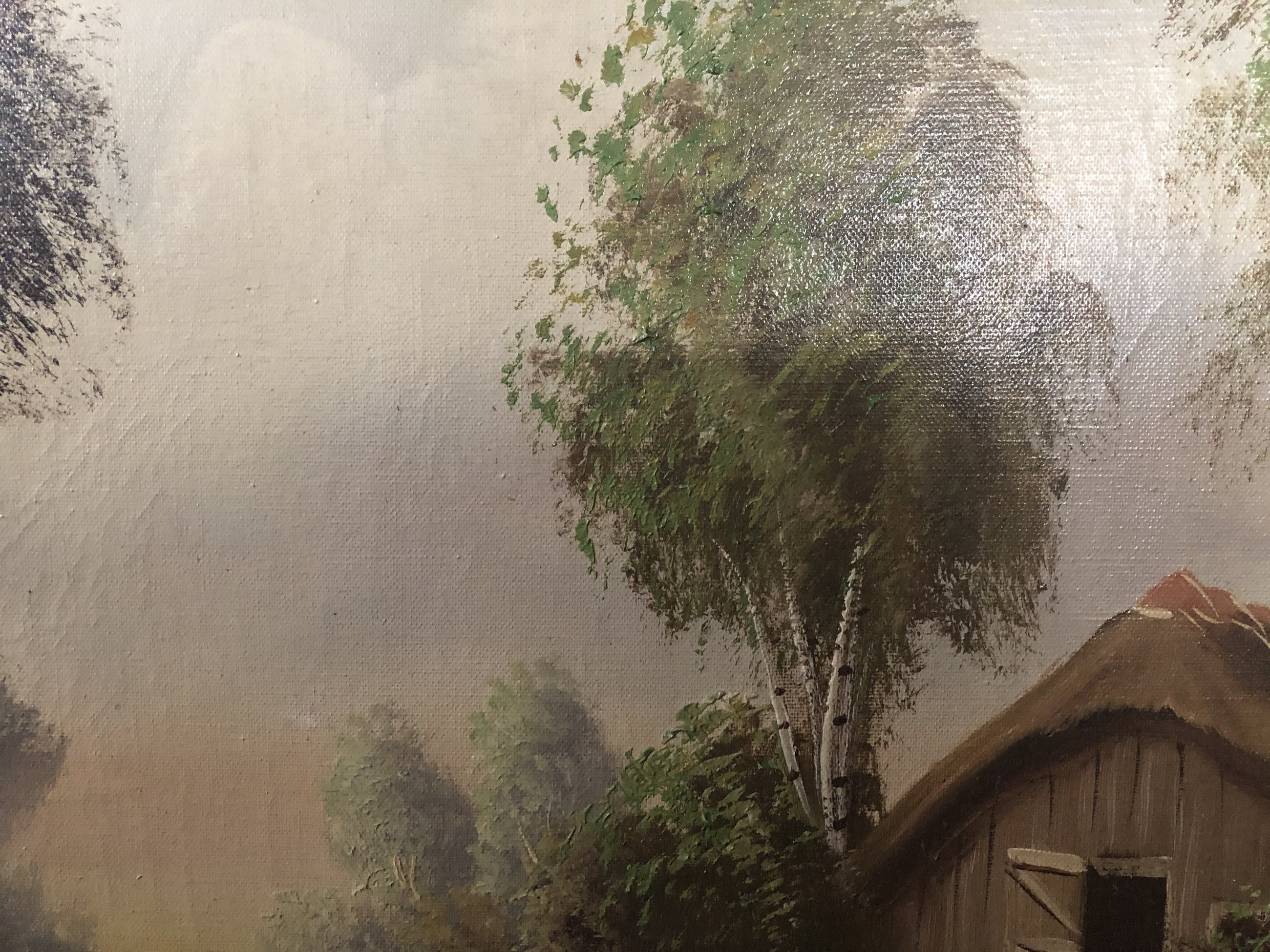 Olieverfschilderij op doek. Landschap met een boerenschuur en schapen. Mooie barokke lijst. Gesigneerd links onderin, maar moeilijk te ontcijferen. Begint met een M…