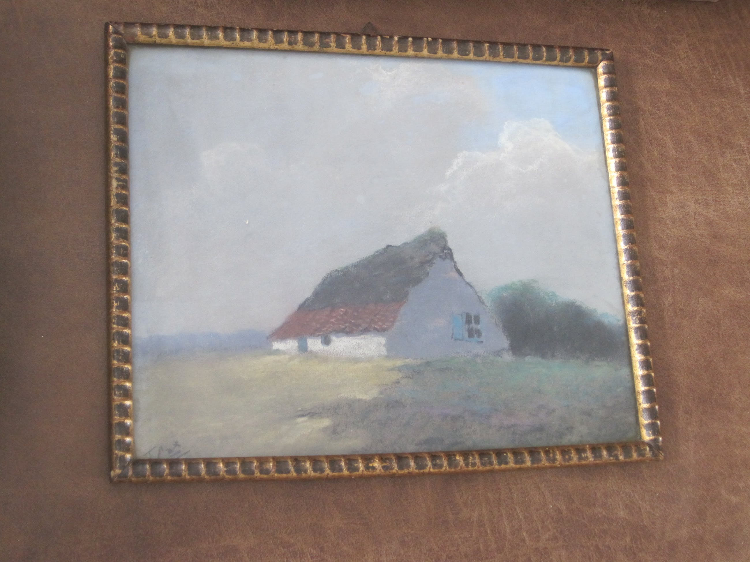 Een oud schilderijtje van een oude keuterboerderij met omgeving.Zachte pasteltinten. Linksonder gesigneerd. Een werk dat nog niet uit de lijst geweest is.Lastig te fotograferen door de weerspiegeling van het glas.