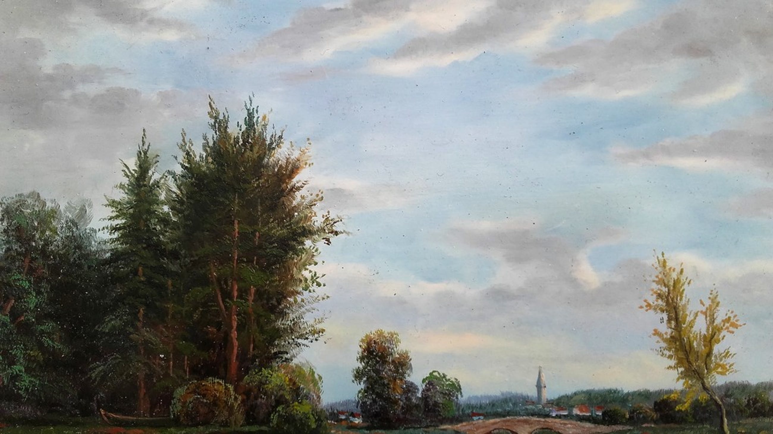 Landschap met personen, het is geschilderd met olieverf op paneel. Gesigneerd maar erg onduidelijk. Afm totaal: 39.5 x 35 cm. Afm paneel: 24 x 19 cm. Het verkeerd in perfecte staat. Het wordt extra goed ingepakt, o/a met noppenplastic en doos.