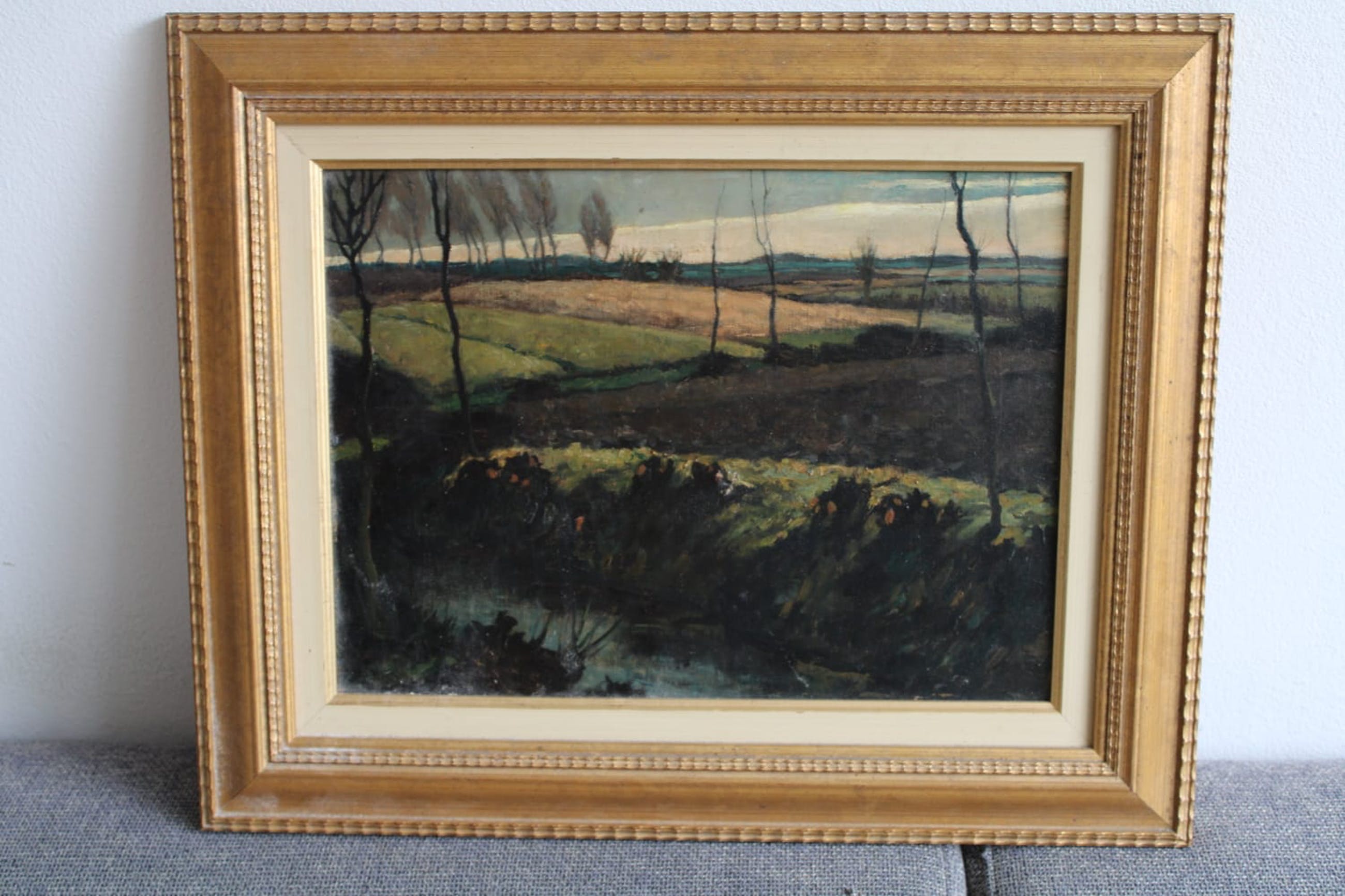 klein landschapschilder van onbekende maker. Op de lijst staat de naam Larus Santhuijs maar ik heb niks kunnen vinden online op deze naam. Er zit een kleine beschadiging in het doek. goed te zien op de foto