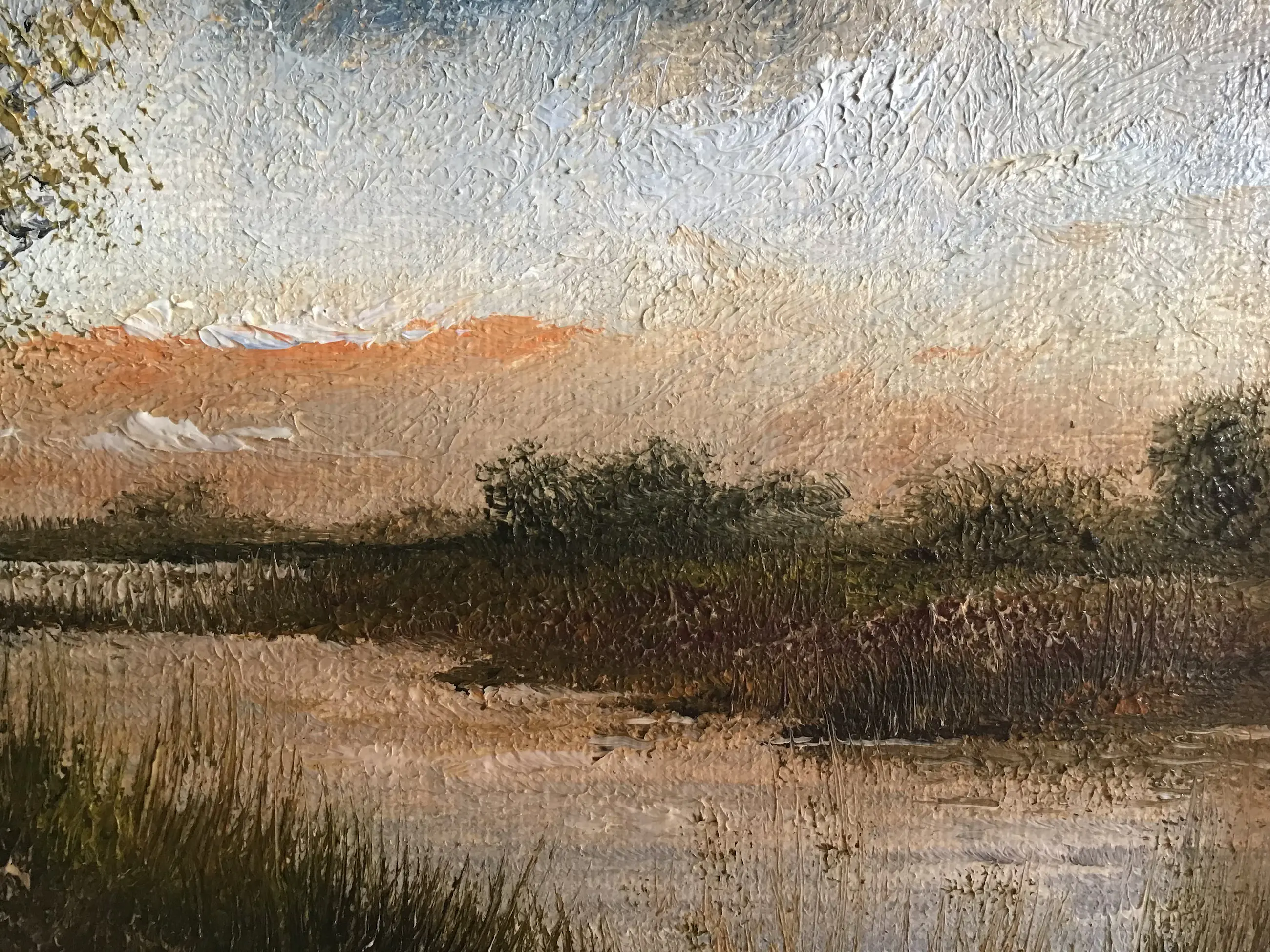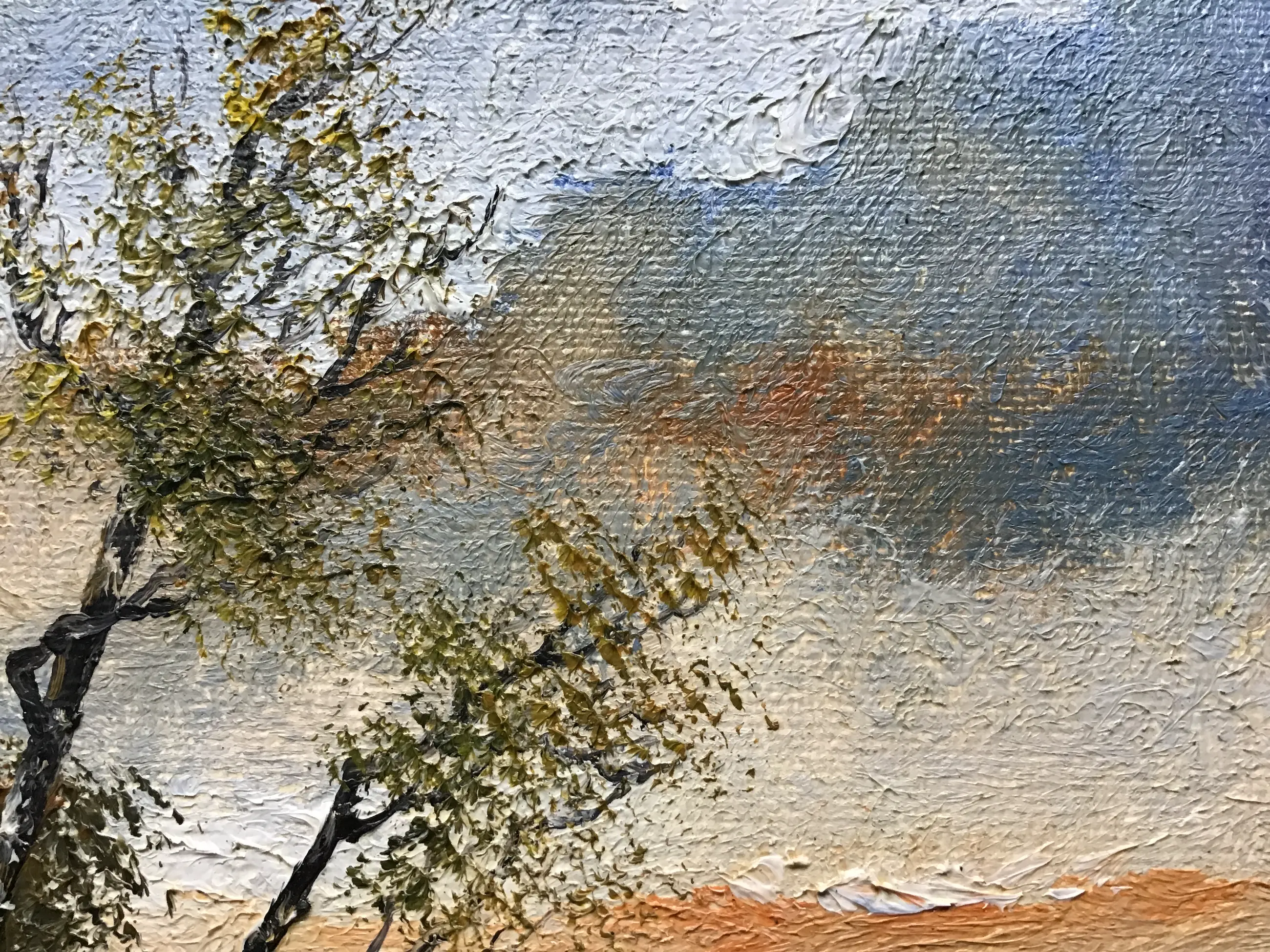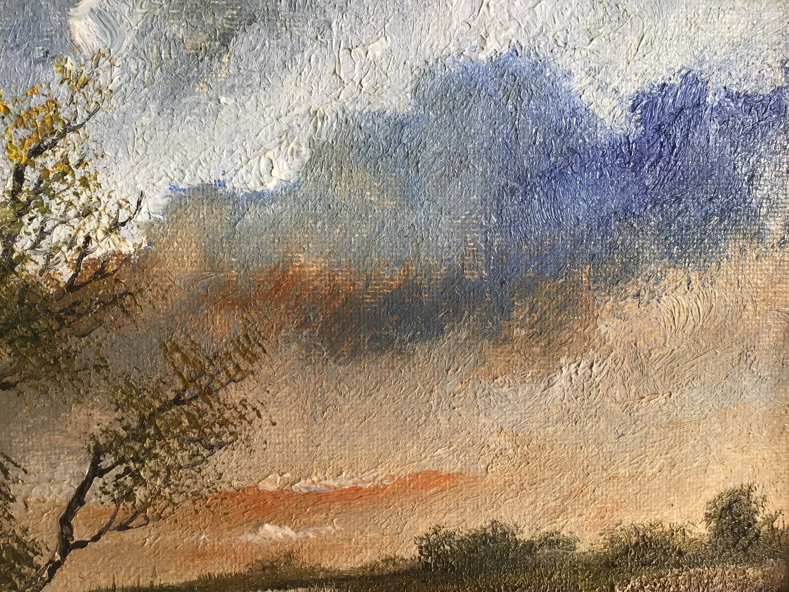 Klein expressief landschapje. Vooral de lucht doet denken aan de landschappen van Leo Jordaens. Hollandse school.
