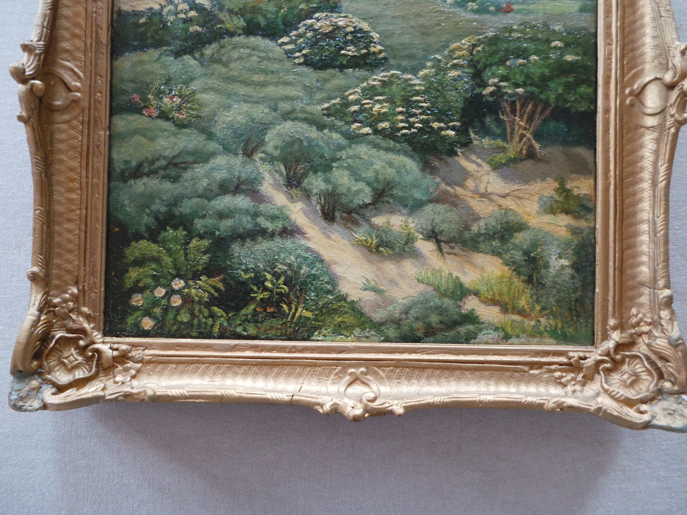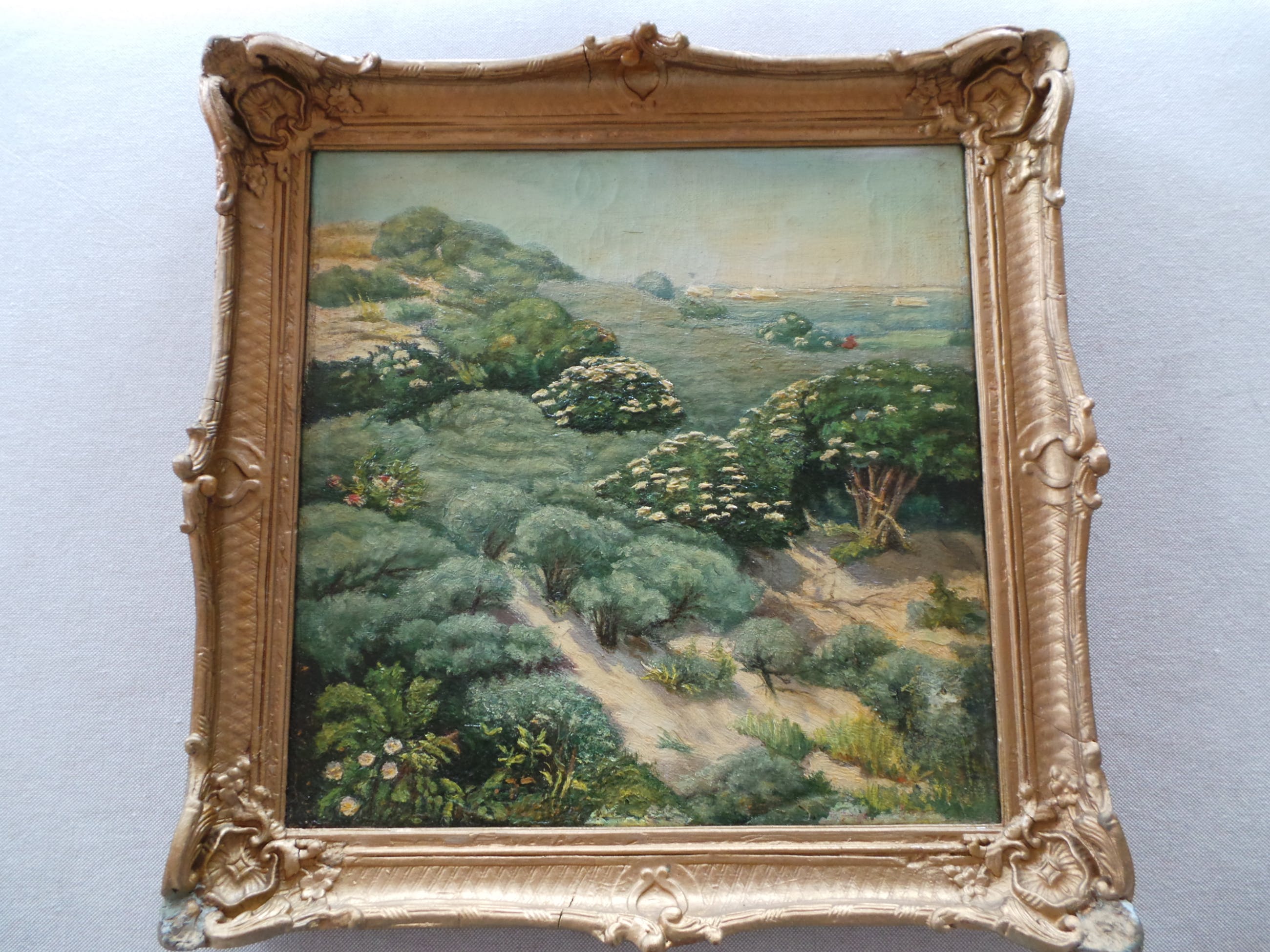 Landschap 20 eeuw Olieverf op doek Afmeting doekmaat 28 x 28 cm Afmeting met lijst 35 x 35 cm Gesigneerd ?