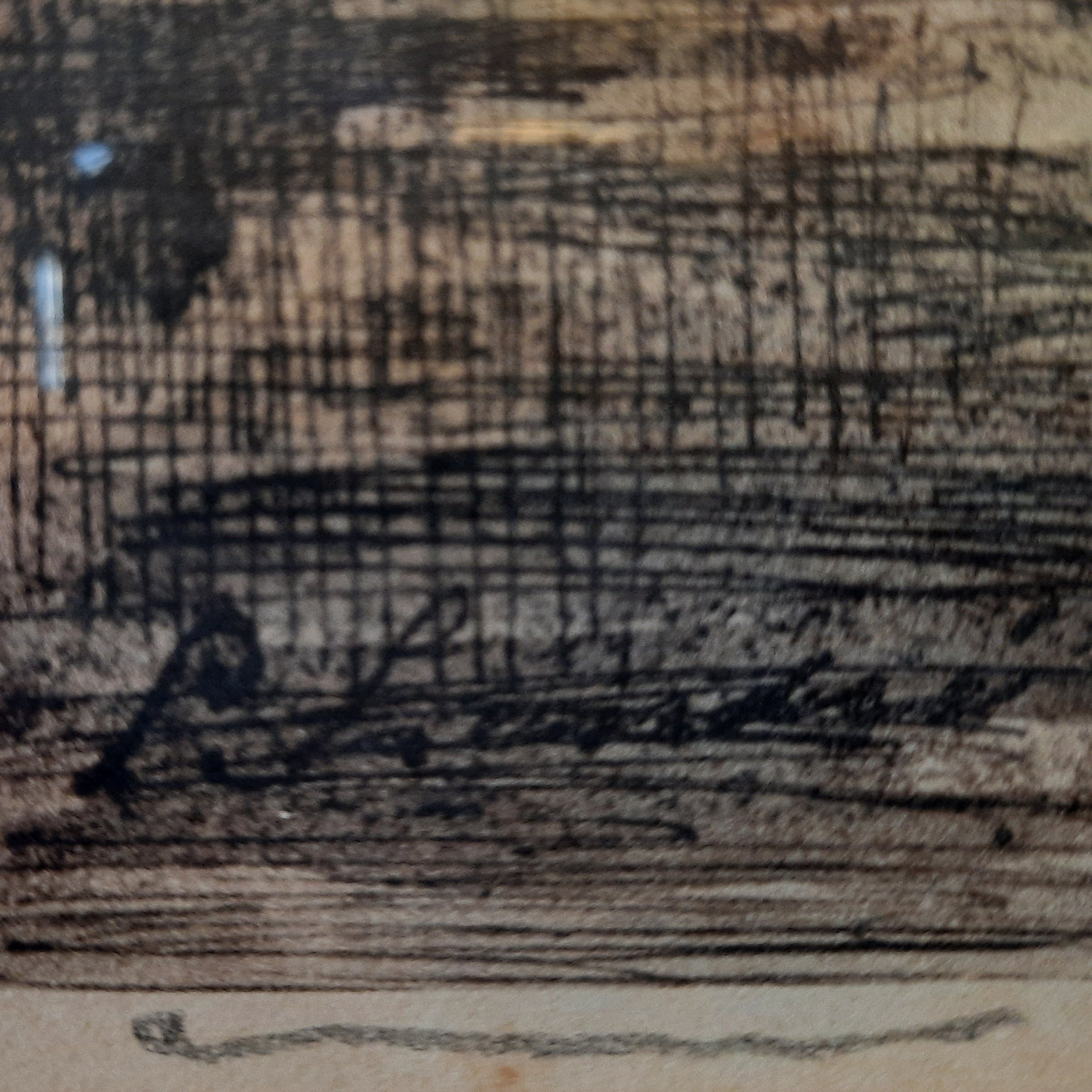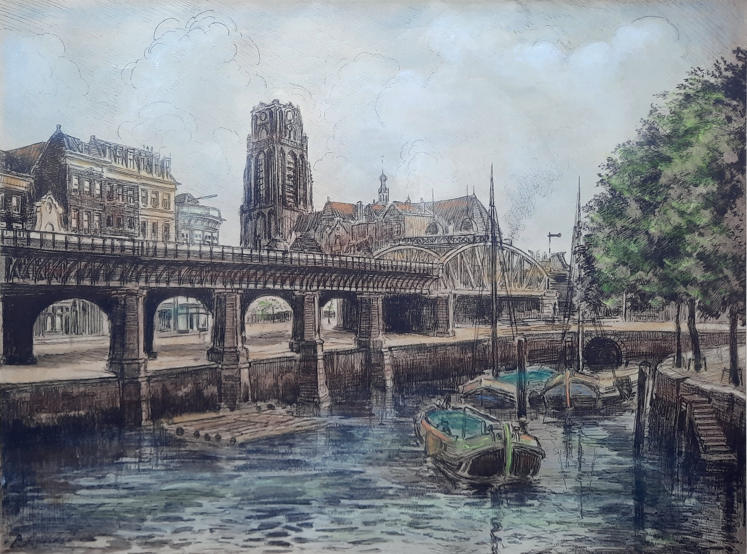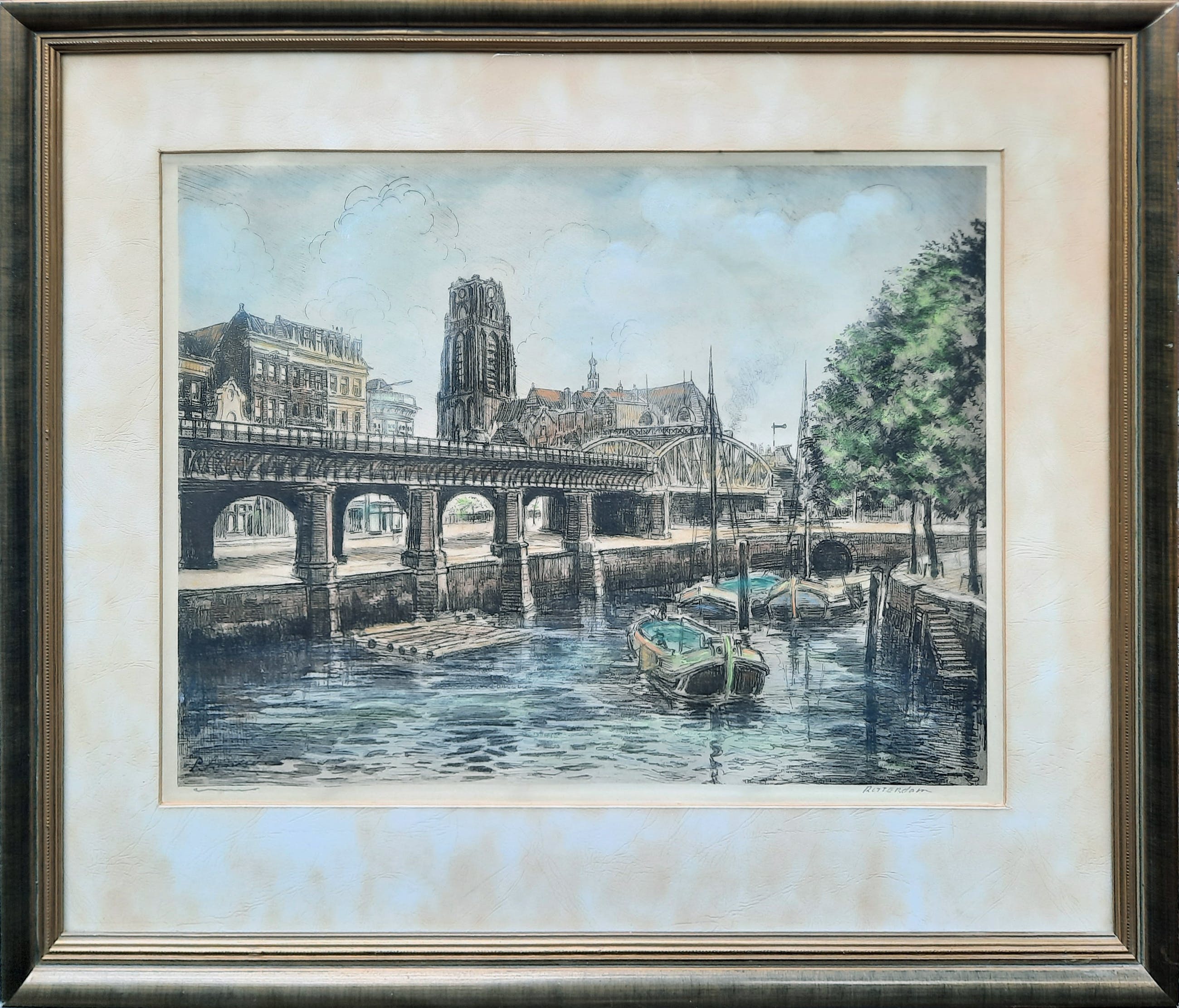 Ingekleurde ets van de Laurenskerk Rotterdam met de toen nog bovengrondse treinbaan. Ingeschilderde ets in houten lijstje achter glas. Passe-partout is aan vervanging toe.