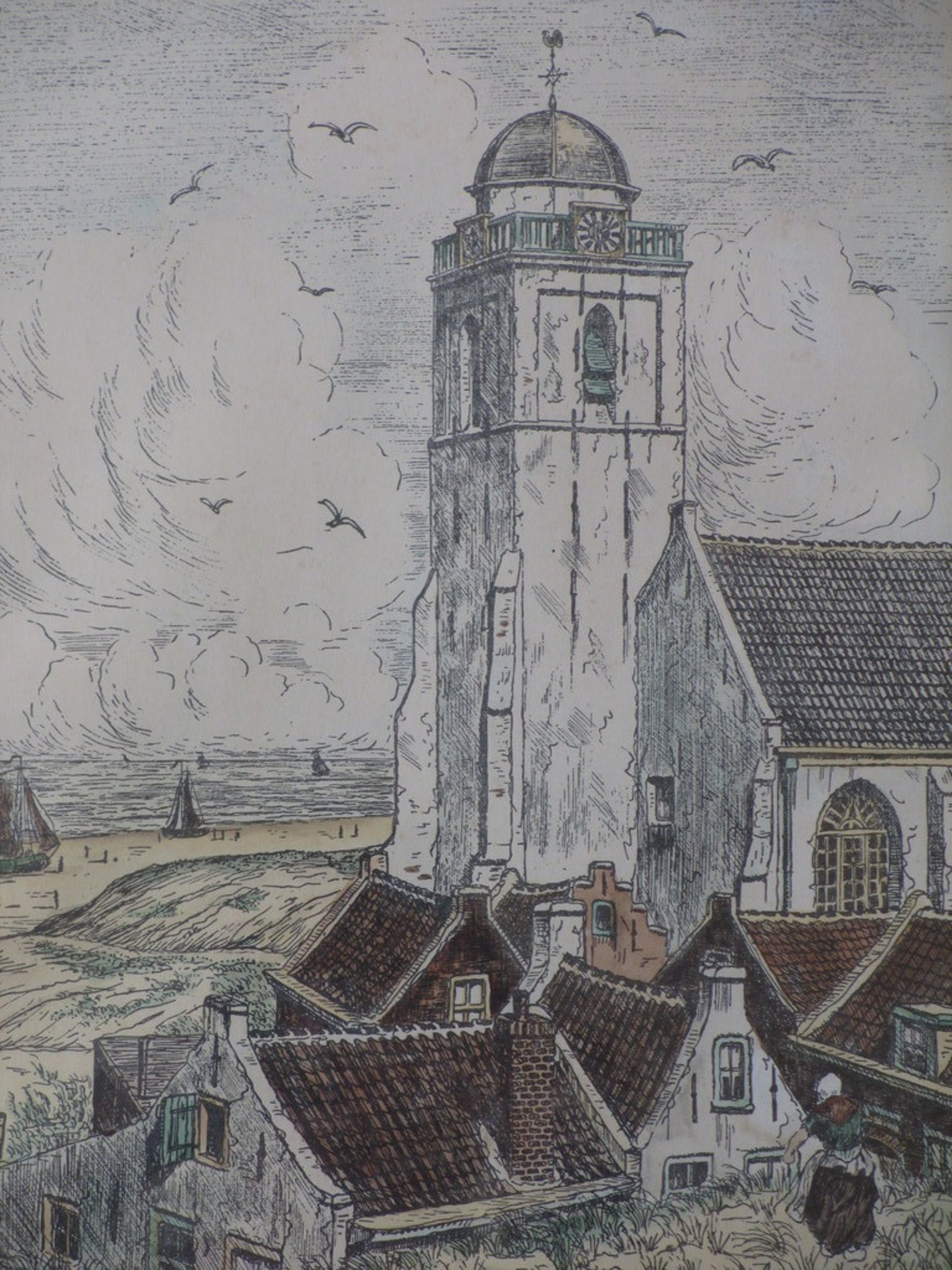 Voorstelling van Katwijk aan Zee met Andreaskerk en bomschuiten op het strand
