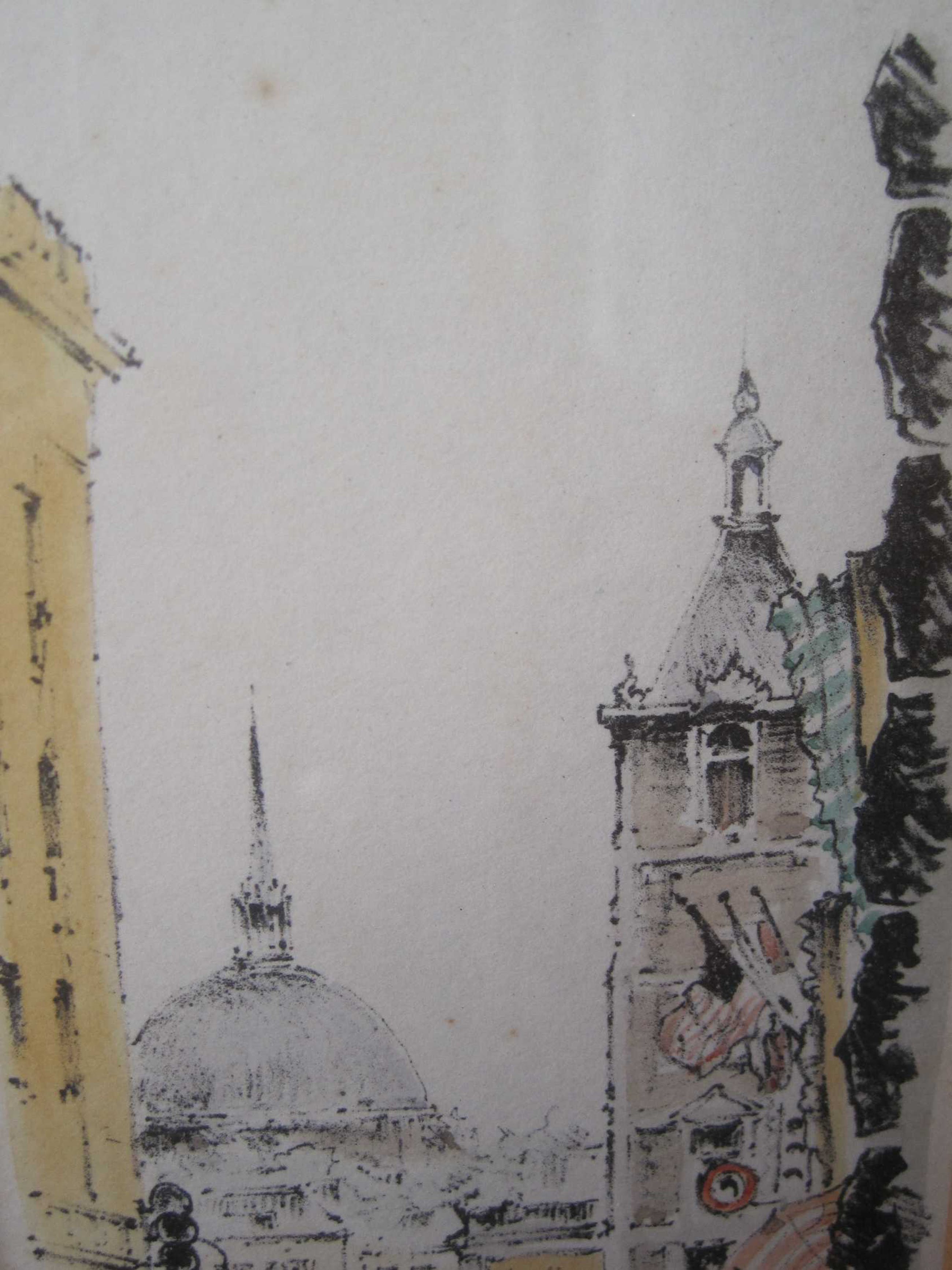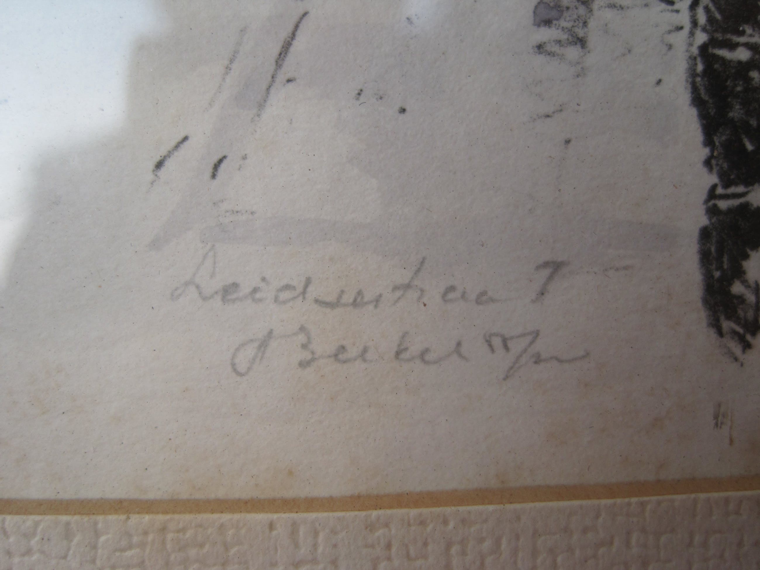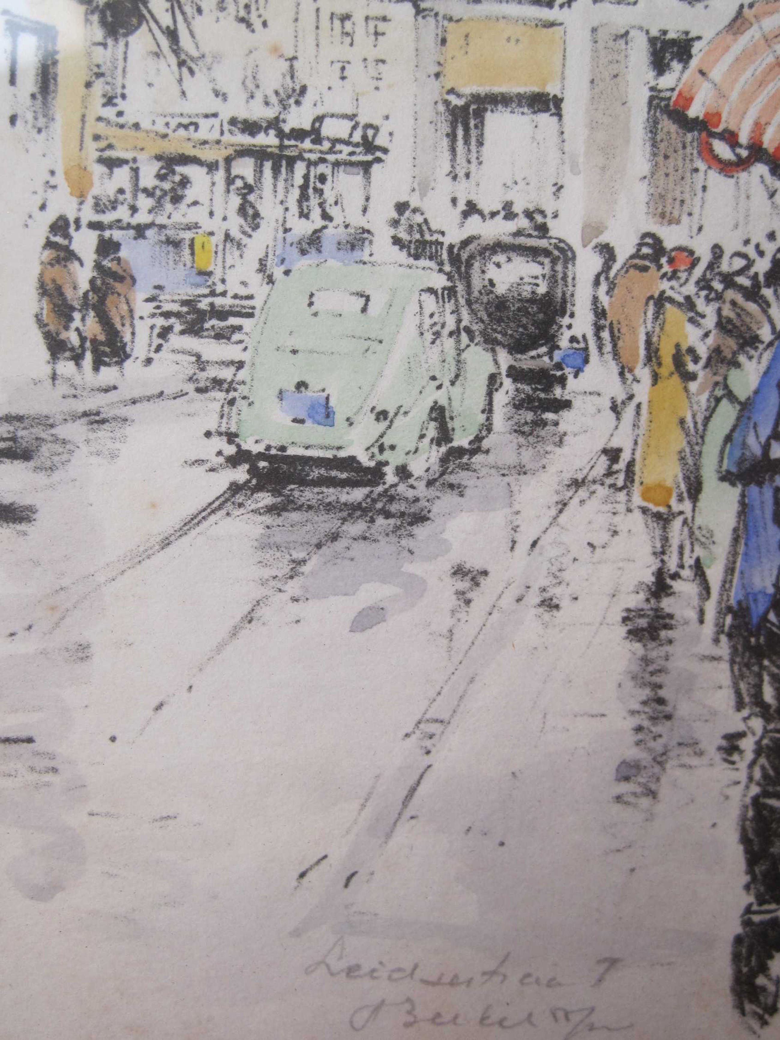 Heel nostalgische afbeelding uit de jaren 1950 van de Leidsestraat in Amsterdam met enkele voor de inwoners heel herkenbare bebouwing.Met potlood: Leidsestraat en signatuur.Het lijstje is aan de linker onderhoek en rechter bovenhoek licht beschadigd.