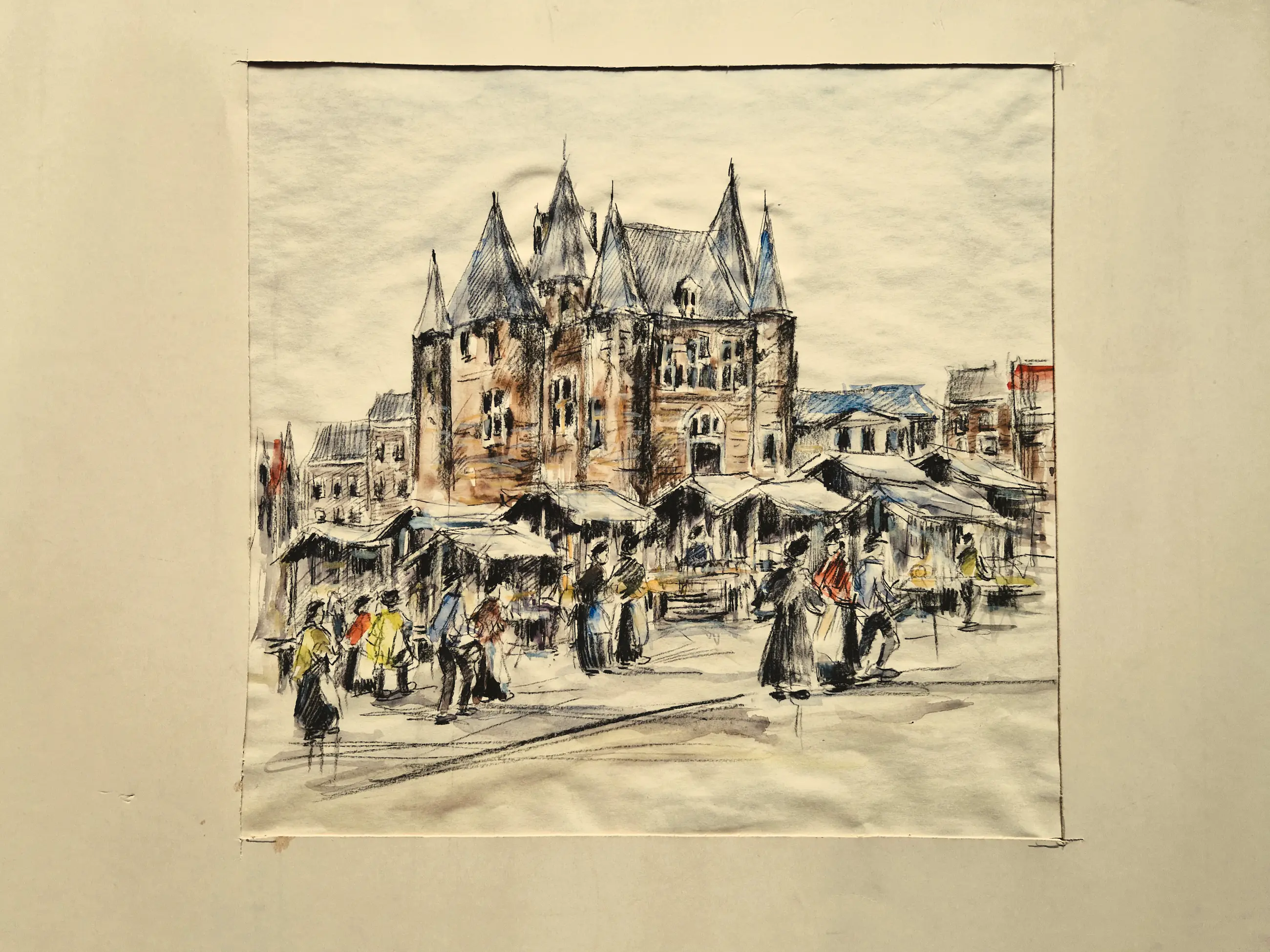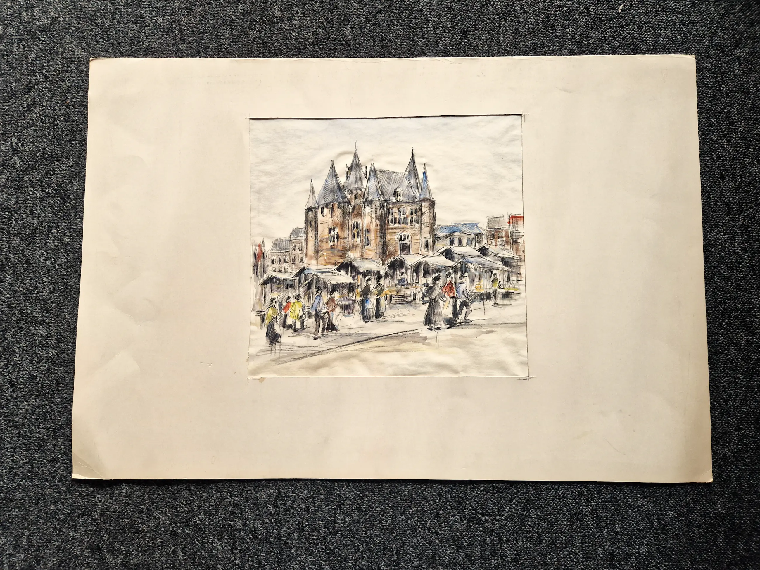 Grote, omstreeks 1950 geschilderde gemengde techniek (aquarel, pastel, inkt) op papier. Leuke expressionistische voorstelling "Amsterdam - markt bij de Waag". Niet gesigneerd - in passe partout. Bladmaat 45x55cm (HxB). Verkeert in goede conditie.