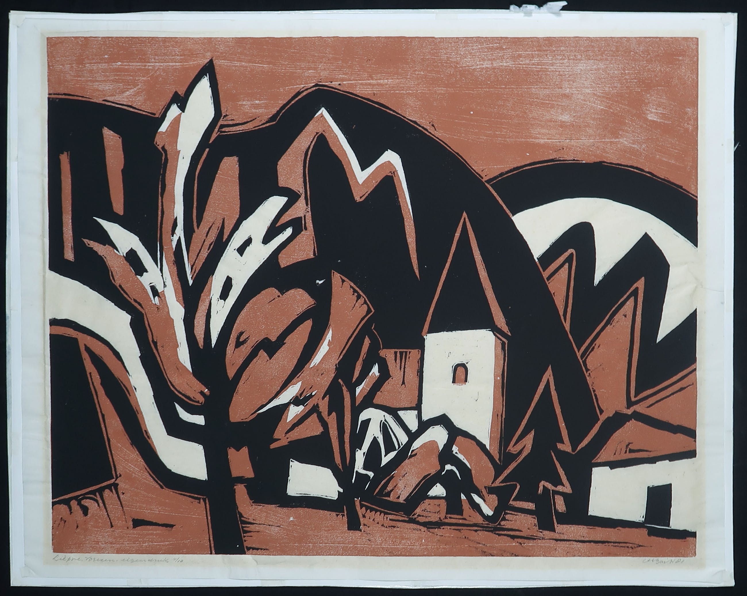 | Het werk heeft in het midden een beshadigin in het papier, waardoor het onderblad zichtbaar is. | |||
