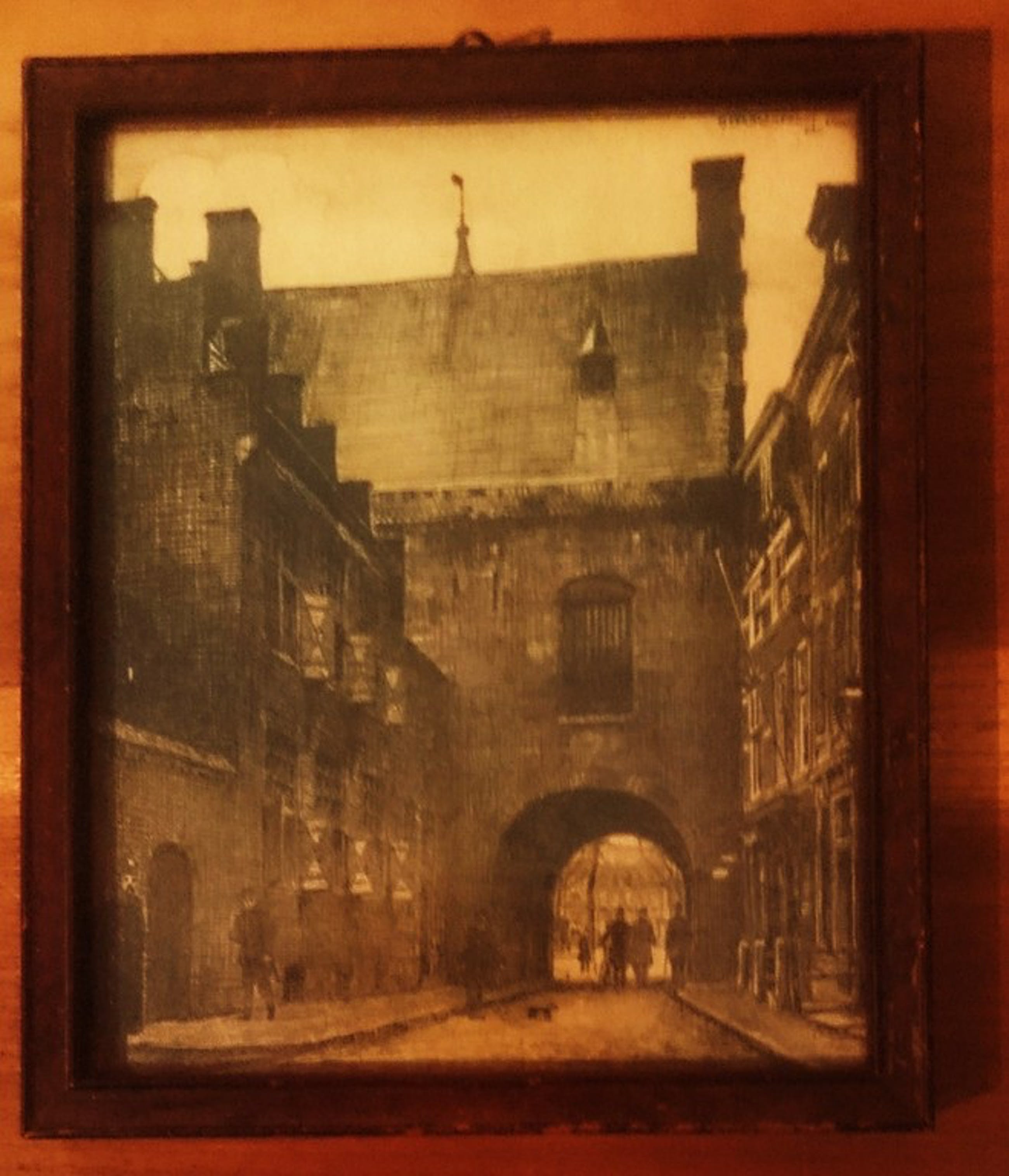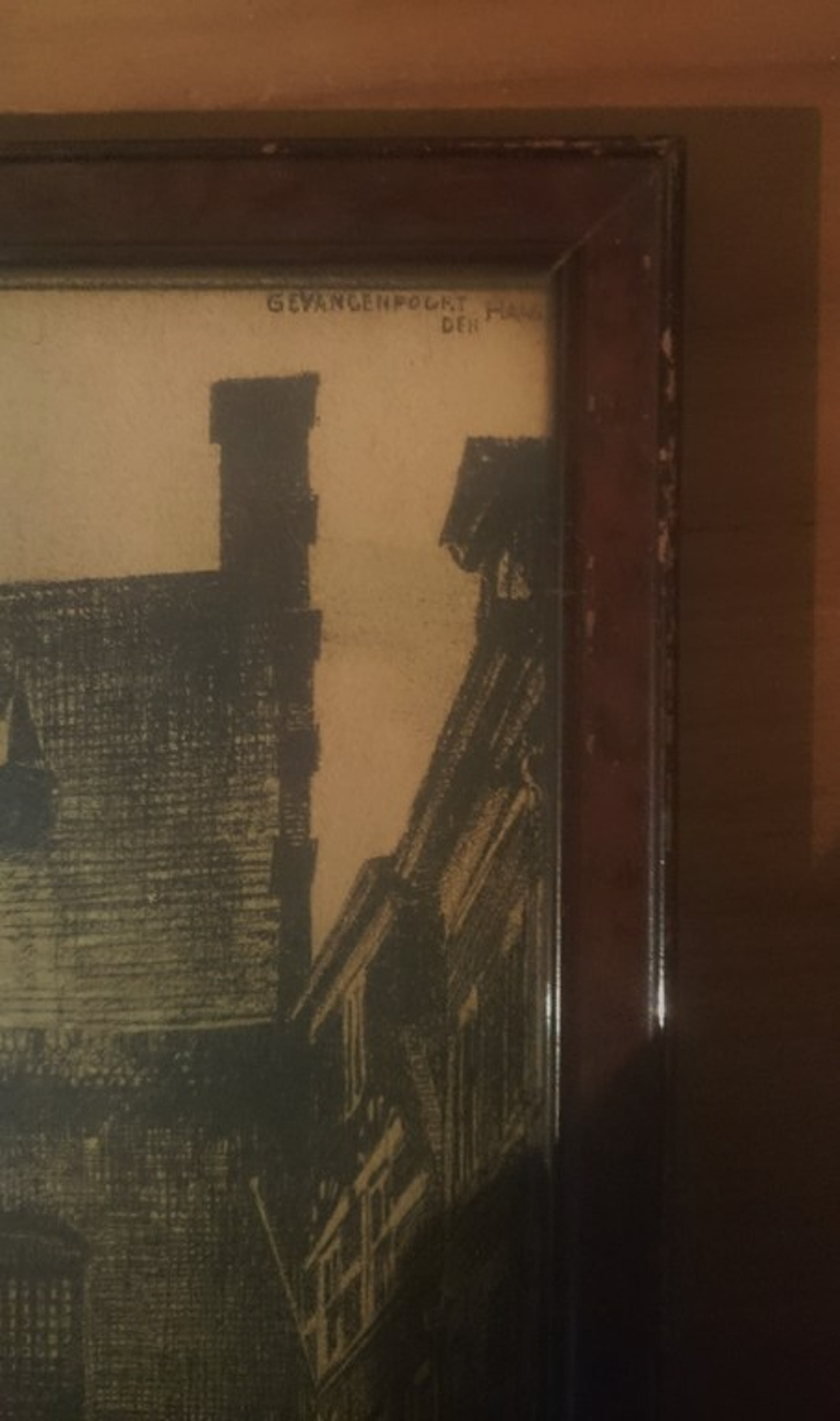 Kleine litho 17 x 14 cm in originele lijst van onbekende kunstenaar. In goede conditie. Niet gesigneerd. rechtsboven tekst: 'Gevangenpoort Den Haag'