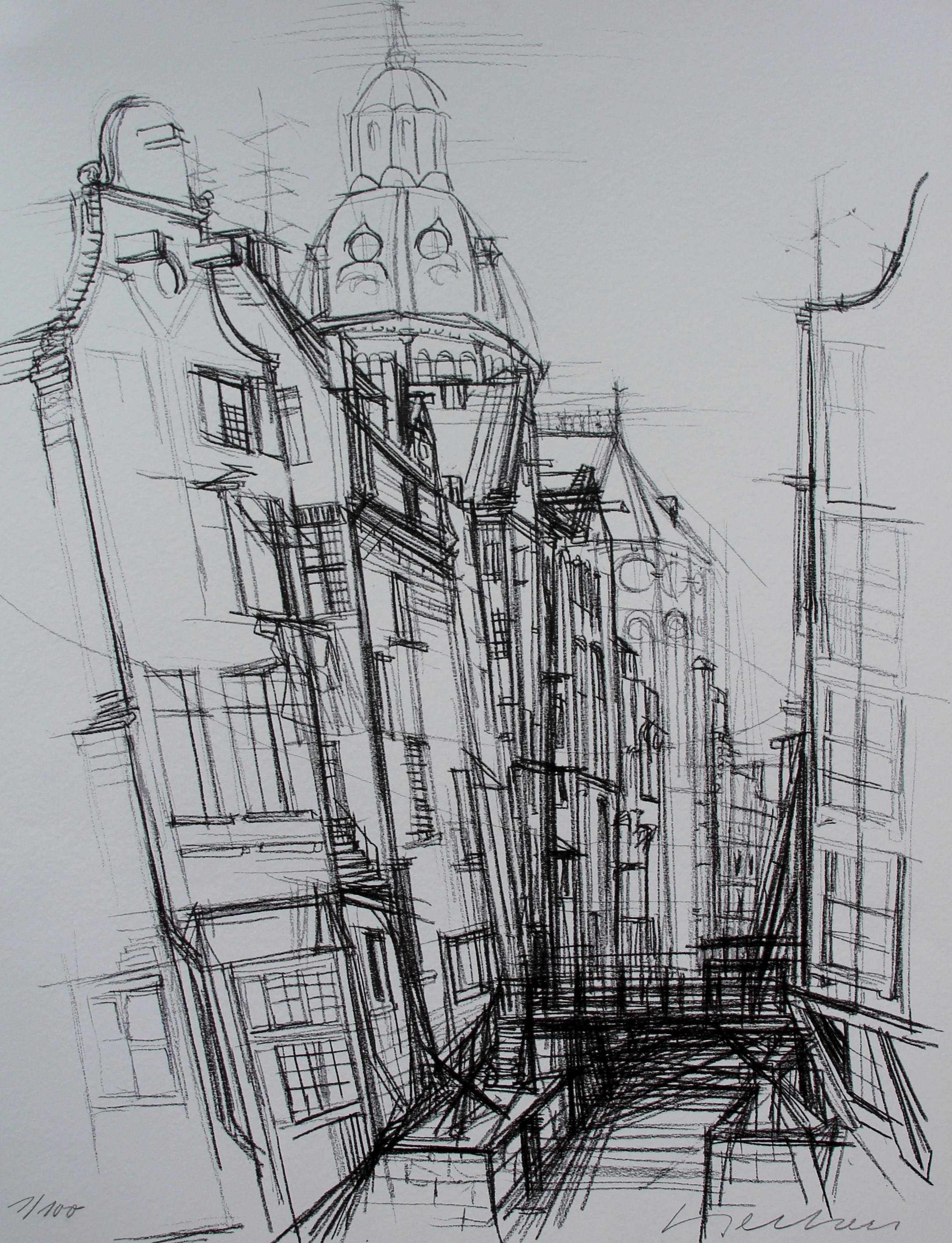 Litho van een voor mij onbekende kunstenaar. "Stadsgezicht". Afmetingen werk: H64.5 x b49 cm. Het werk is rechtsonder gesigneerd door de kunstenaar. Nummer: 1/100.