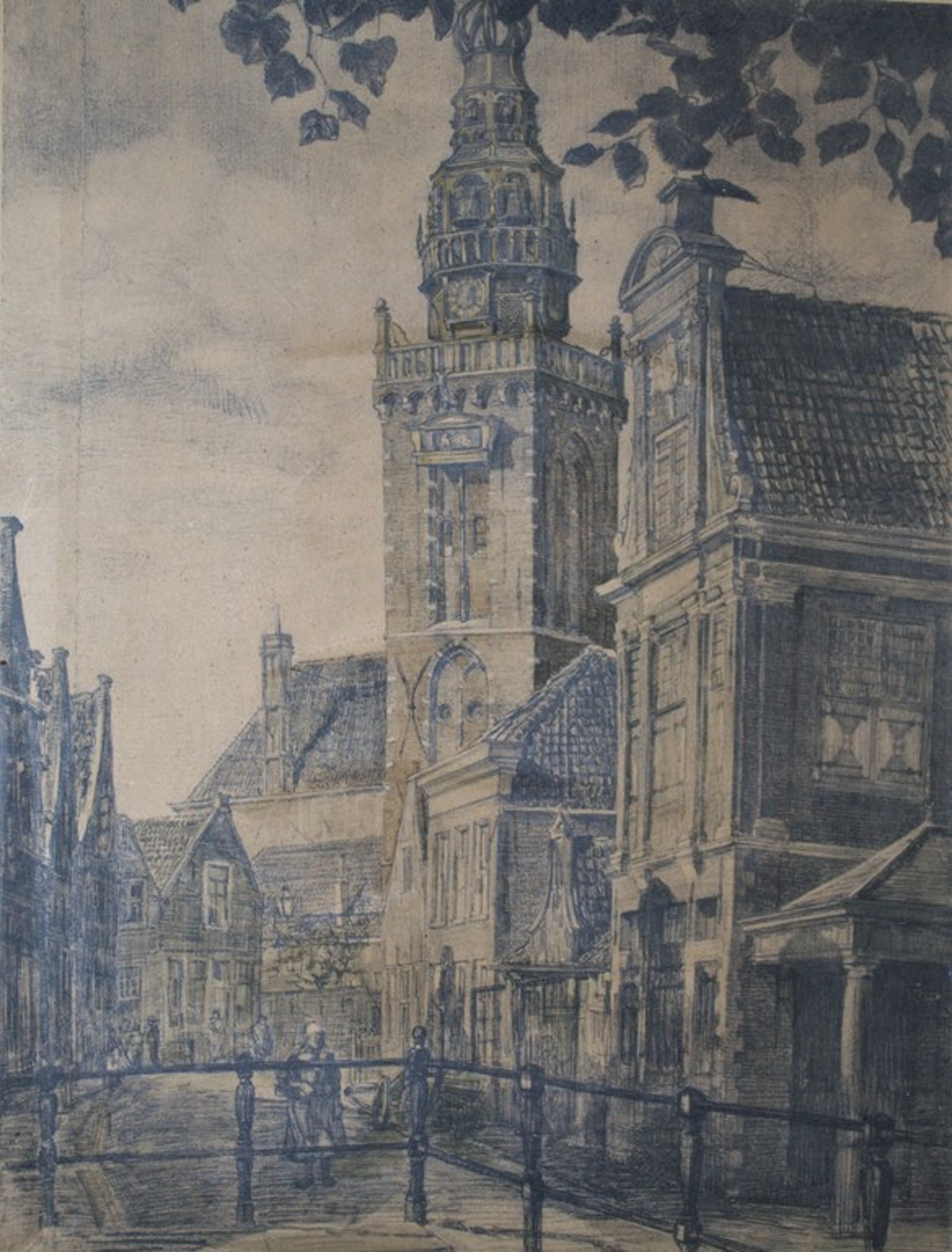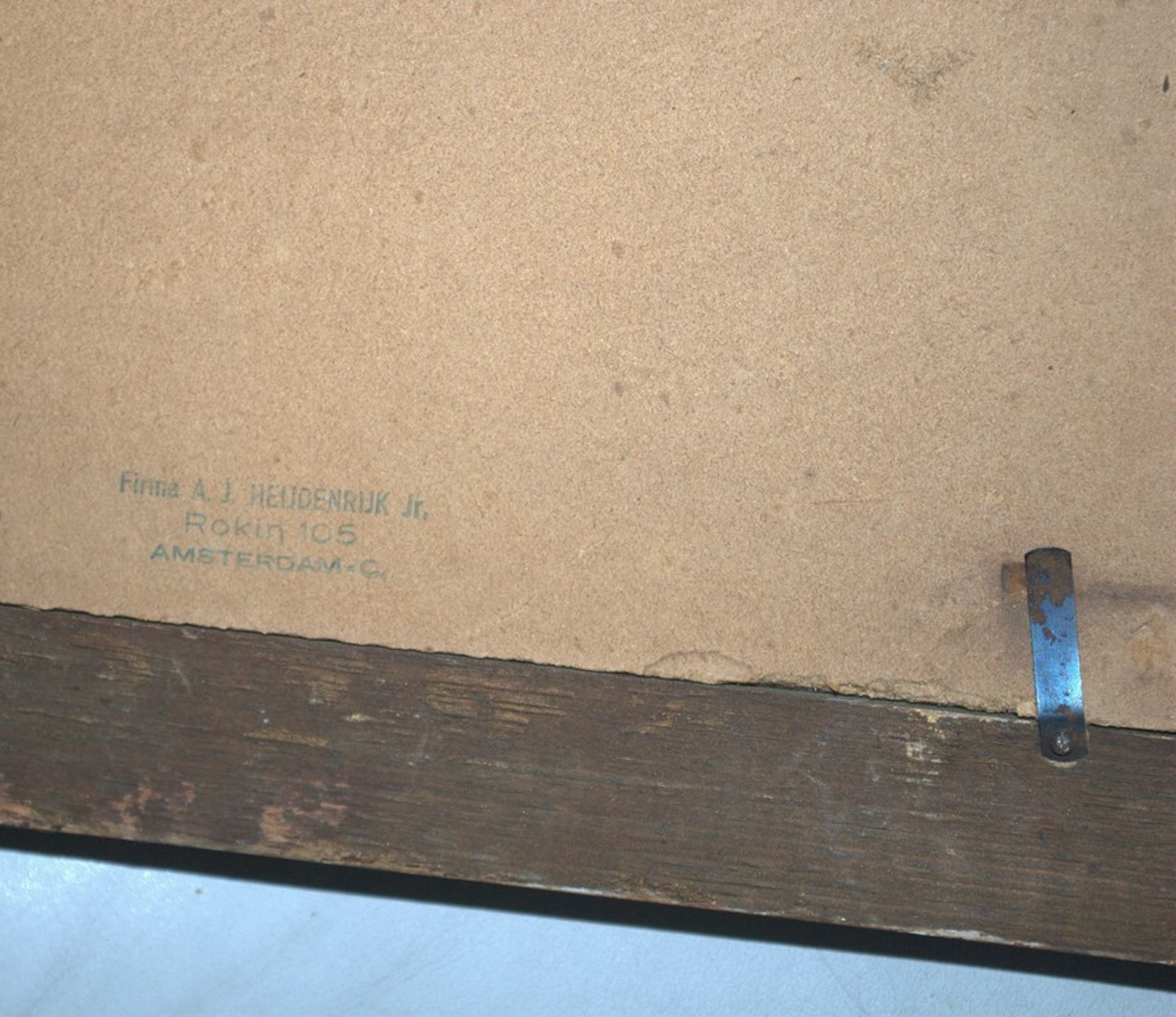 Achter glas, in een lijst van de fa. Heijdenrijk,schade aan onderste ornament, verder in goede staat, 40x31 cm.