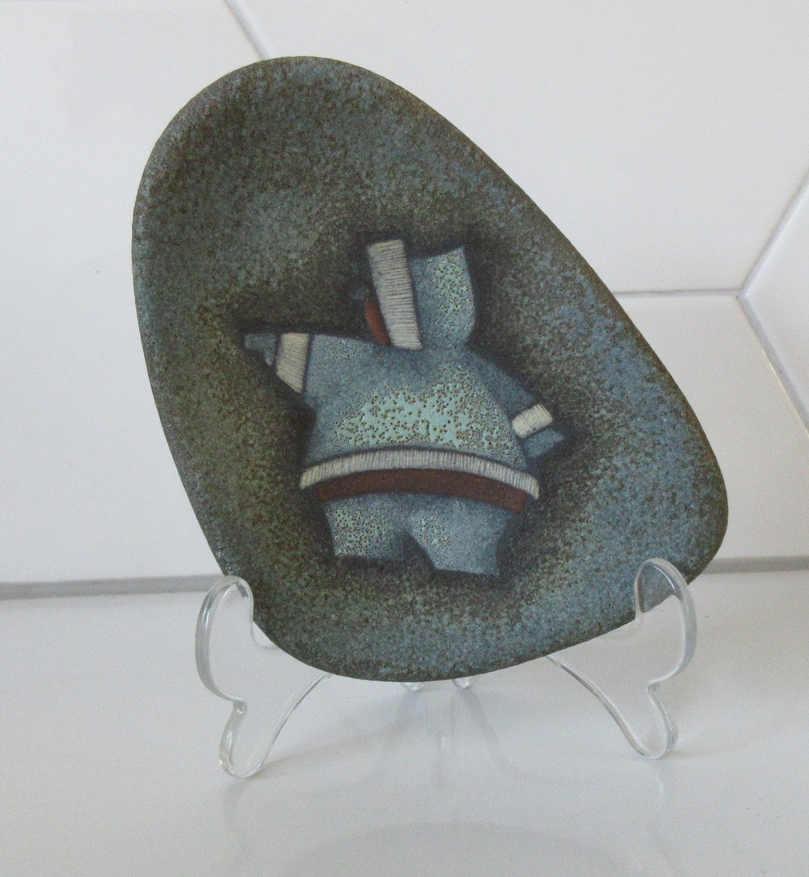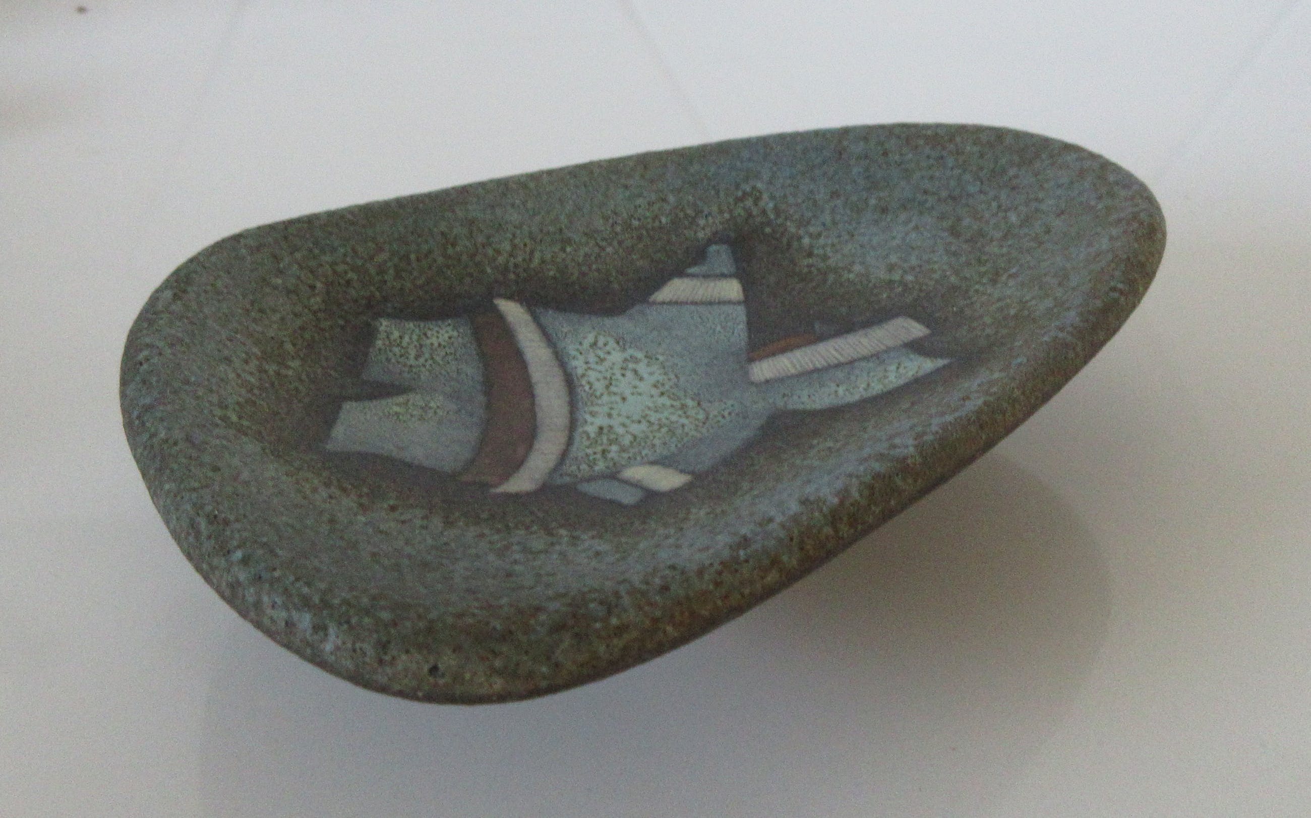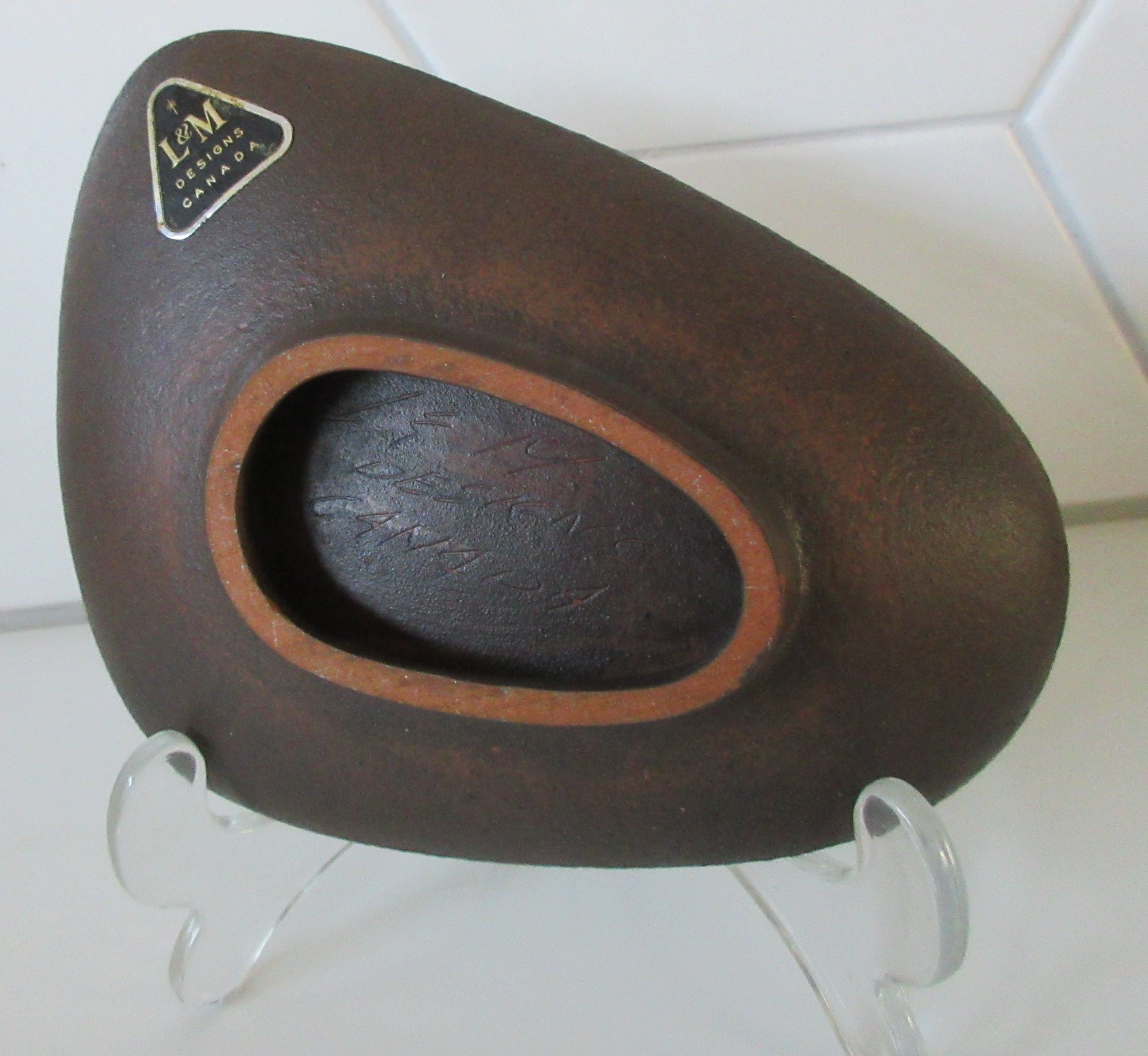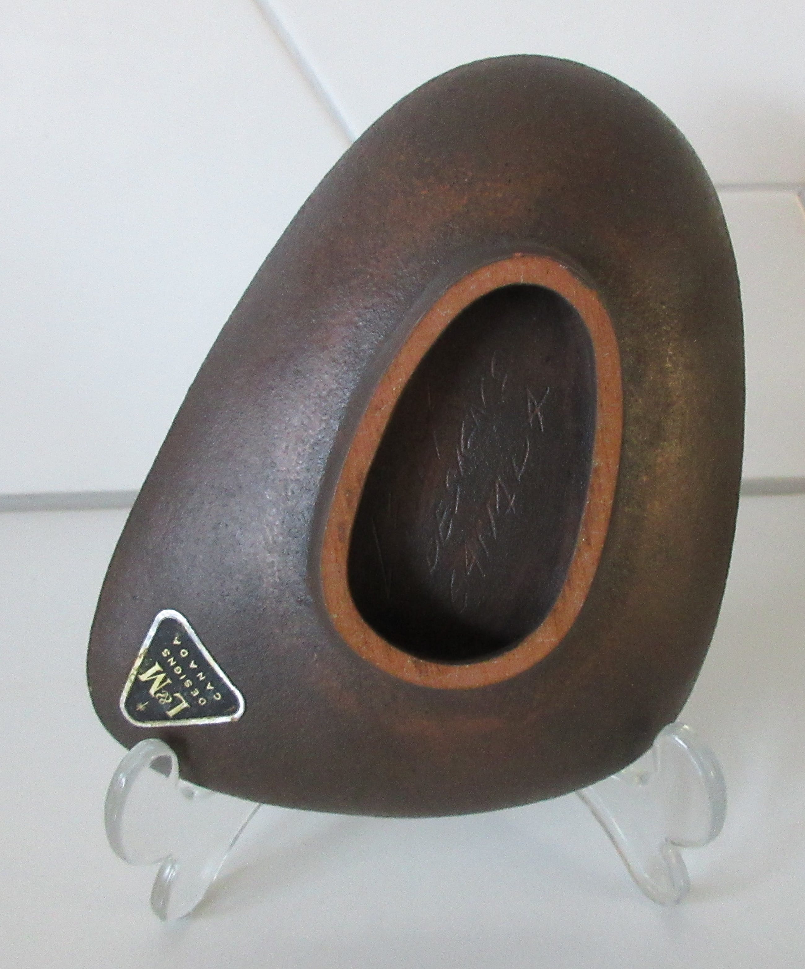 L&M Designs Canada Studio aardewerken asbak met de afbeelding van een Inuit op de voorzijde. L&M staat voor Luba en Mile Linhart emigranten van uit Tsjechoslowakijke naar Canada die in Lindsay en Gelert Ontario een Potterie opzette. Aan de onderzijde gesigneerd en voorzien van een merksticker.