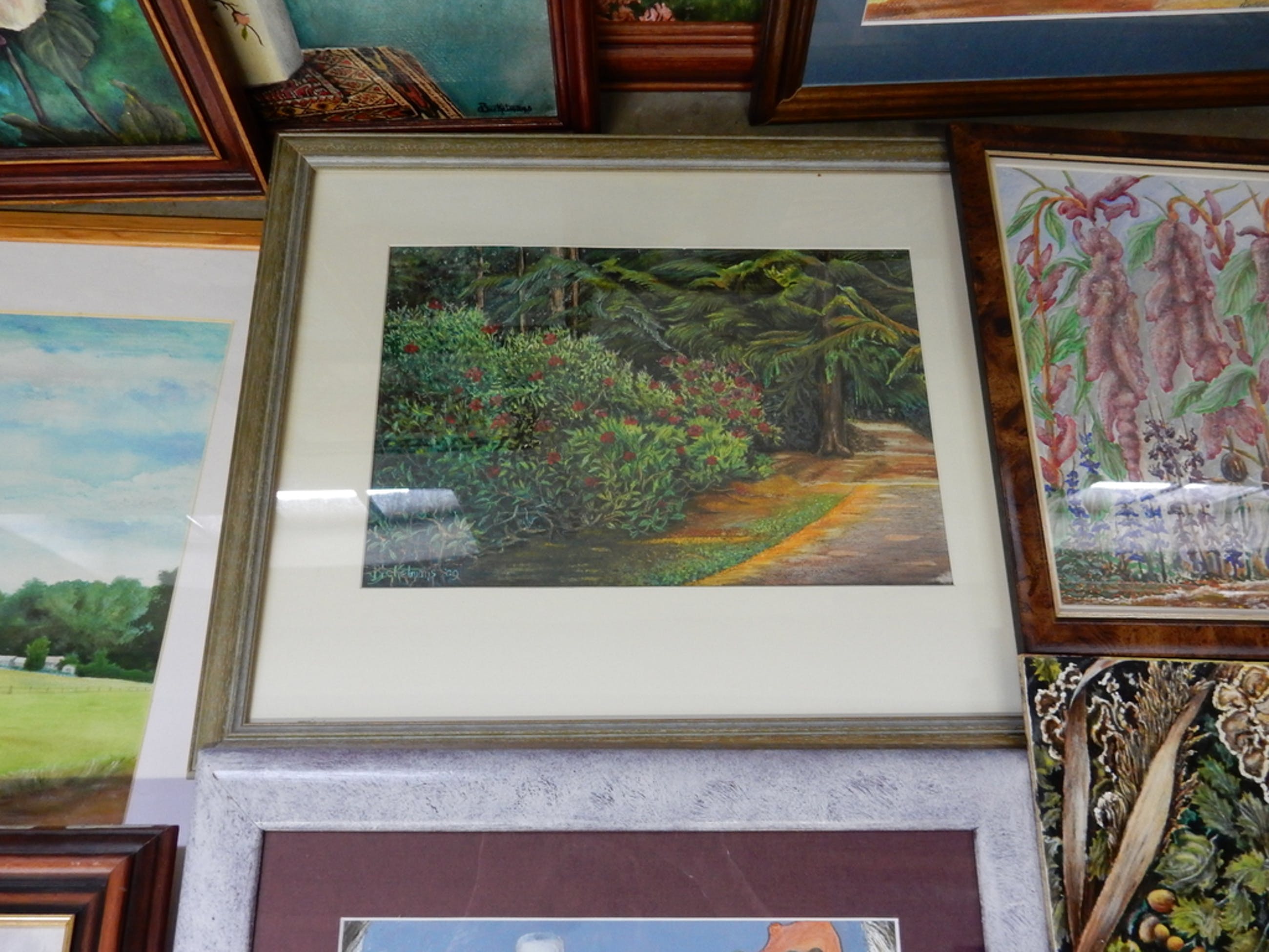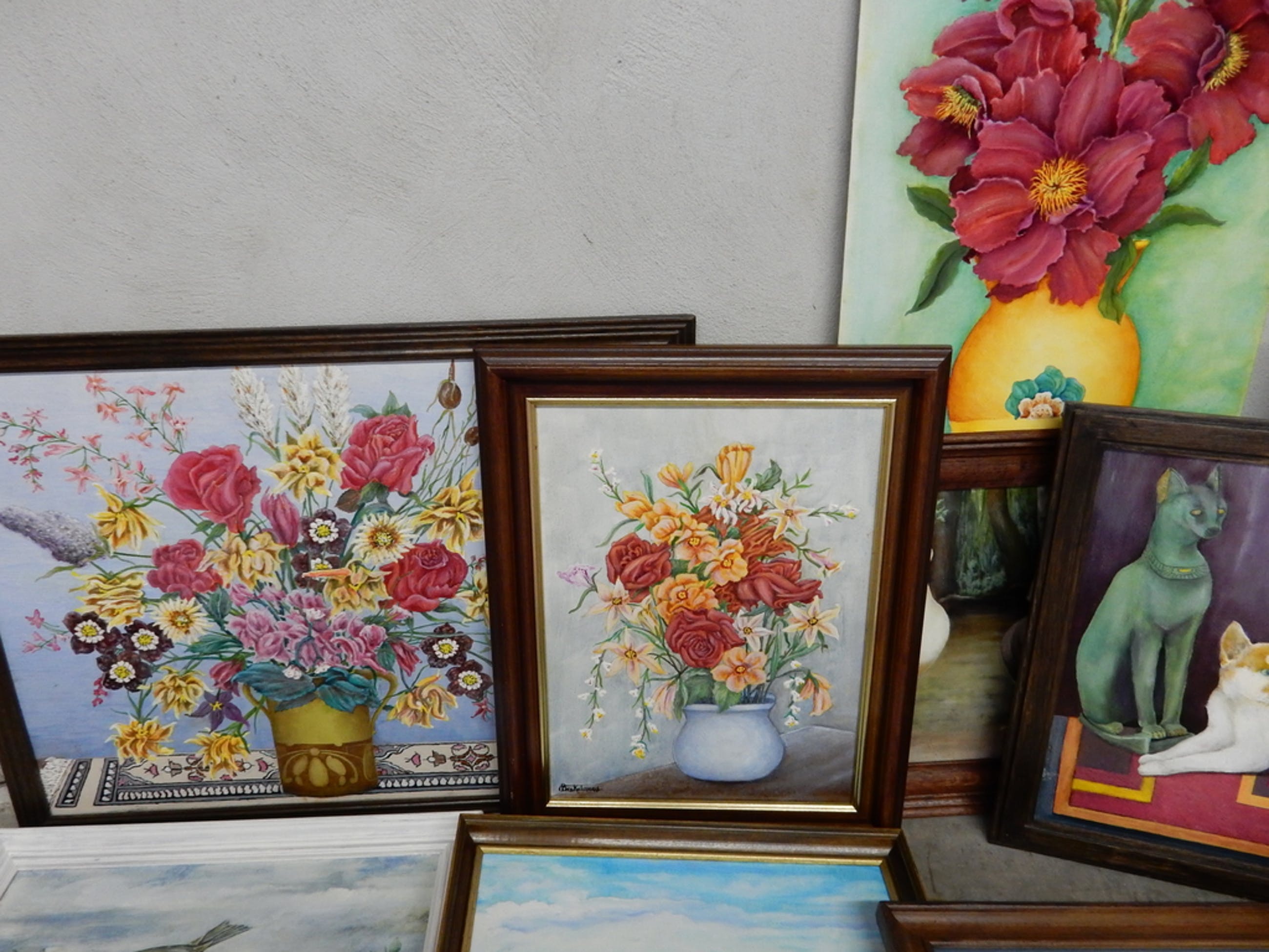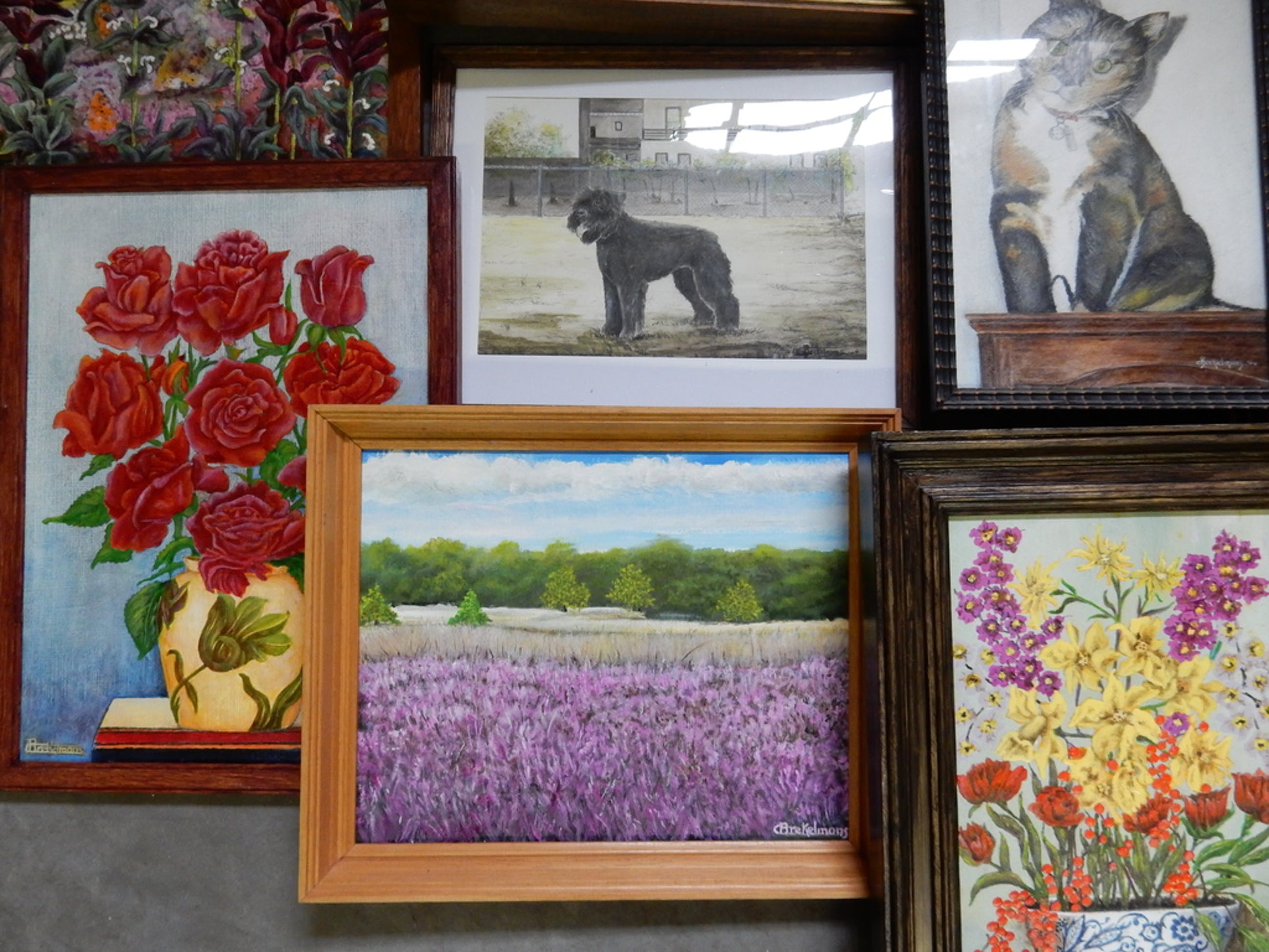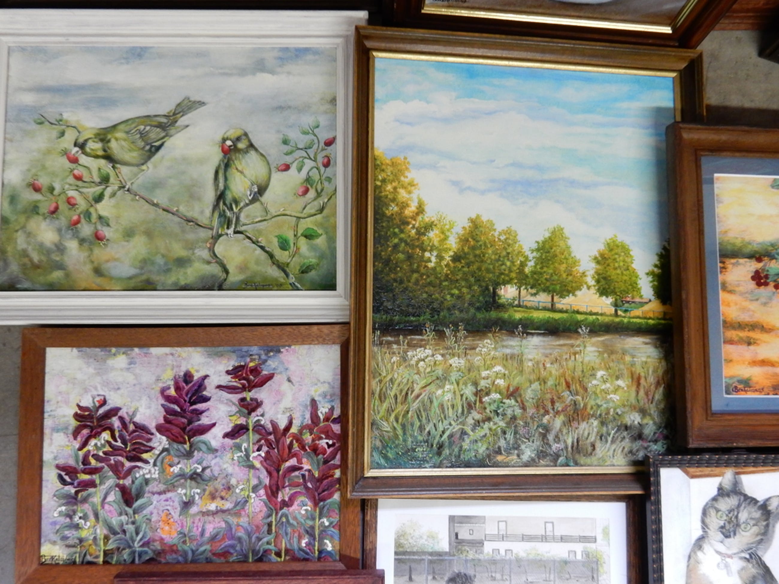 Lot van 33 ingelijste werken, heel veel werk op papier (gelijst achter glas) en ook veel olieverf.