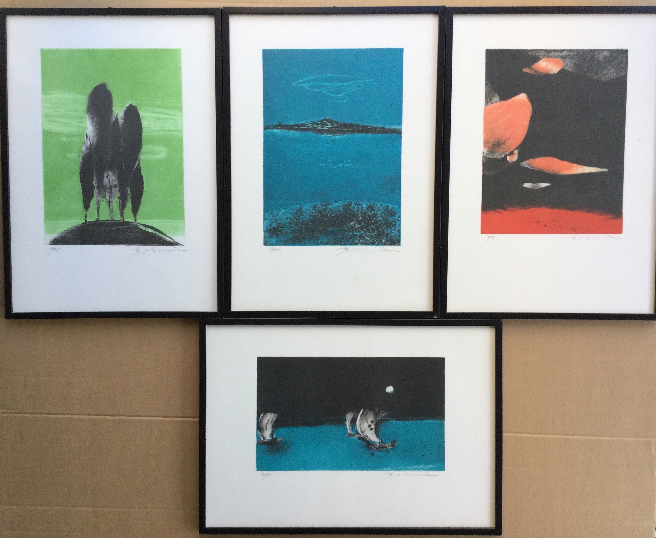 Serie van 4 gekleurde etsen van (voor mij) onbekende kunstenaar. Signatuur is op de foto's te zien. Alle werken hebben dezelfde oplage: 16/25