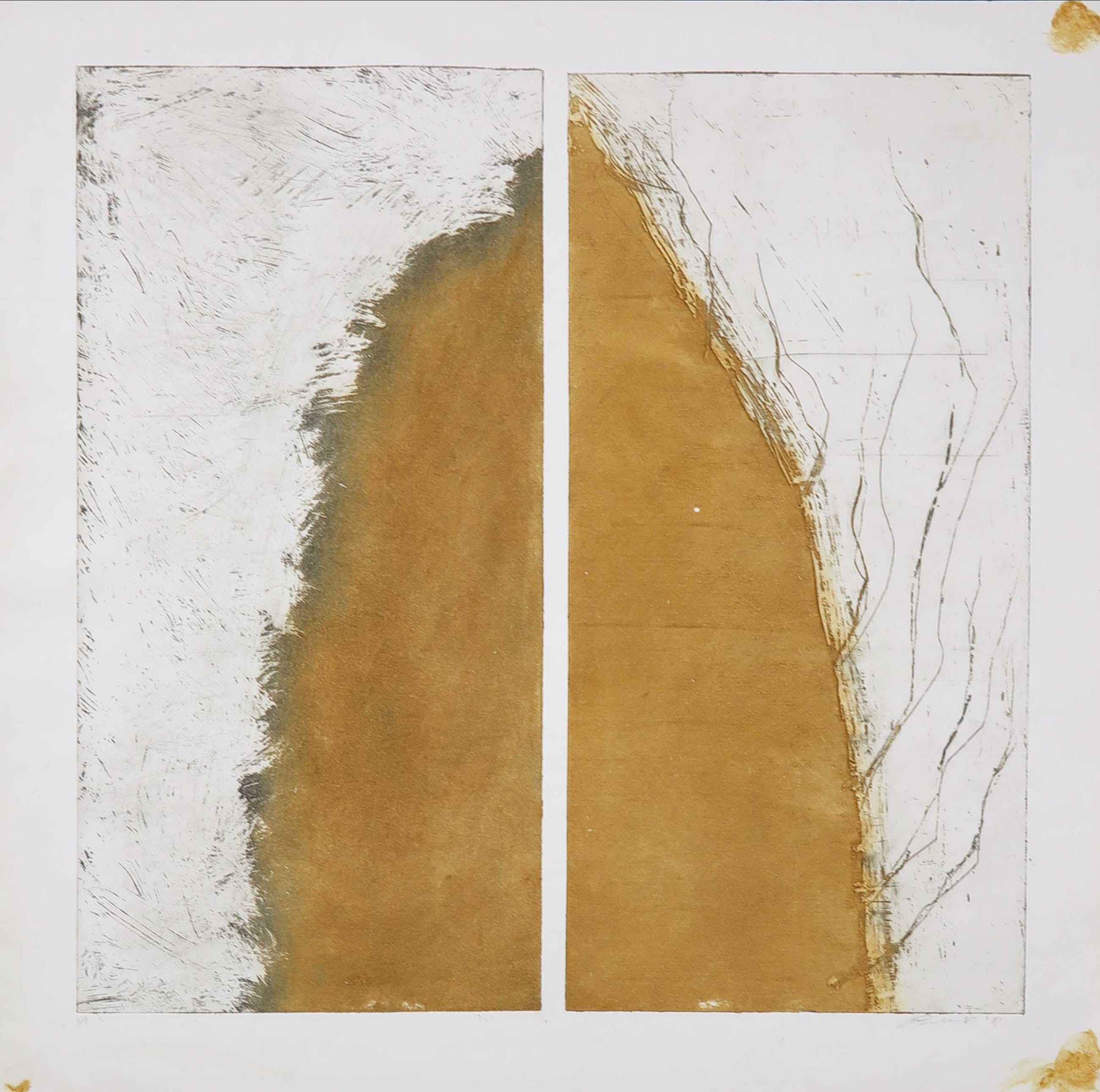 Dit lot bevat drie etsen waarvan één ets (met zwart) de afmeting heeft van (hxb) 46 x 58,5cm. De andere ets (met oranje) heeft een afmeting van 45,5 x 46cm (hxb) en de laatste ets (met bruin) 46x46,5cm (hxb).