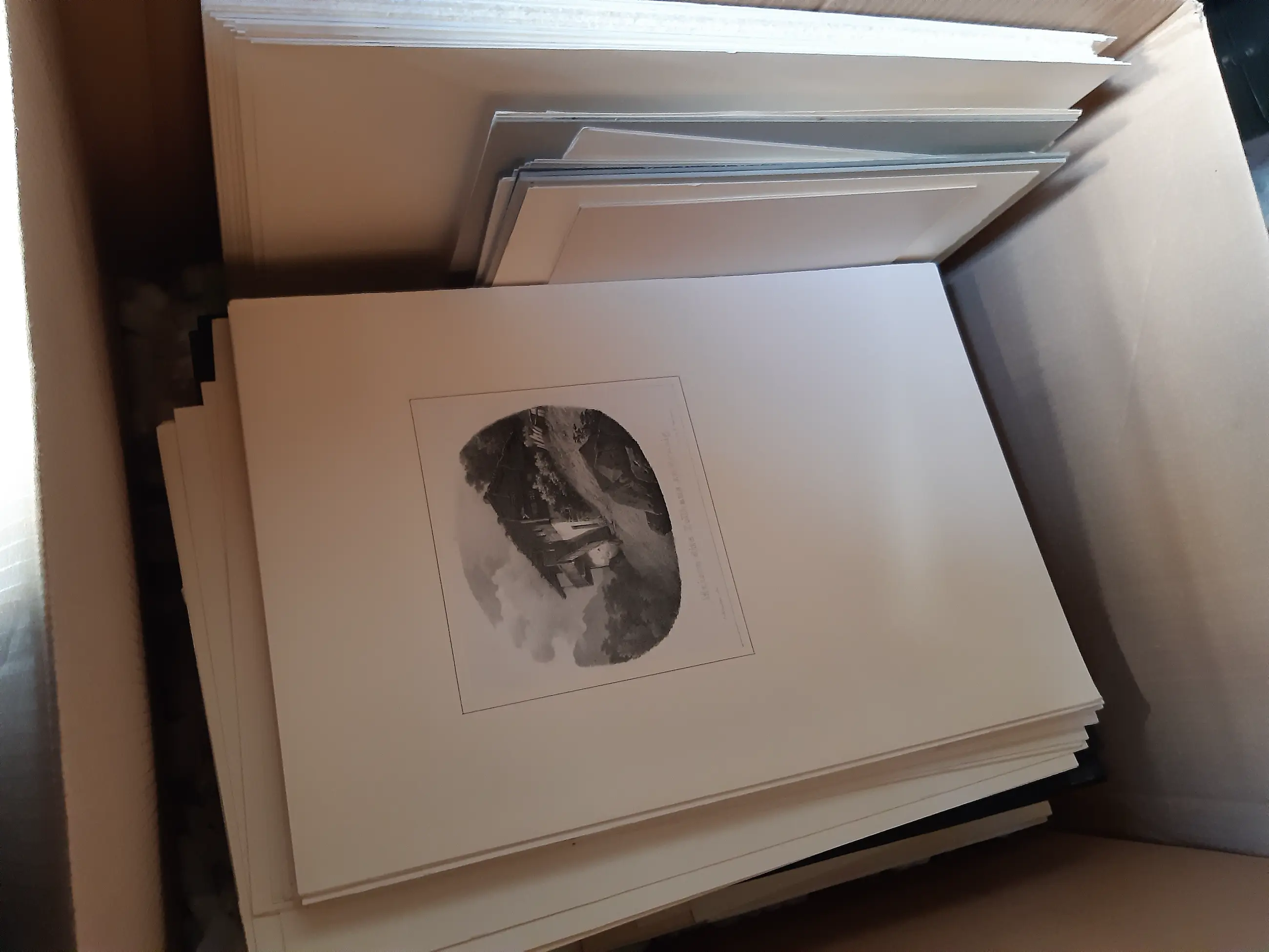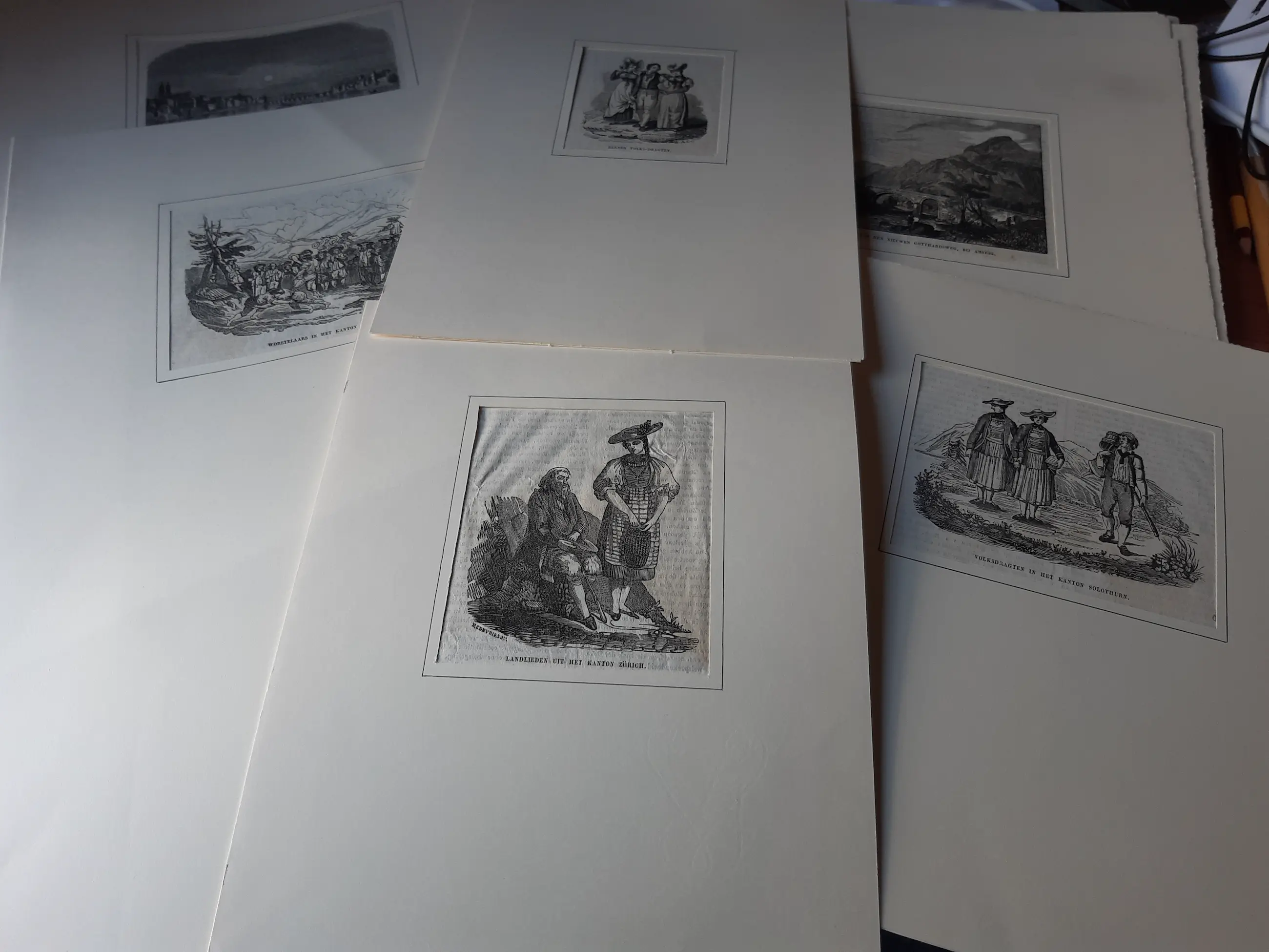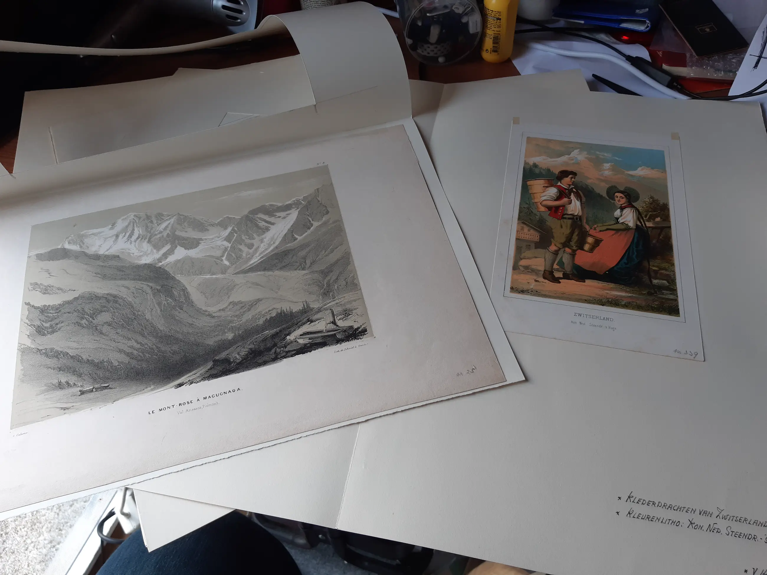 Een unieke verzameling prenten waarvan het grootste gedeelte 19e eeuw. Voor de liefhebber die van een uitzoekklusje houd. Veelal (handgekleurde) litho's en gravures en een enkele handgesigneerde ets. Een deel komt uit oude tijdschriften, boeken en kranten, een ander deel zijn losse afbeeldingen waarop - naar mijn idee - vaak een prijs tussen de 20 en 35 gulden staat. Elke prent is netjes in een papieren 'passepartout' bewaard. Op de prenten staan vooral (berg)landschappen, tafereeltjes en wat bijbelse voorstellingen. De maten variëren van ongeveer aanzichtkaartformaat tot ongeveer A3.