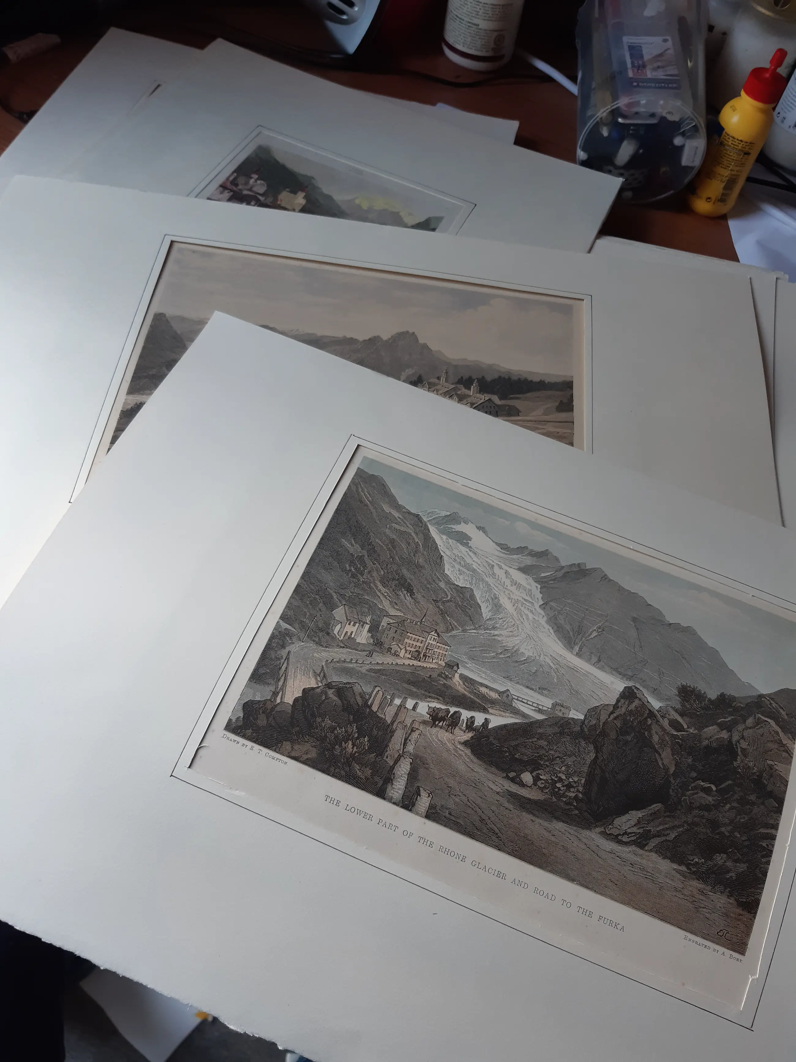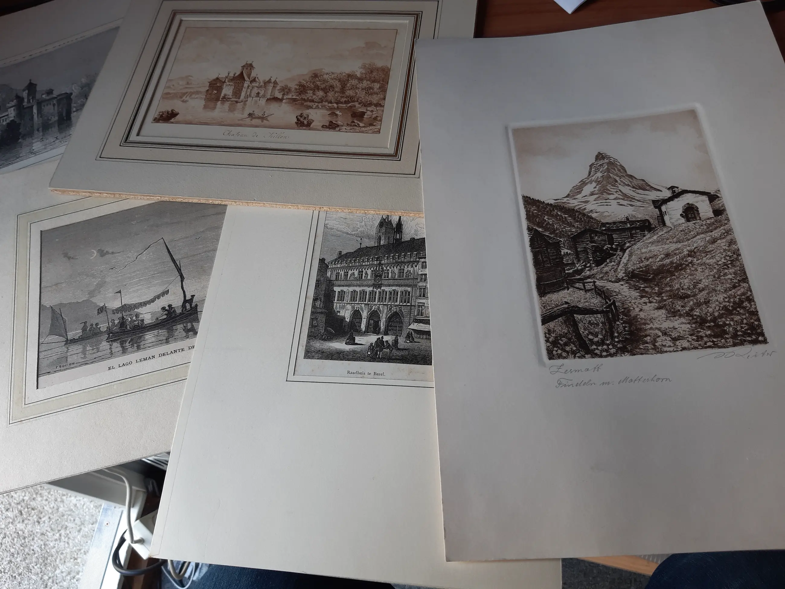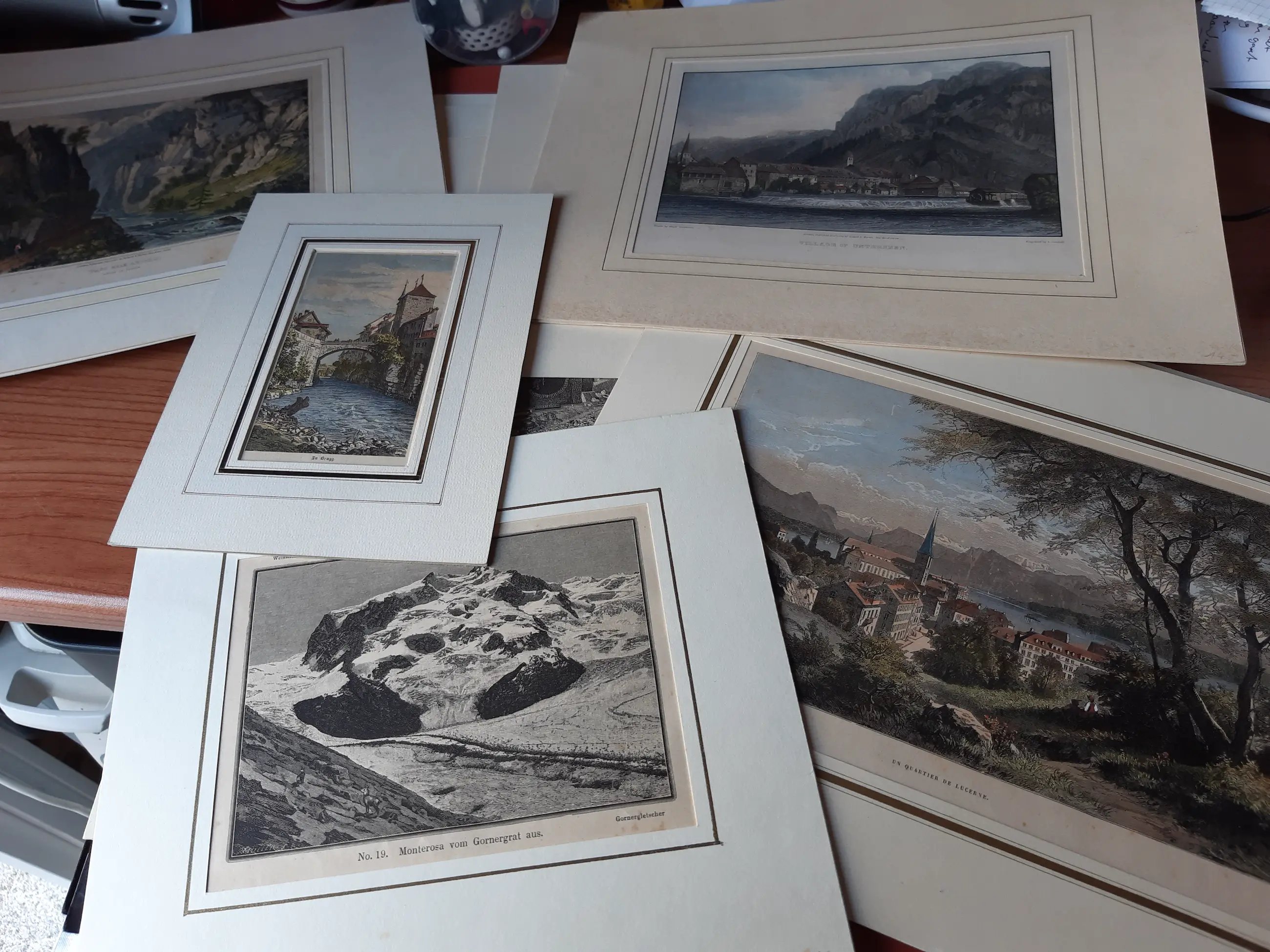 Een unieke verzameling prenten waarvan het grootste gedeelte 19e eeuw. Voor de liefhebber die van een uitzoekklusje houd. Veelal (handgekleurde) litho's en gravures en een enkele handgesigneerde ets. Een deel komt uit oude tijdschriften, boeken en kranten, een ander deel zijn losse afbeeldingen waarop - naar mijn idee - vaak een prijs tussen de 20 en 35 gulden staat. Elke prent is netjes in een papieren 'passepartout' bewaard. Op de prenten staan vooral (berg)landschappen, tafereeltjes en wat bijbelse voorstellingen. De maten variëren van ongeveer aanzichtkaartformaat tot ongeveer A3.