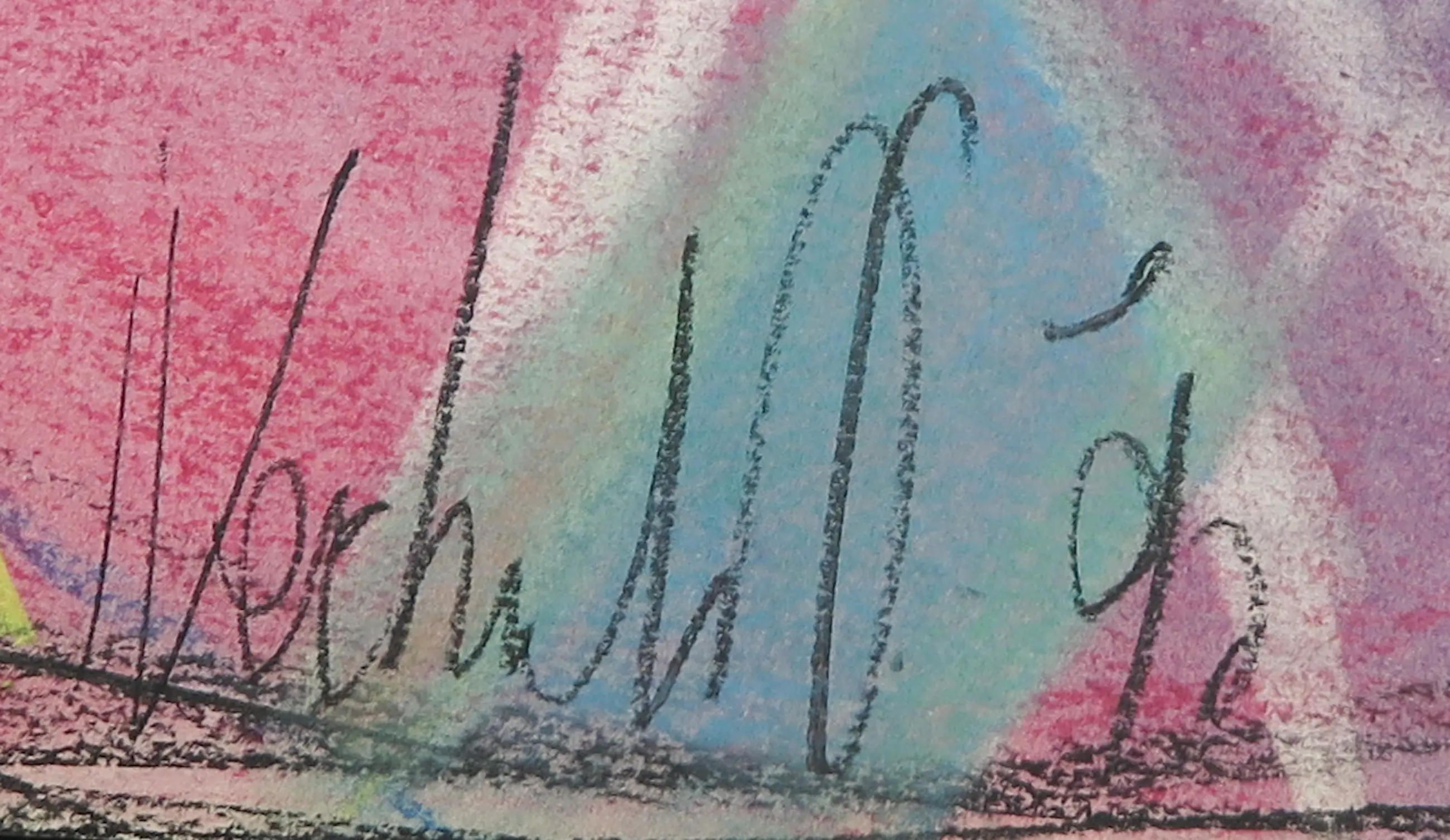| Er zit wat veegjes in de compositie als resultaat van het werken met krijt. Daarnaast lijkt er wat lichte vlekken zichtbaar, onduidelijk is of dit tot de compositie behoort of dat dit lichte vochtschade betreft. | |||||||||||