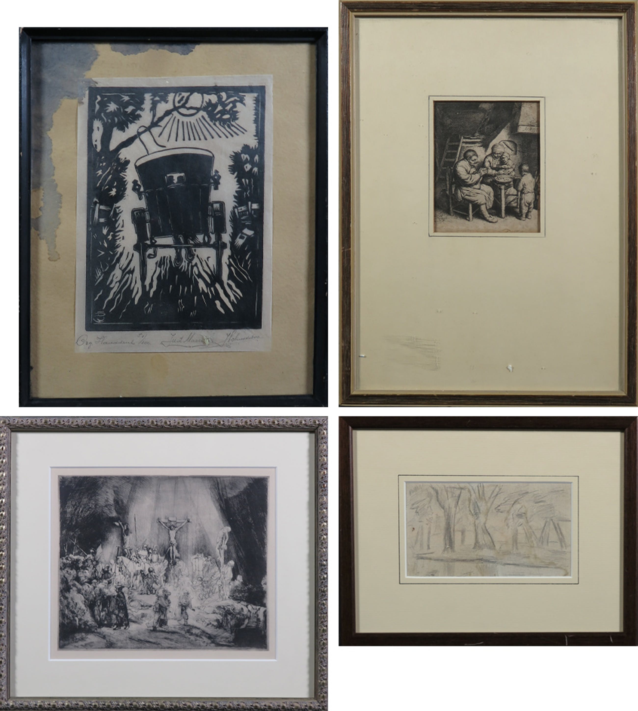 Dit lot bevat vier diverse werken van verschillende kunstenaars, waarvan de maker onbekend is. Er zit een werk in dat gemaakt is met potloodtekening, de andere werken behoren tot grafiek.