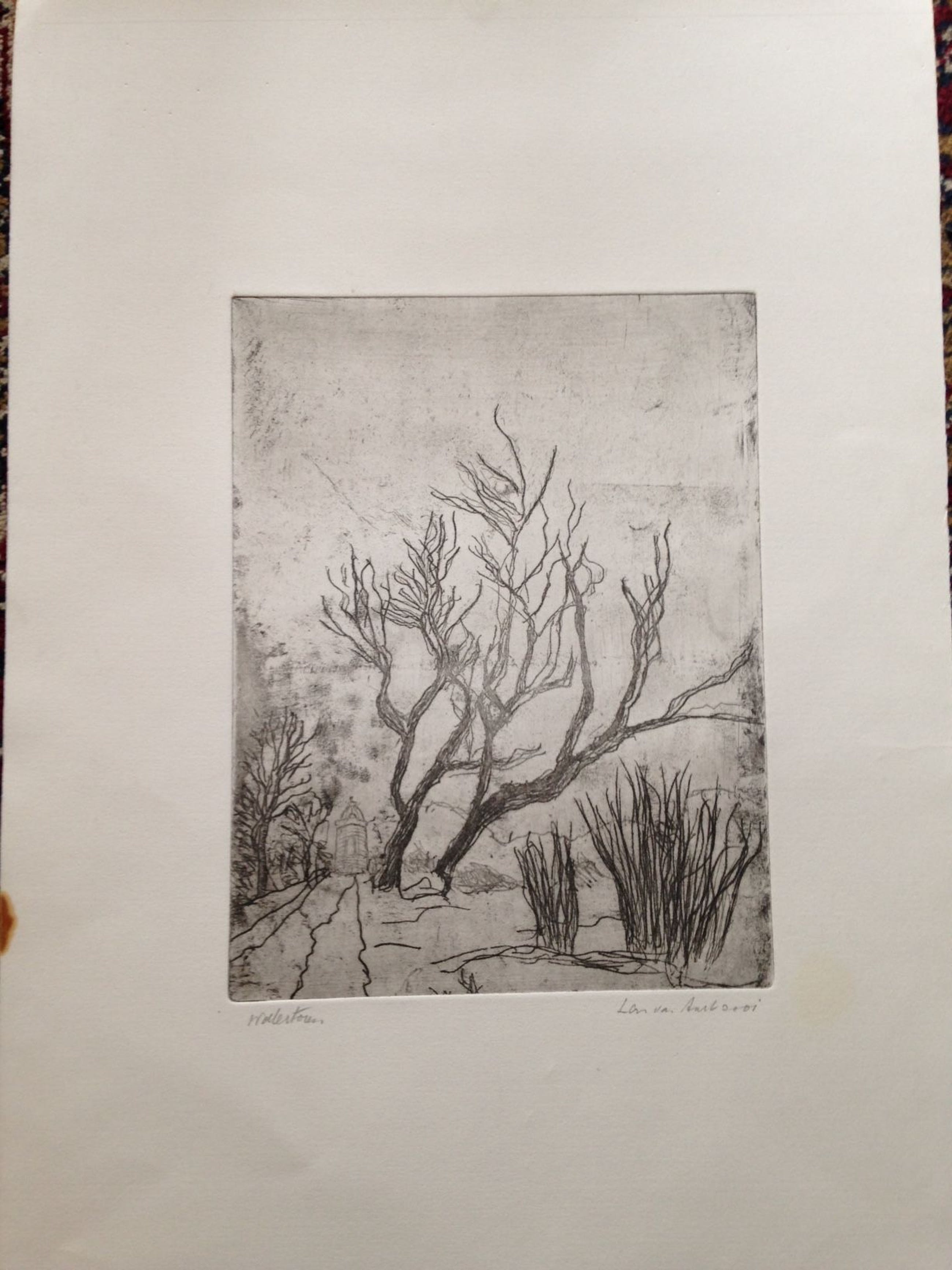 mooie, duidelijke afdruk met in de verte een Watertoren afkomstig uit map van een verzamelaar afmetingen: 35x50 (blad) en20x26 (beeld). jaar: 2001 titel linksonder: Watertoren Gesigneerd rechtsonder: Lou van Aart 2001
