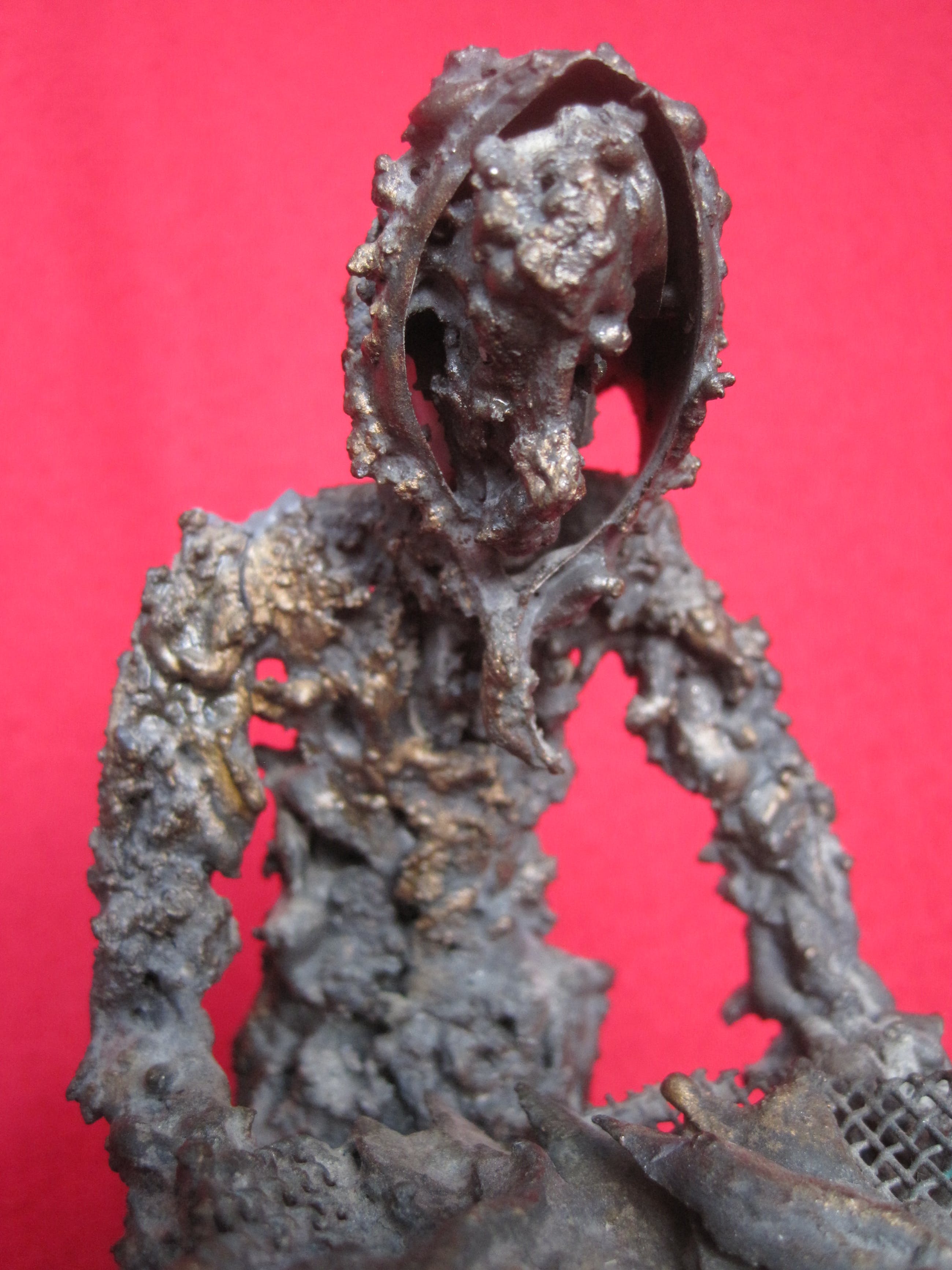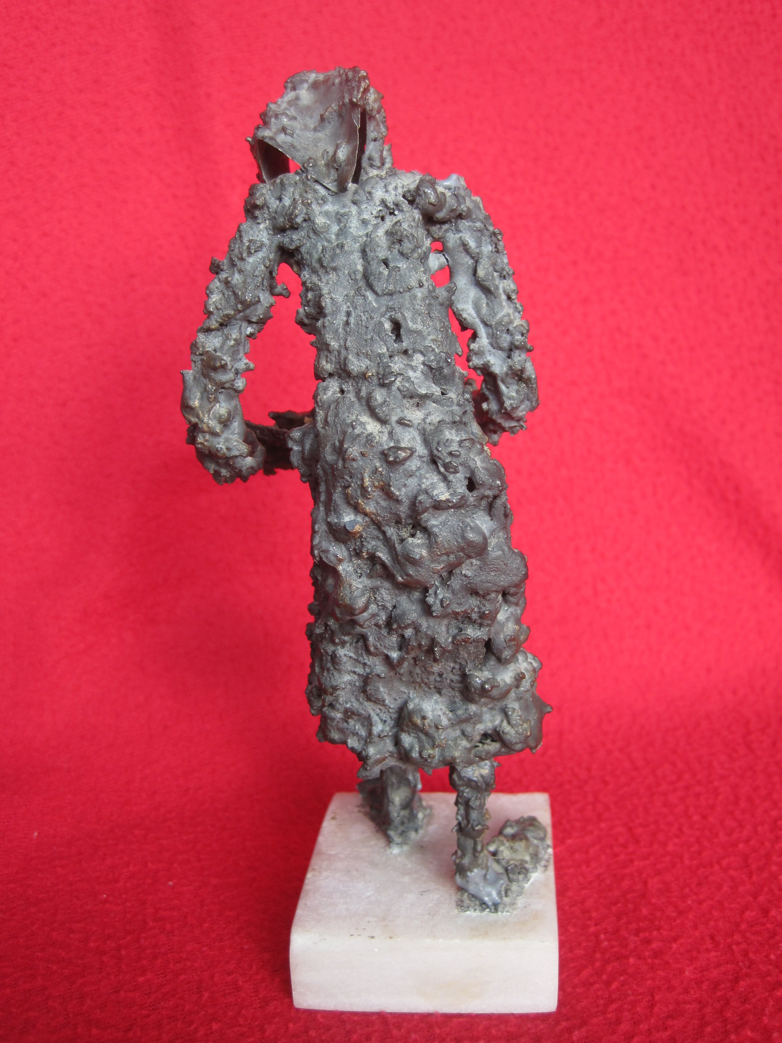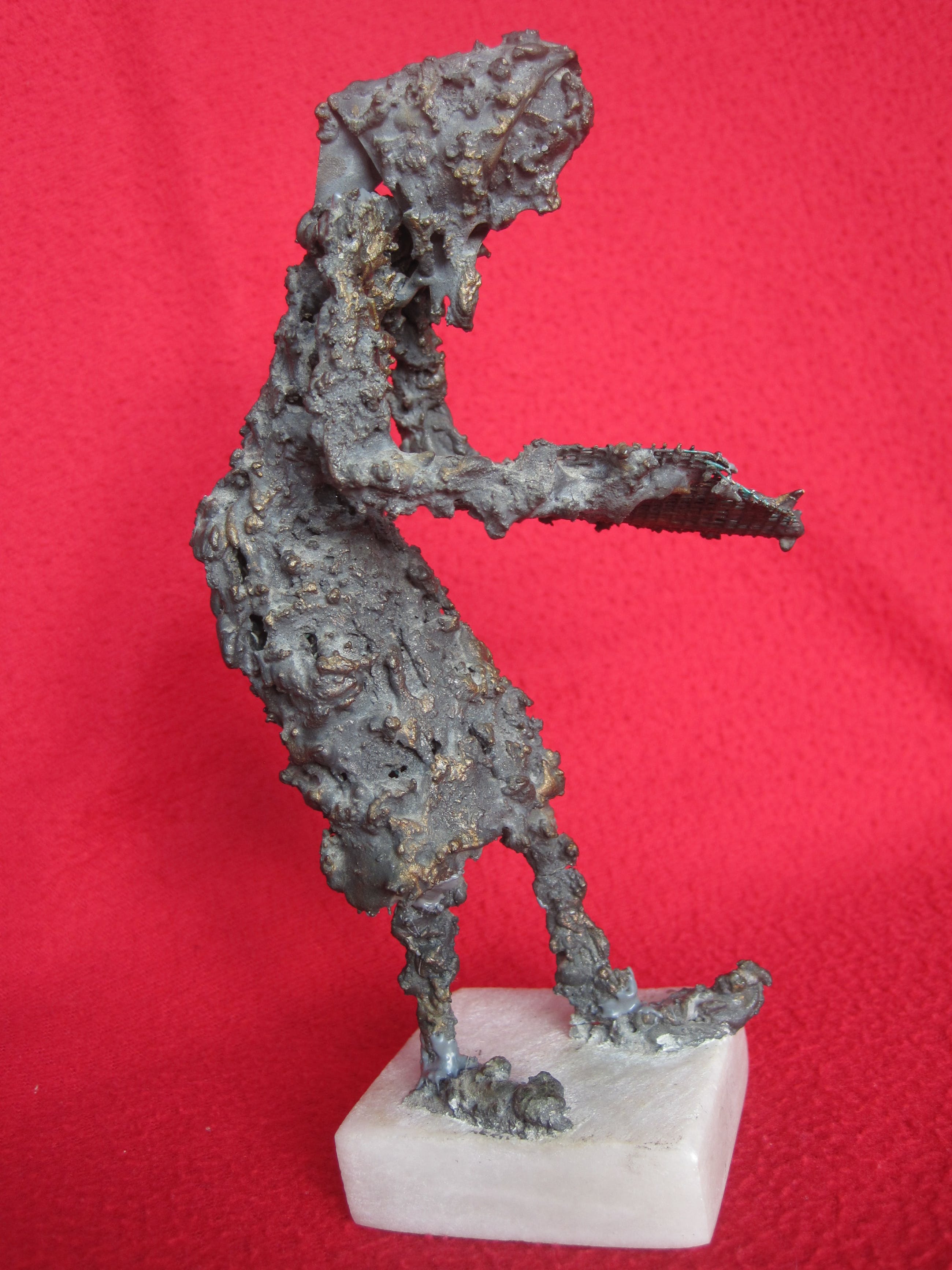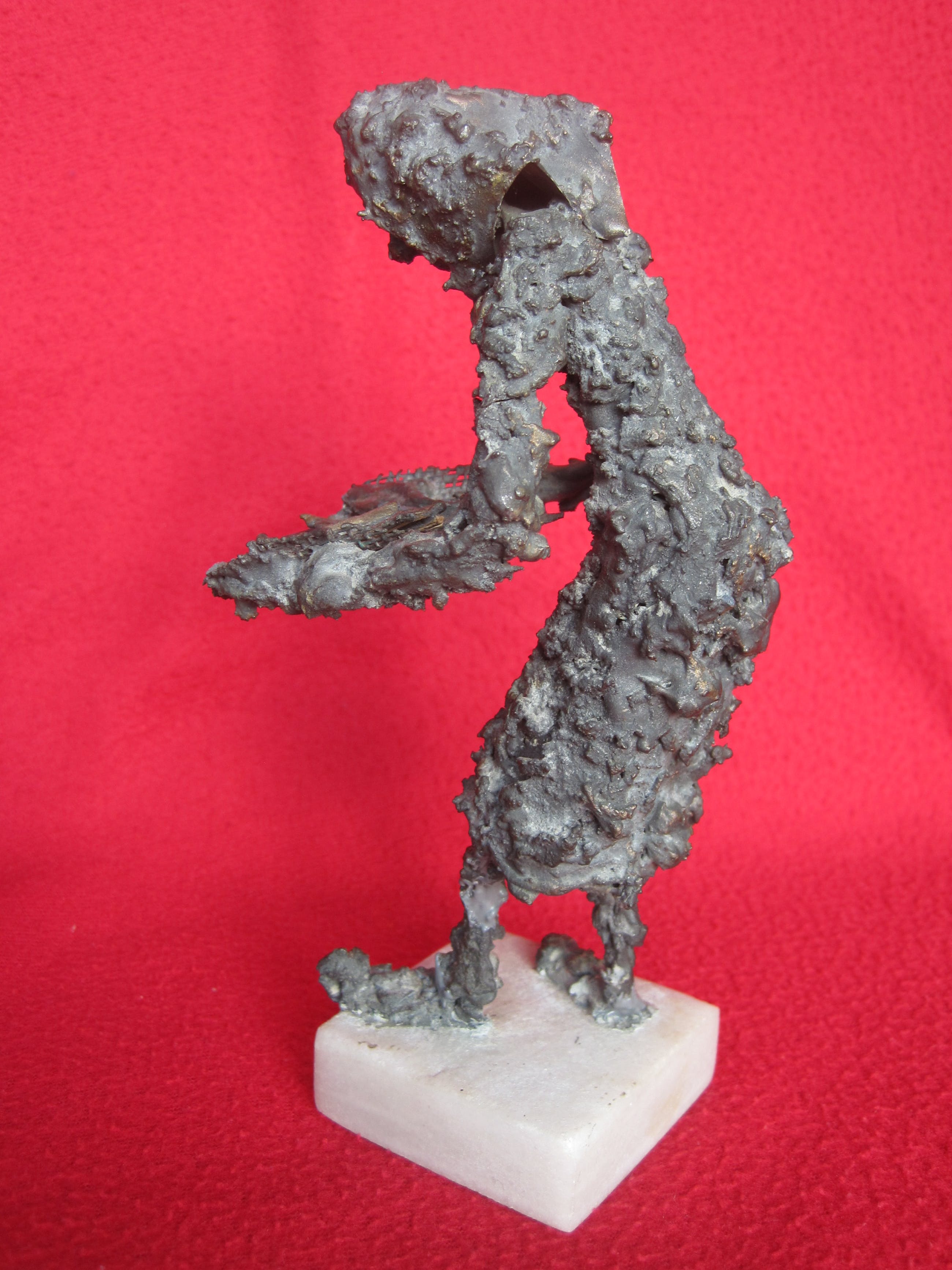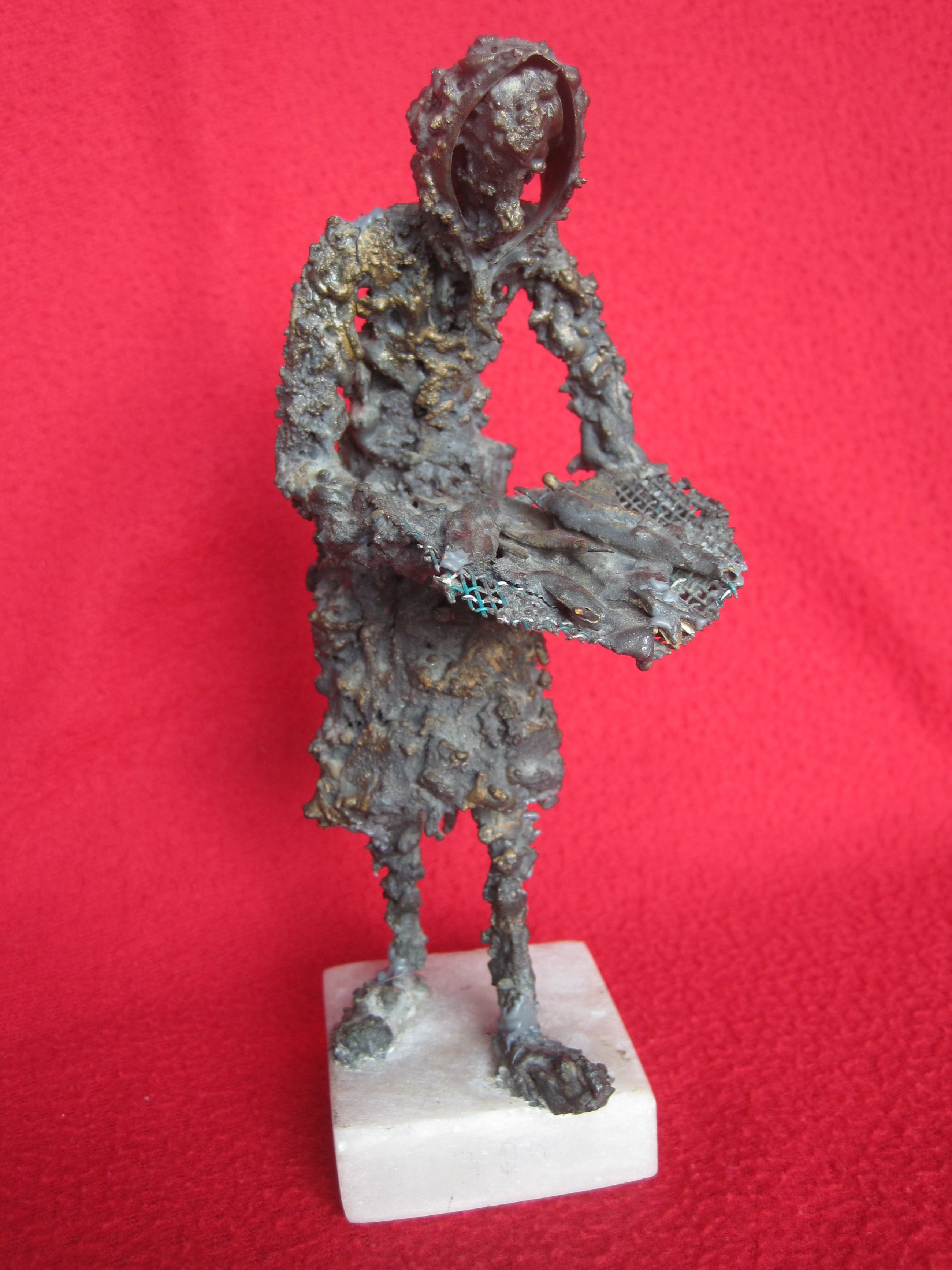 Heel apart verbronsd kunststof beeldje van een oud vrouwtje die haar vis verkoopt. De kunstenaar is mij helaas onbekend.