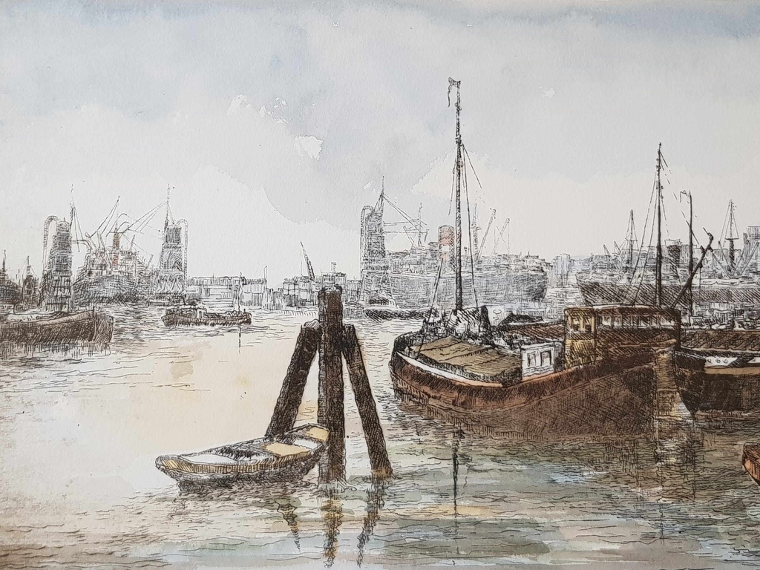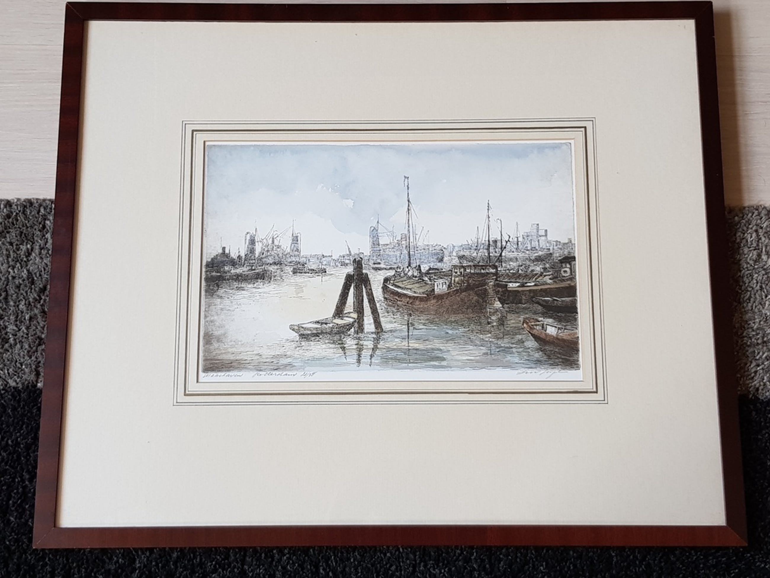 Maashaven Rotterdam, kleurenets. Gesigneerd in potlood, maar voor mij onduidelijk. Oplage: 21/58. Afm totaal: 71 x 58 cm. Beeldformaat: 40 x 26 cm. Inclusief: ophangmogelijkheid, glasplaat en houten lijst. Met verzenden wordt het extra goed ingepakt, ivm glasplaat.