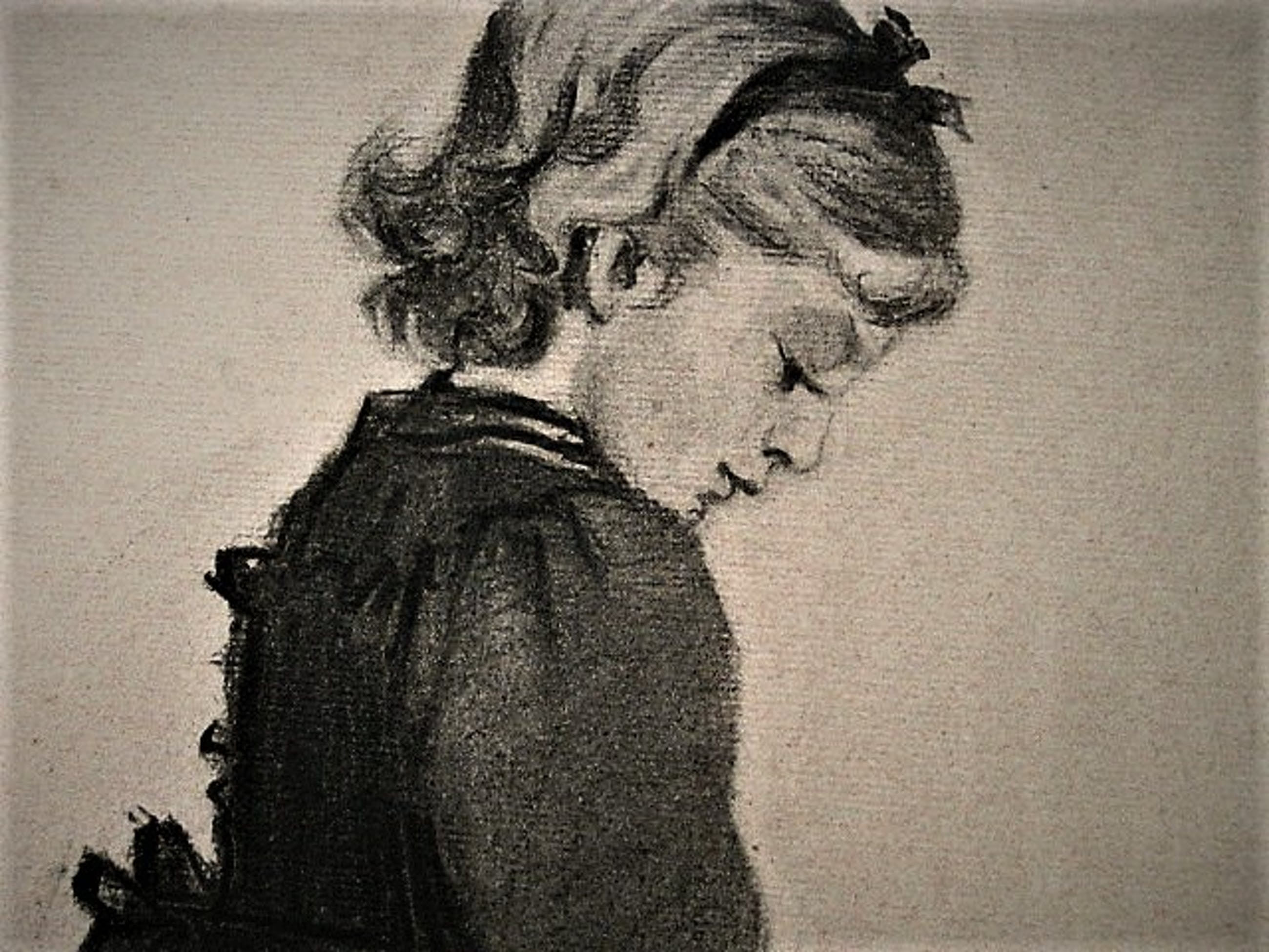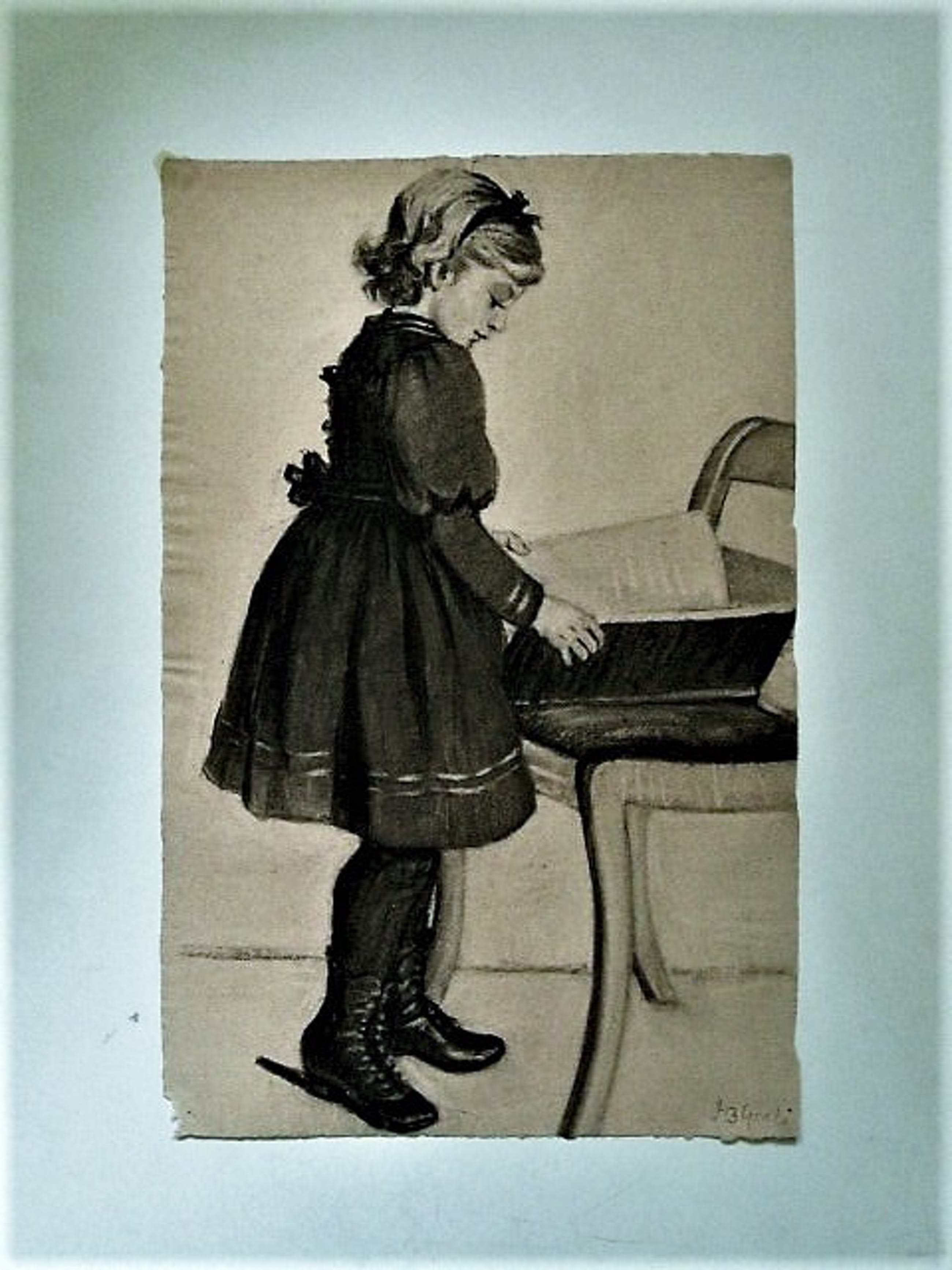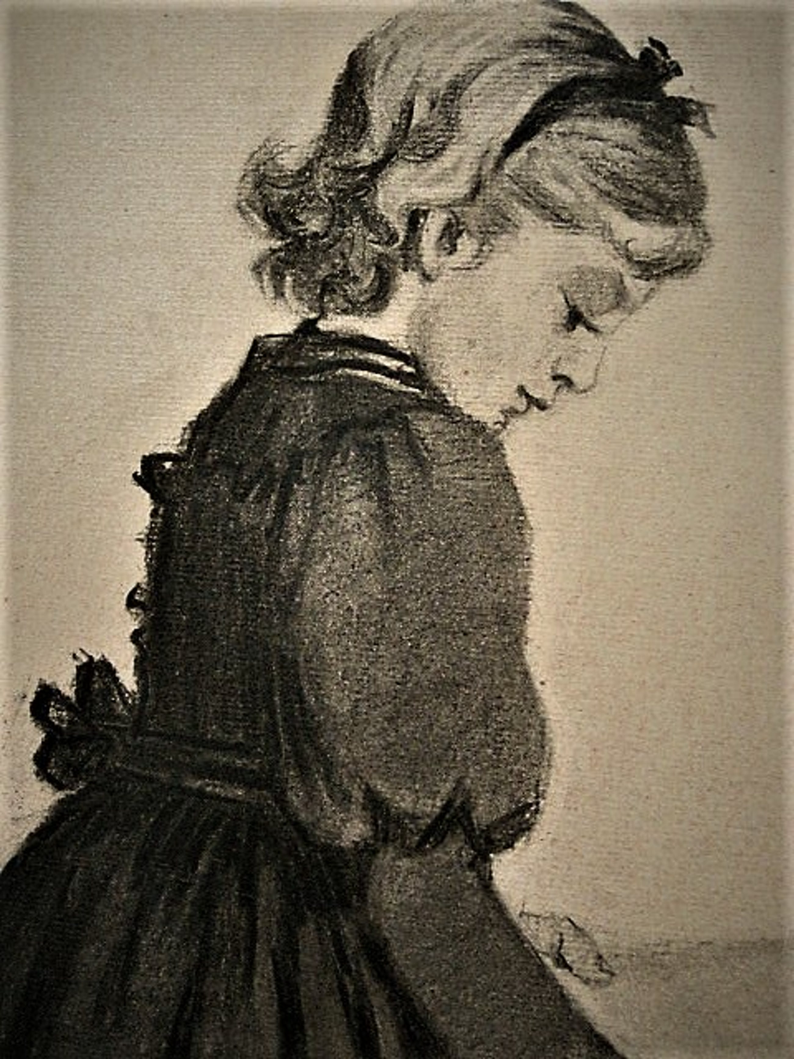 Bijzonder fraaie, omstreeks 1900 gemaakte Houtskool op papier tekening met voorstelling van een meisje dat bladert door een (sprookjes)boek. Rechtsonder gesigneerd. De grote tekening is in goede staat. Het papier is wat onregelmatig aan de randen en linksonder mist een klein hoekje van het papier.