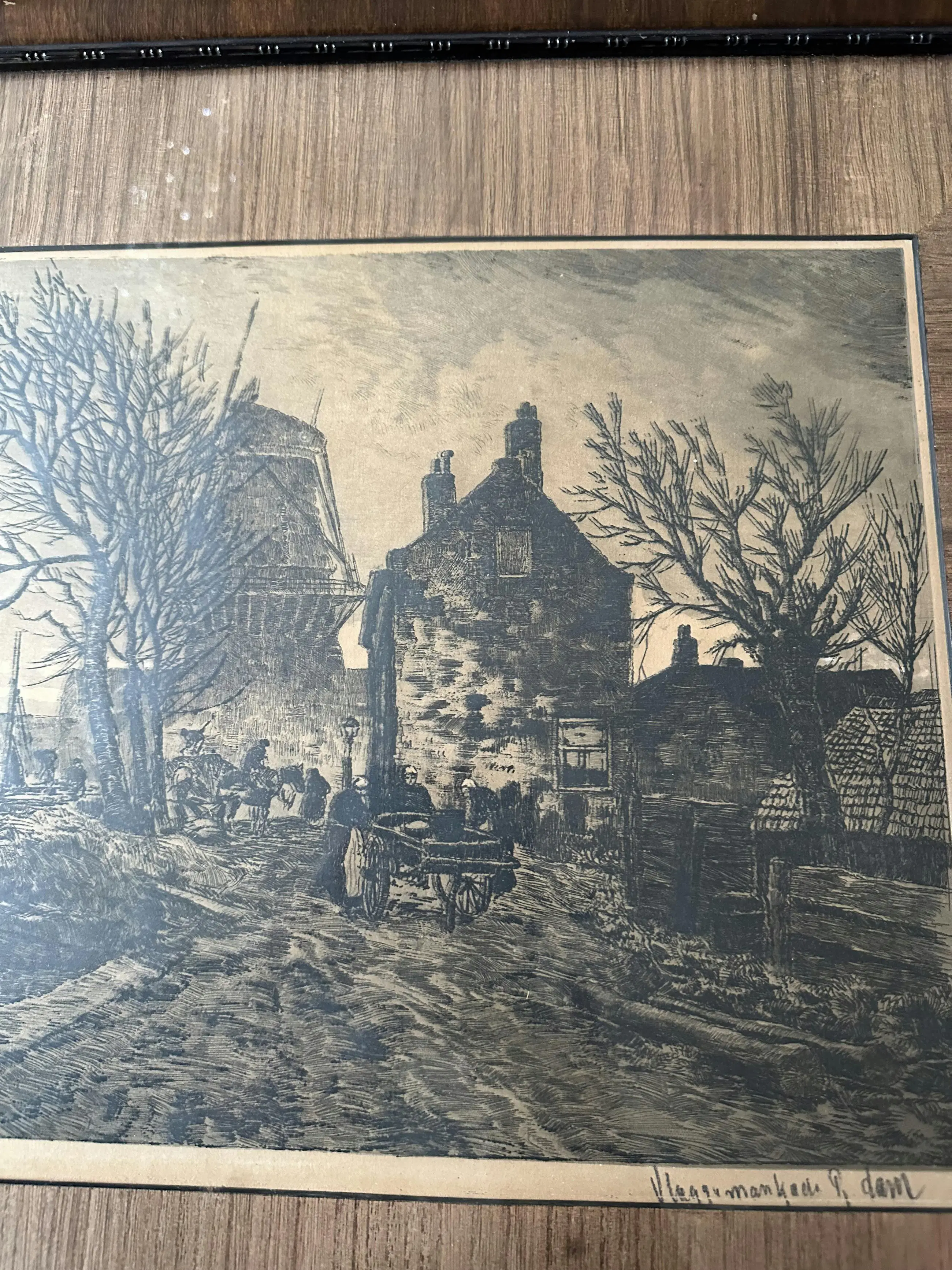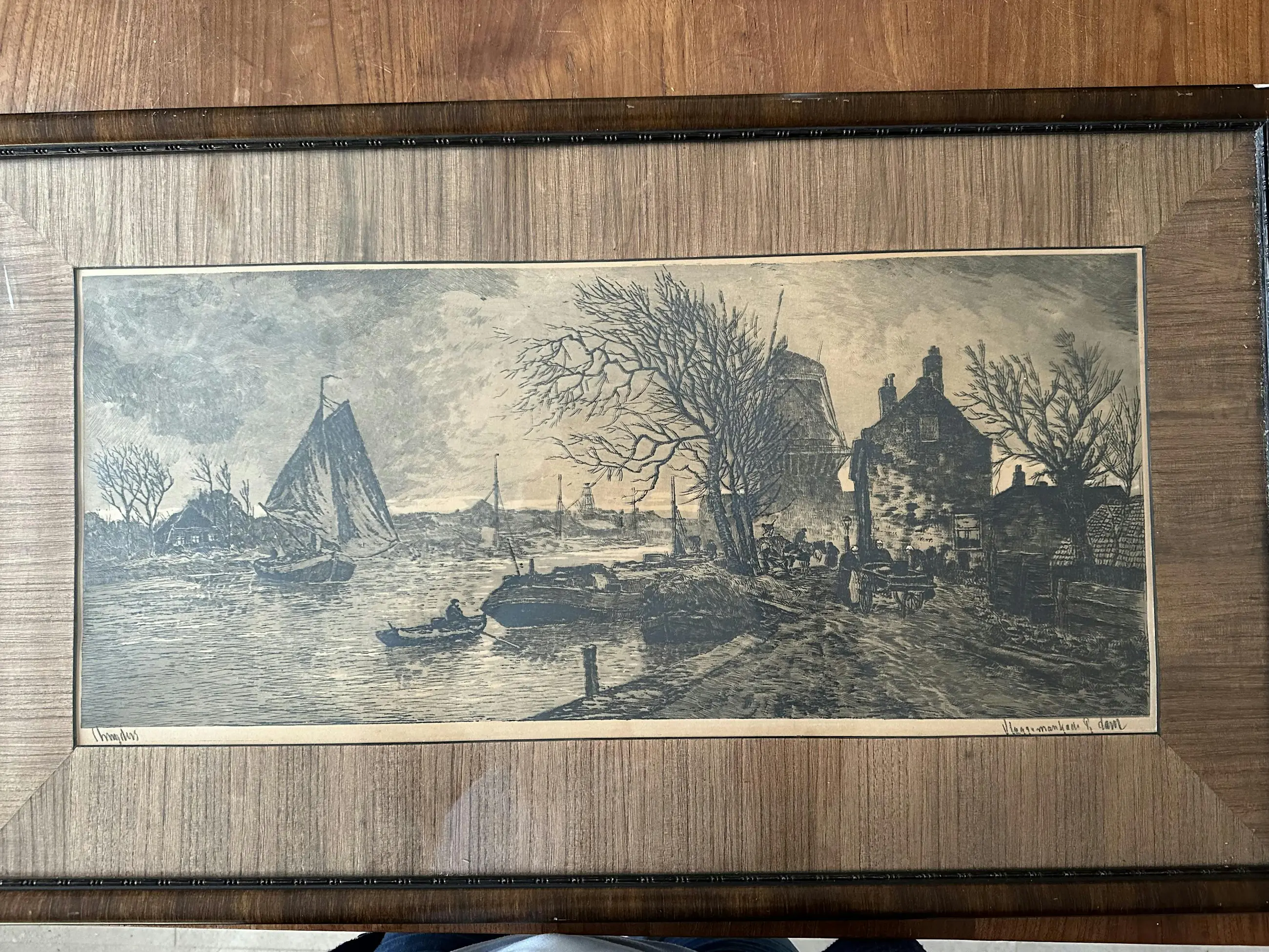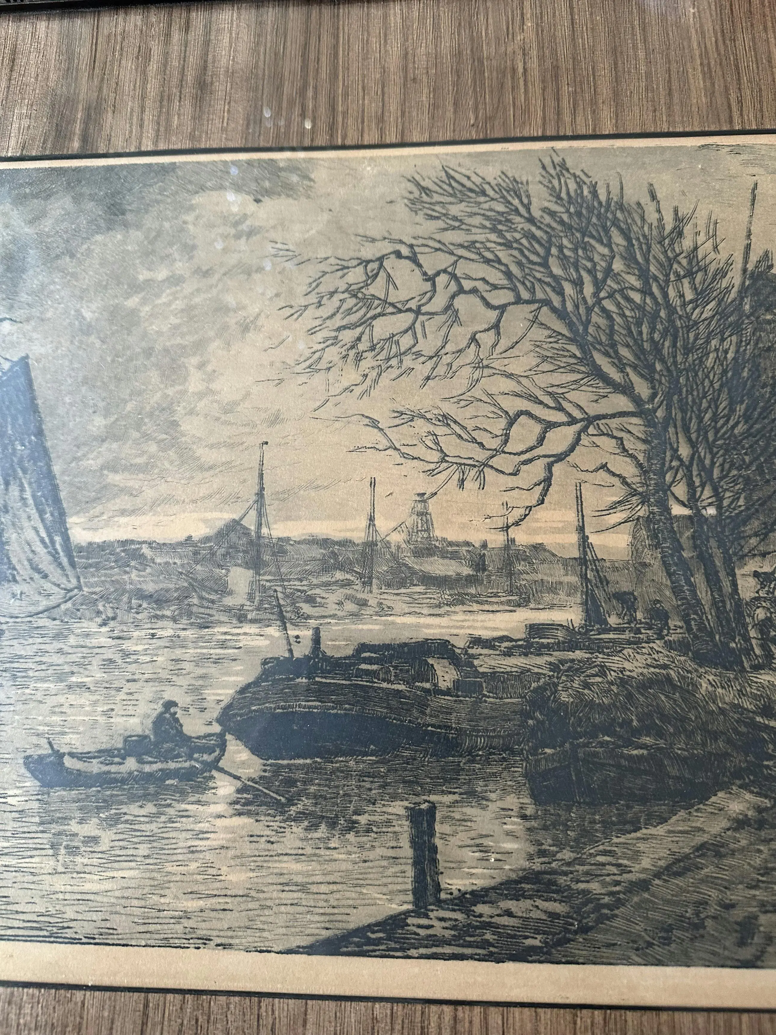 Mooie ets van Manders van de Vlaggemankade te Rotterdam Op de lijst zijn stukjes fineer eraf Zie de laatste foto ‘s 8 en 9