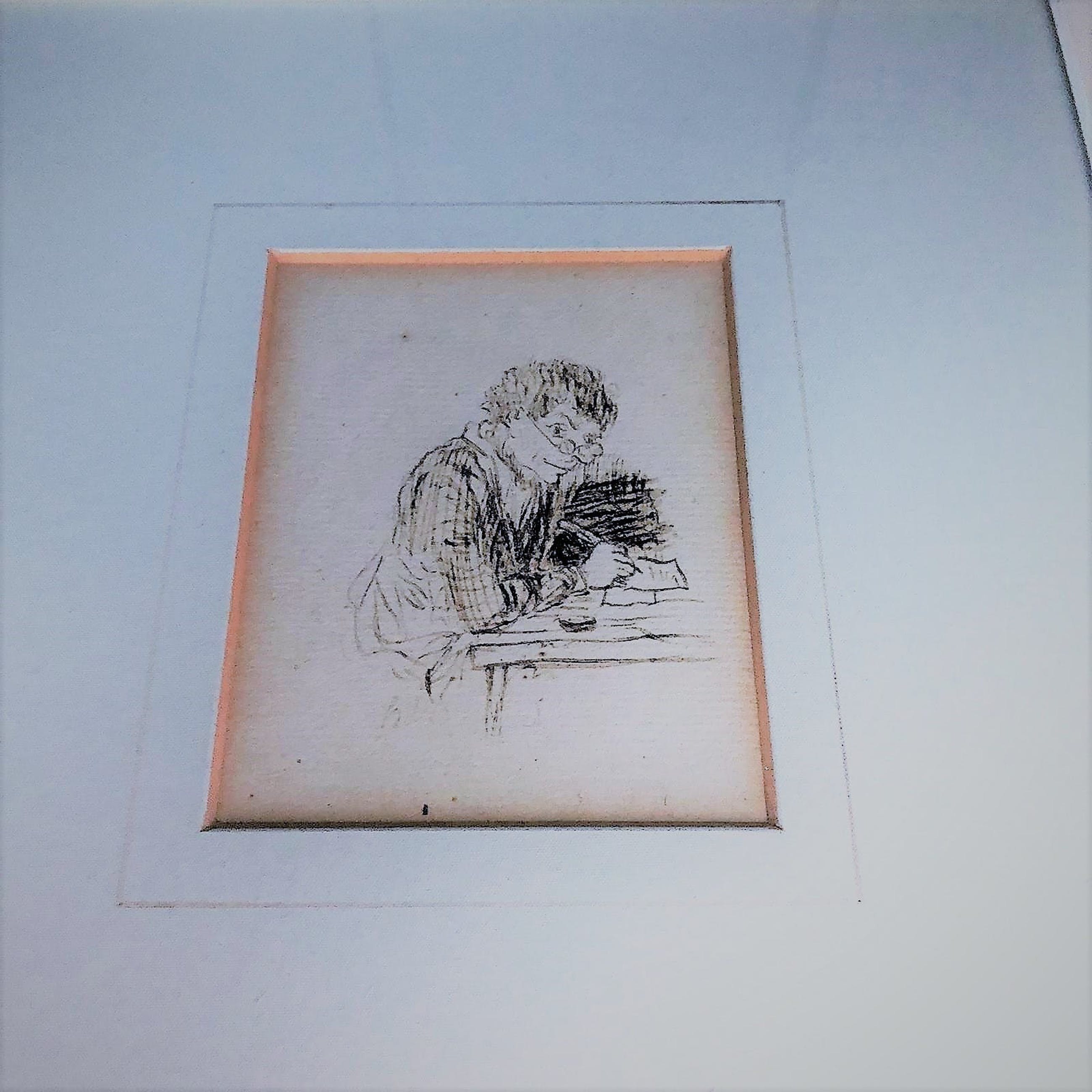 onbekend werk. Getekend portret van een man met bril die een brief schrijft. Onderaan de tekening zeer moeilijk te onderscheiden signering, meen dat er staat H.D. Tekening op hard papier/karton ingelijst door A.J. Heijdenrijk Jr. N.V.