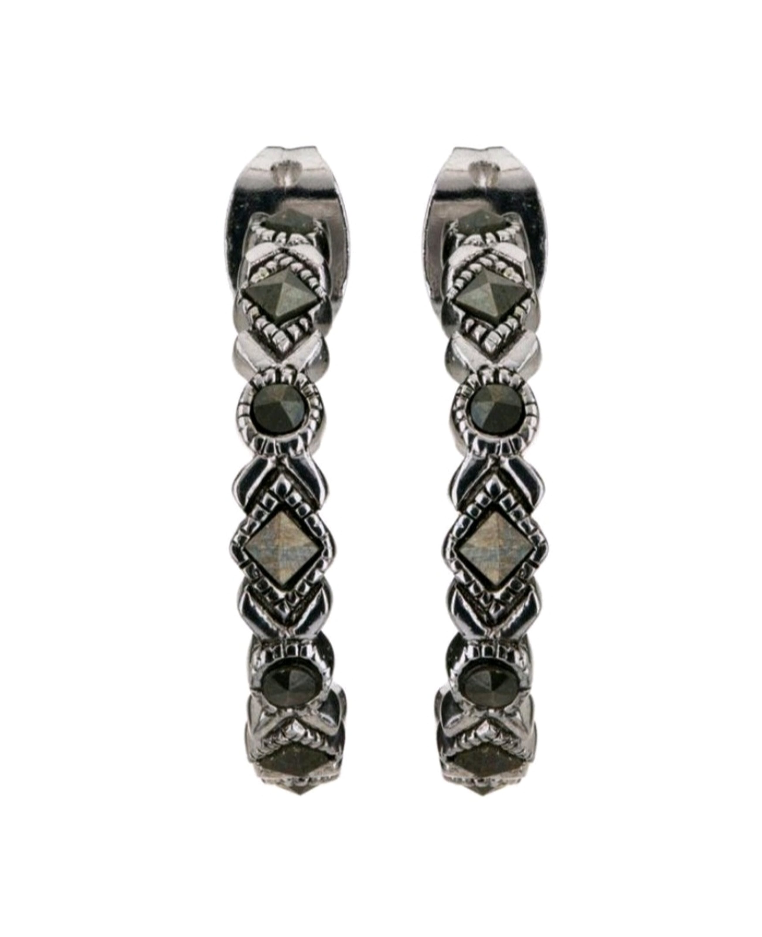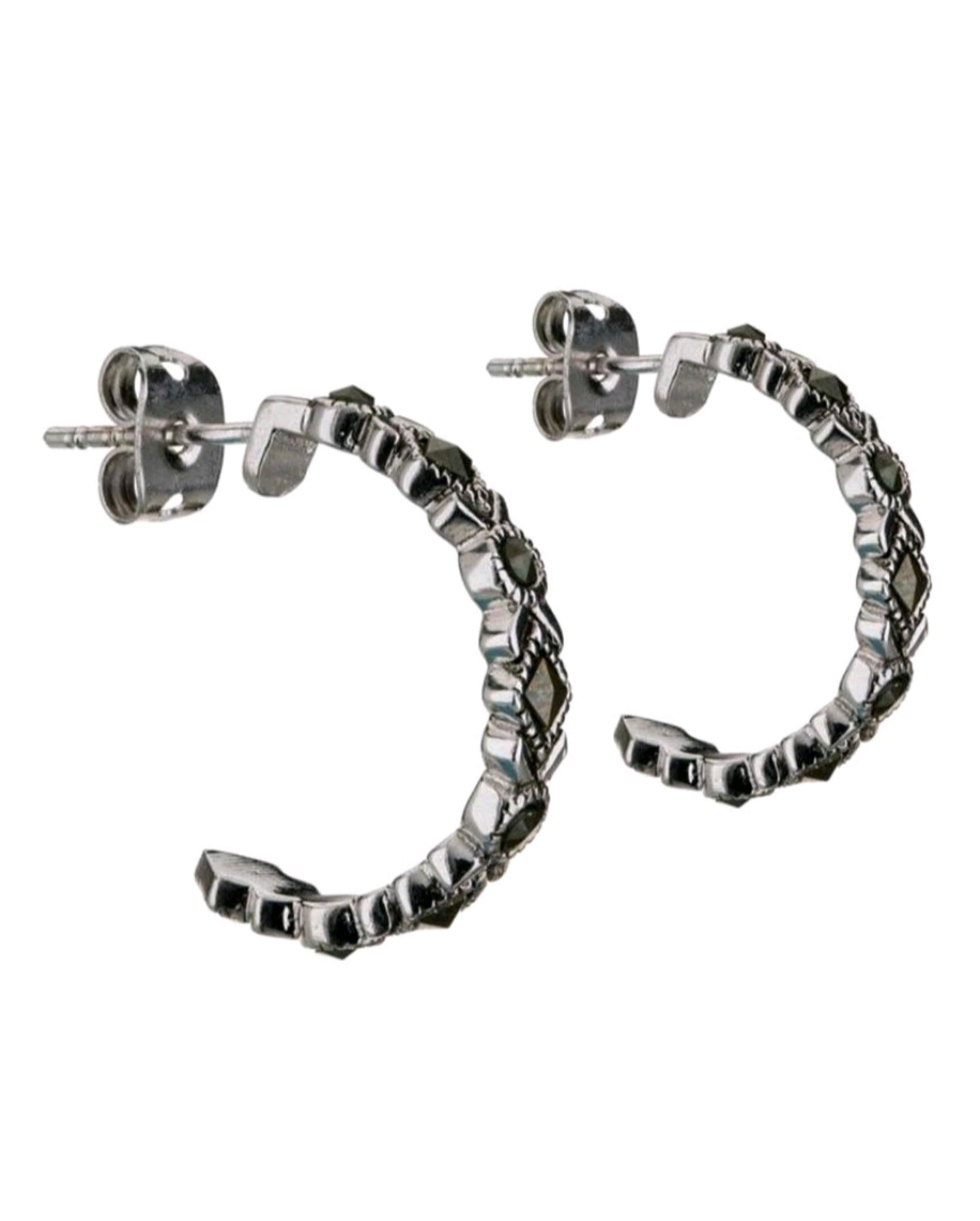 Rhodium over messing met als steentjes marcasieten in verschillende tinten. Doorsnee van de oorringen is 2,3 cm. Perfecte staat. Aangetekende verzending.