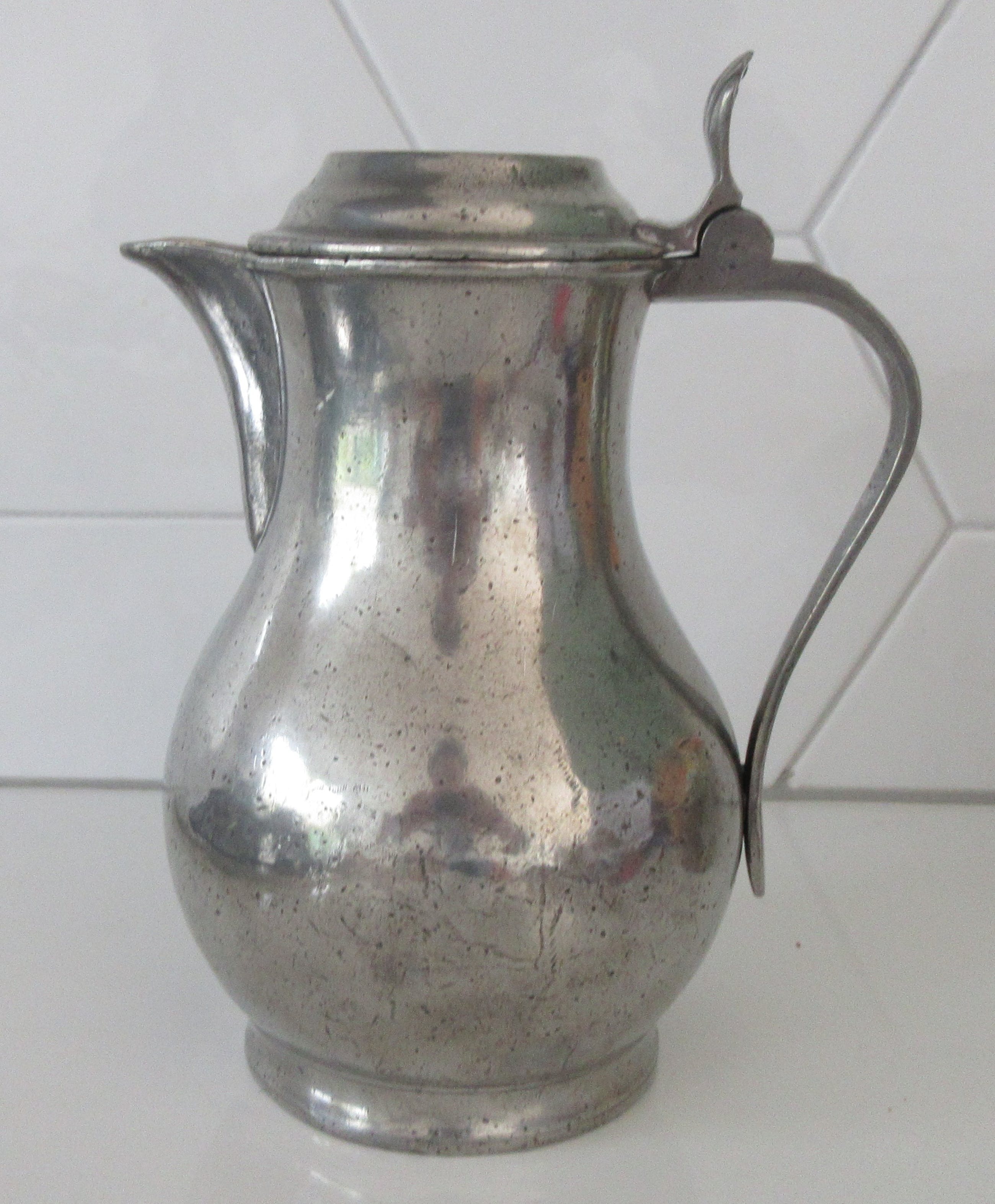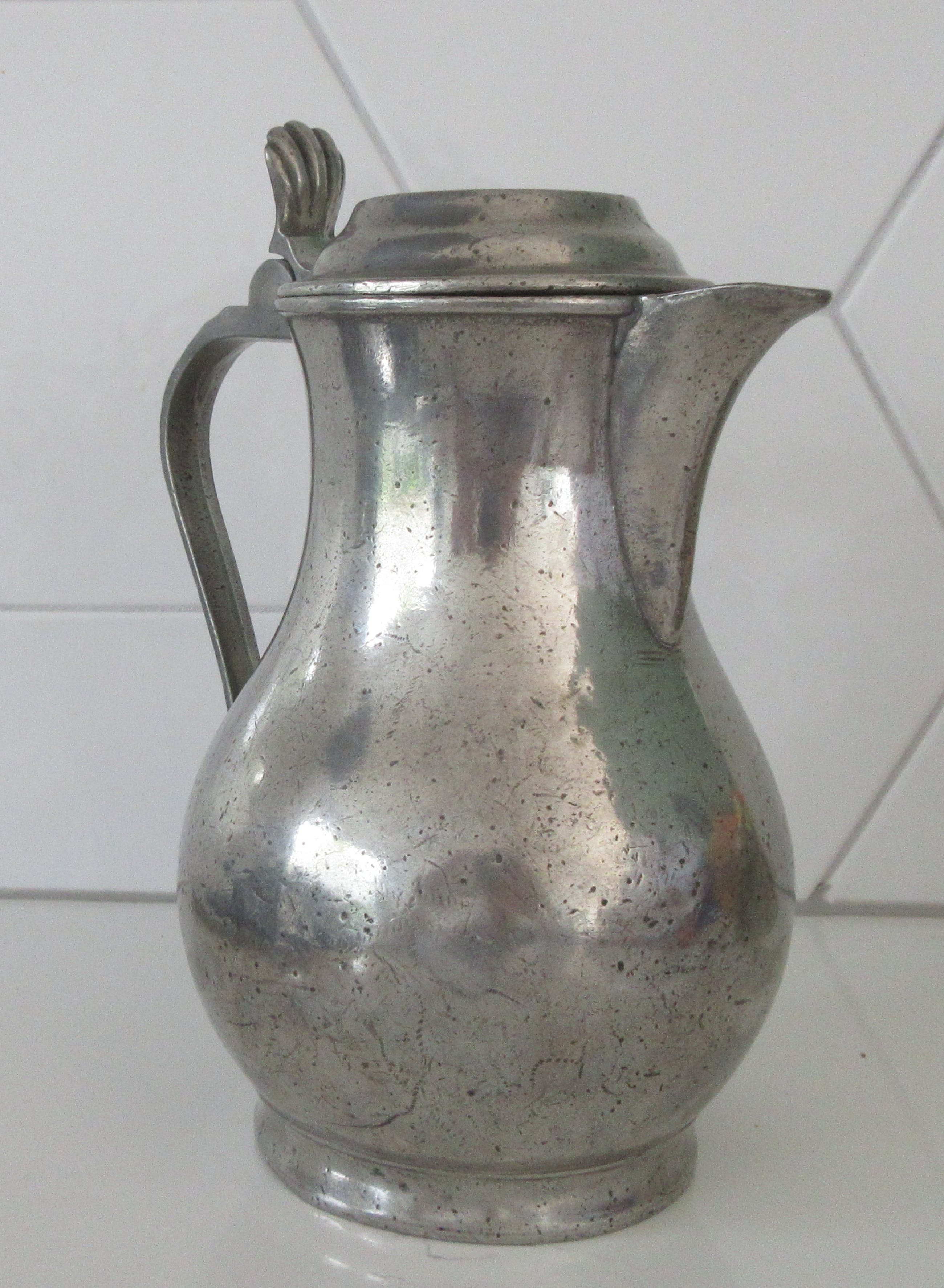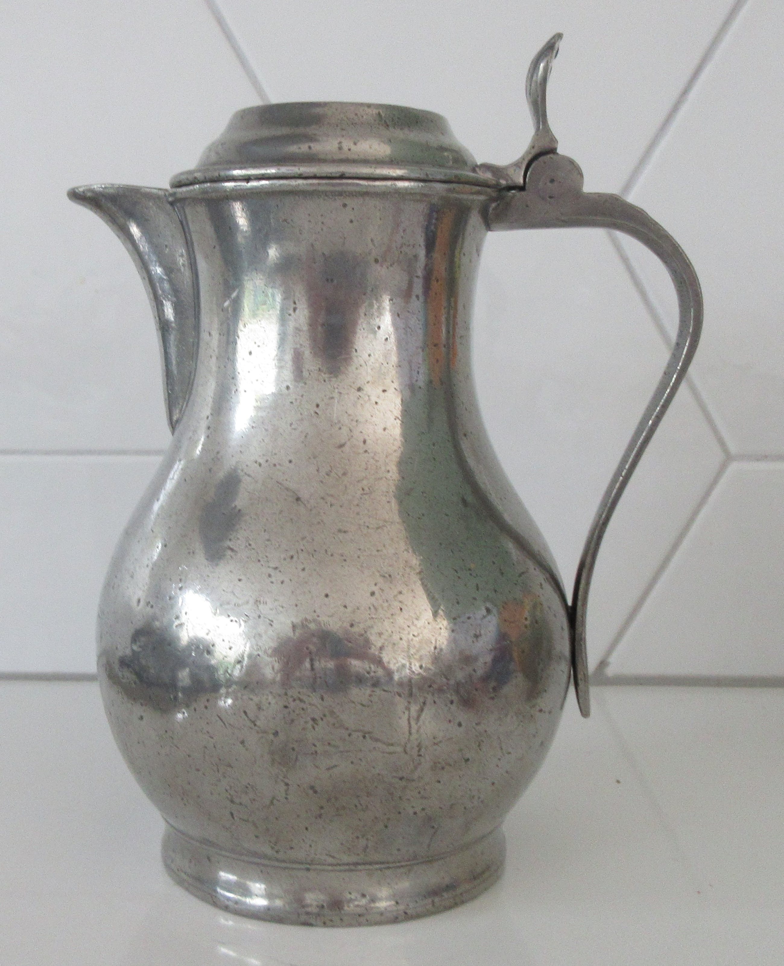 Prachtige zilvertinnen dekselan voor bier of wijn van Marinoni, in mooie gebruikte staat. Prachtige patina. Aan de onderzijde voorzien van verschillende keuren, blindmerk en het gehalte. Ook op het handvat is nog een keurmerk aanwezig. Goede zware kwaliteit!