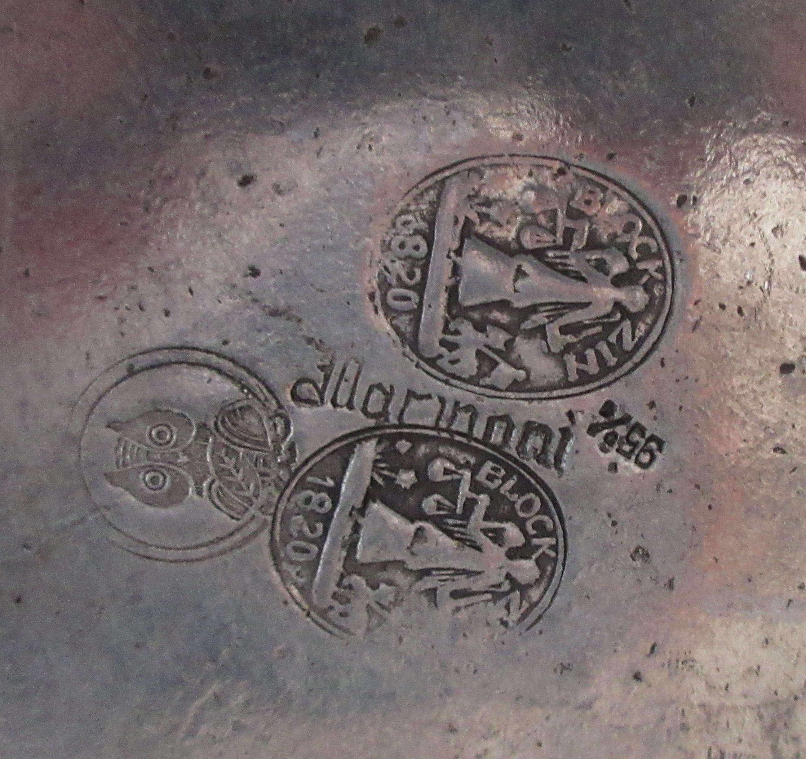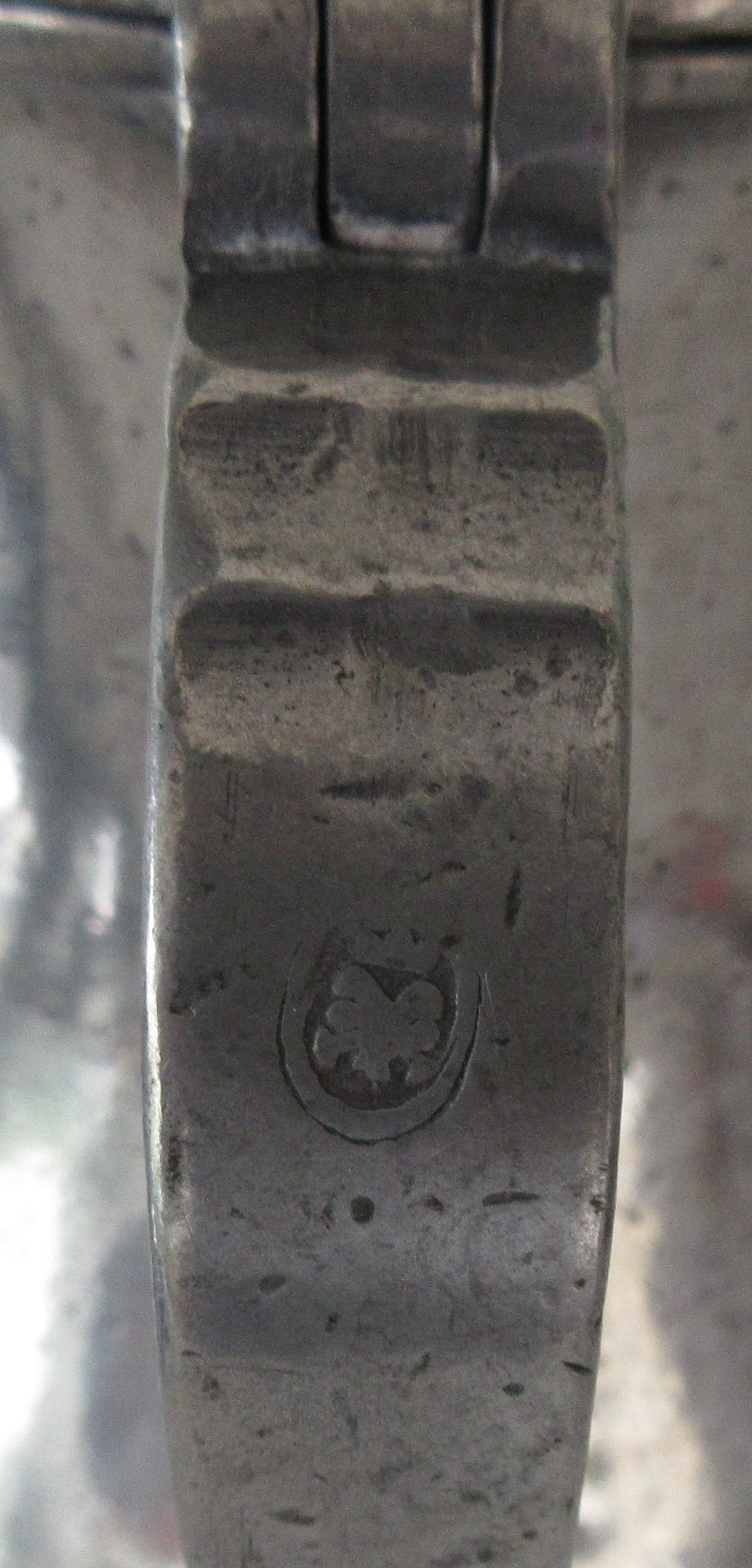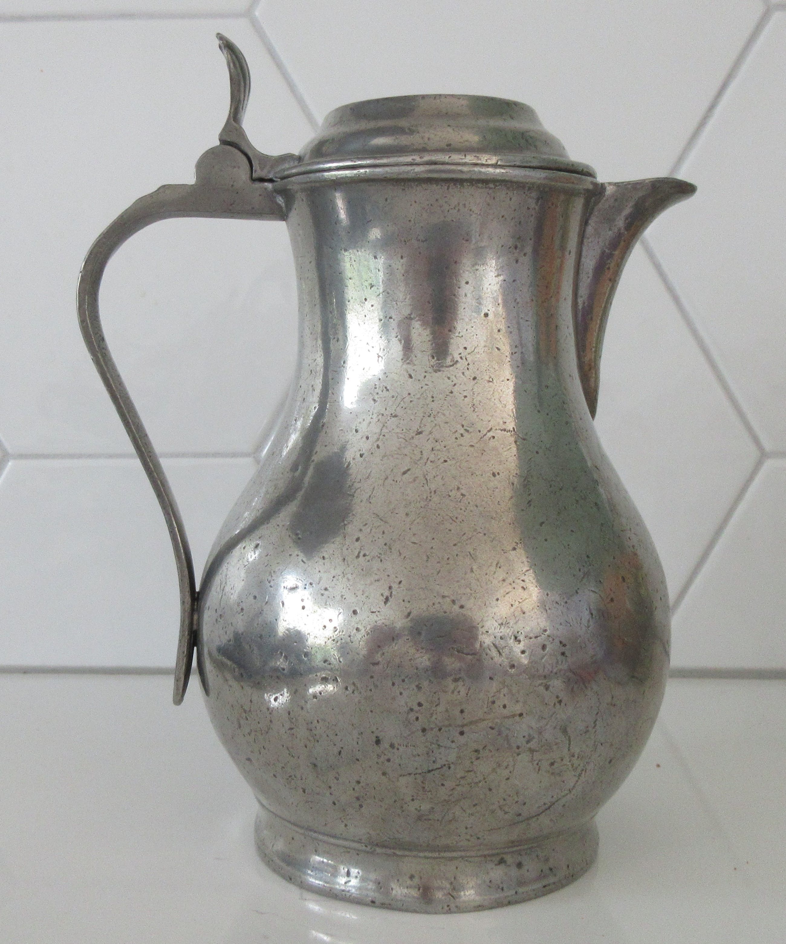 Prachtige zilvertinnen dekselan voor bier of wijn van Marinoni, in mooie gebruikte staat. Prachtige patina. Aan de onderzijde voorzien van verschillende keuren, blindmerk en het gehalte. Ook op het handvat is nog een keurmerk aanwezig. Goede zware kwaliteit!