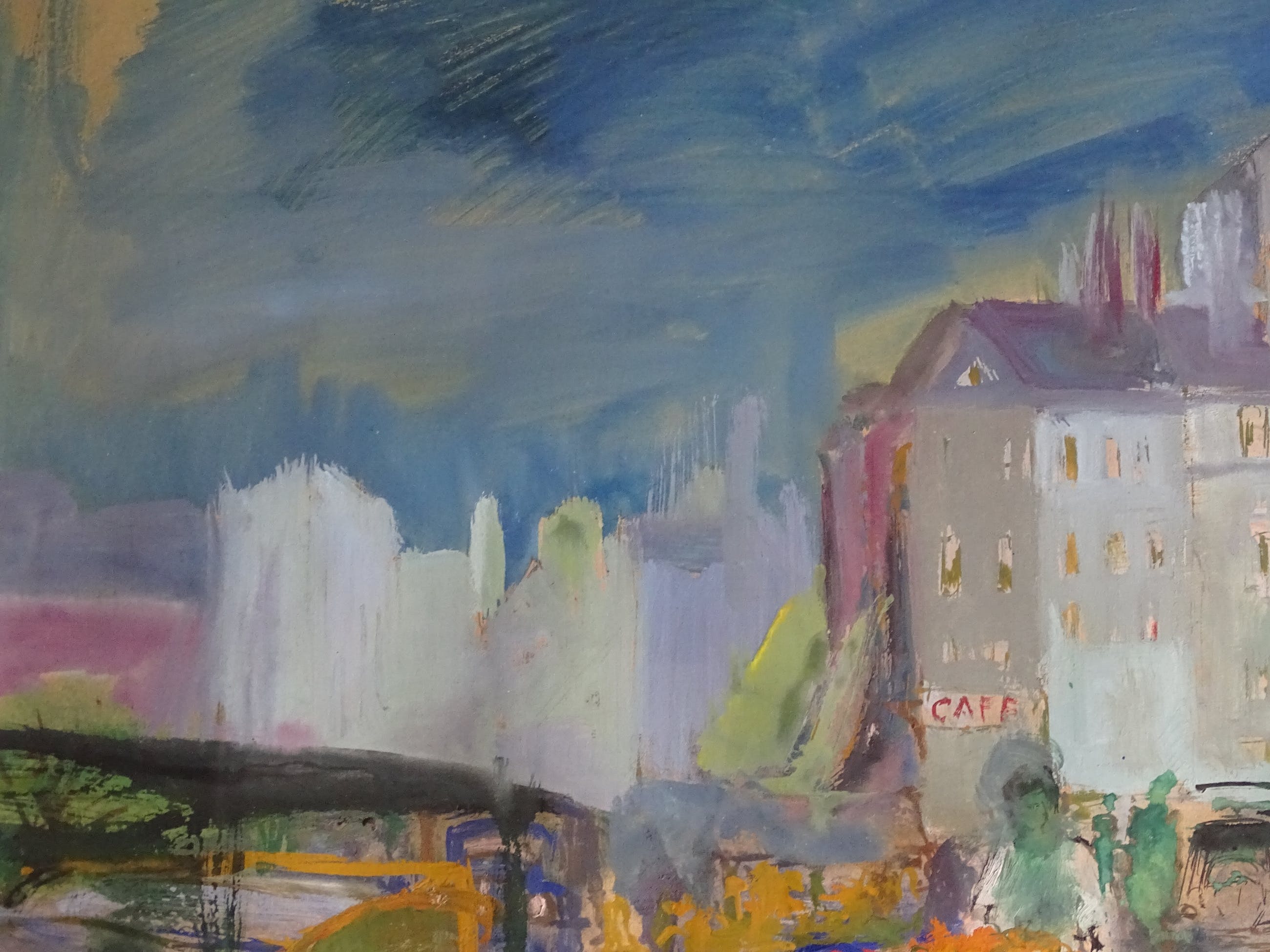 Op achtergrond huizen en café, in het midden auto's en op voorgrond personen die handel drijven, lijkt op een markt ergens in een dorpje in Frankrijk.
