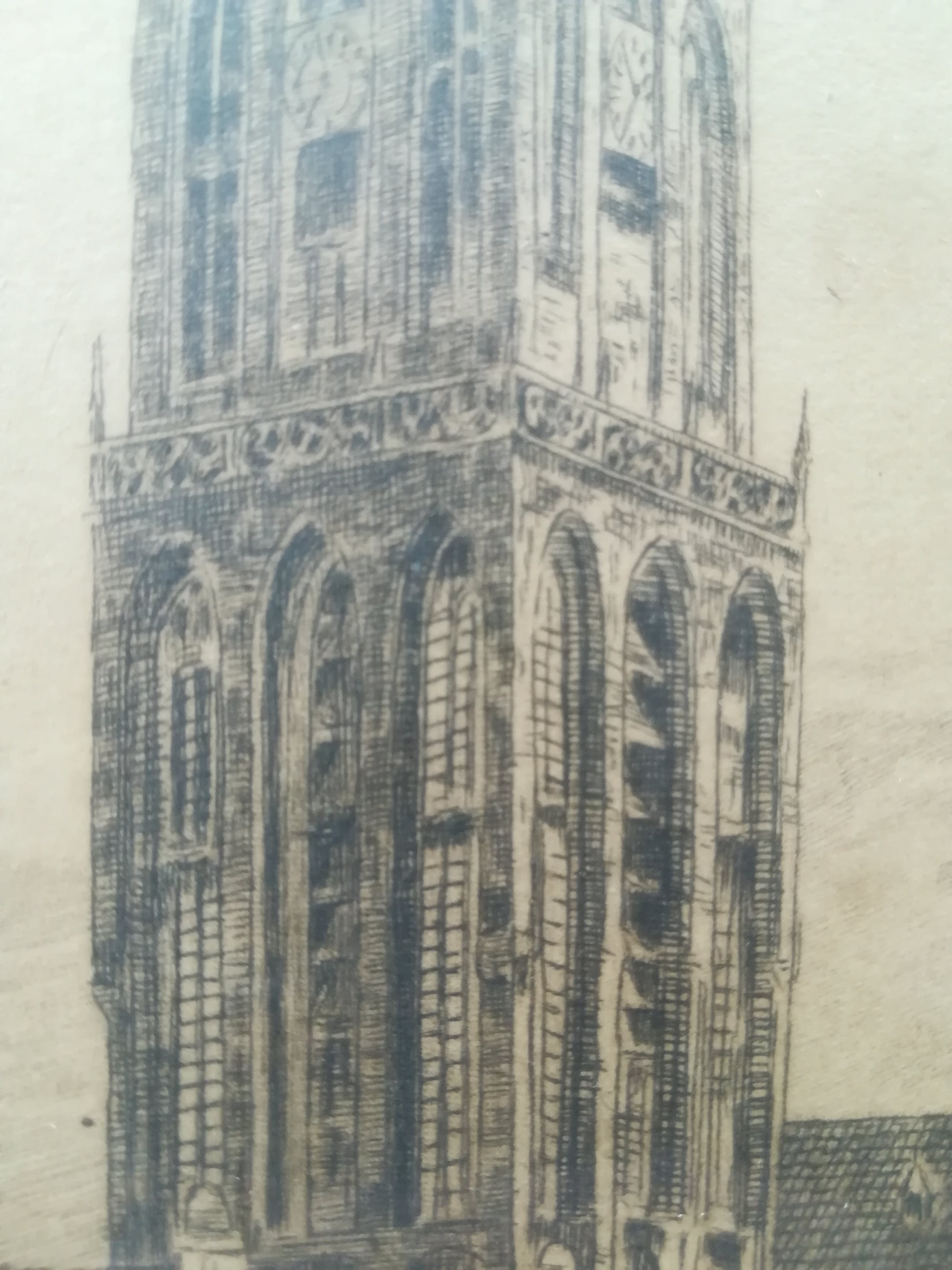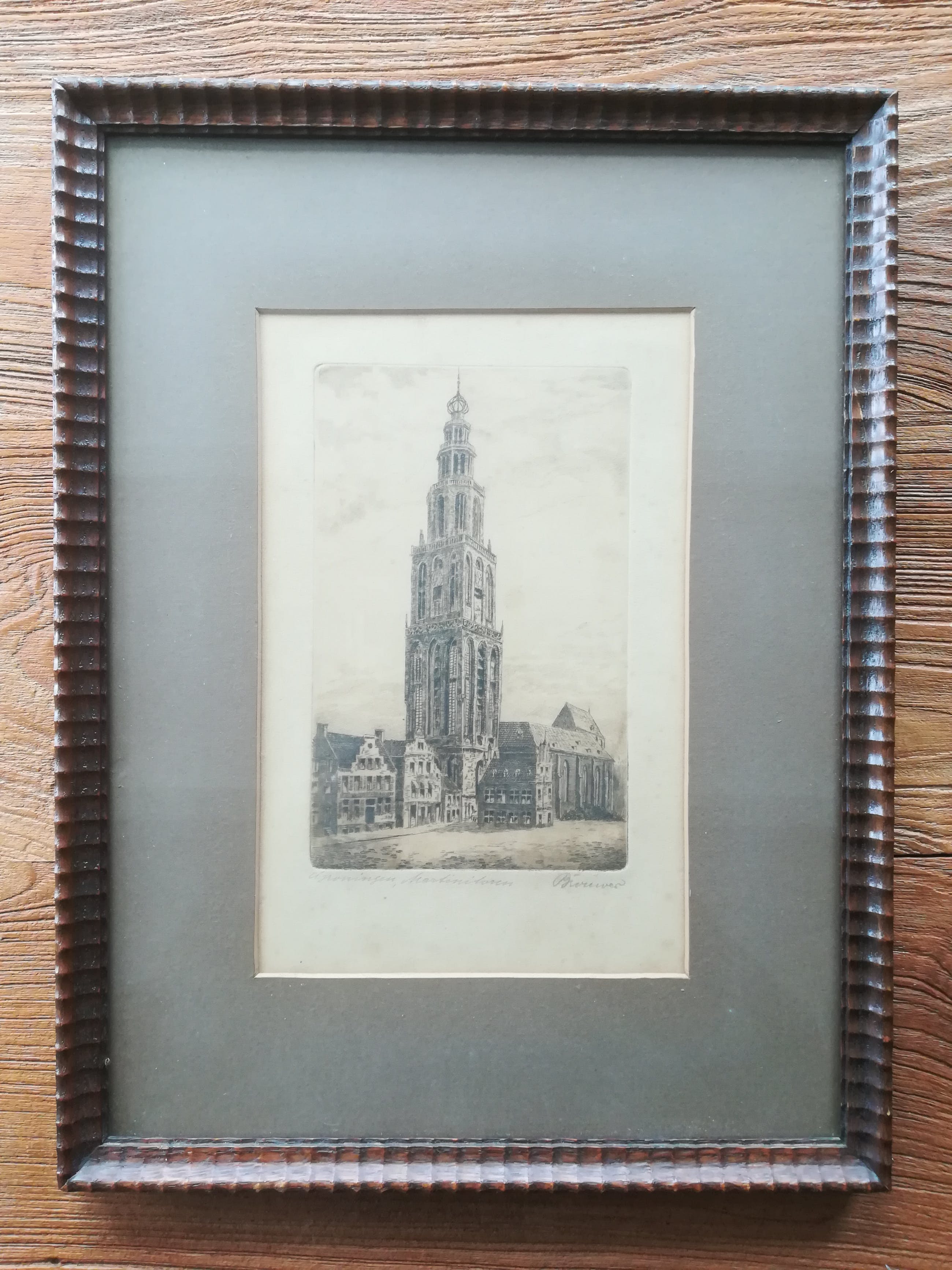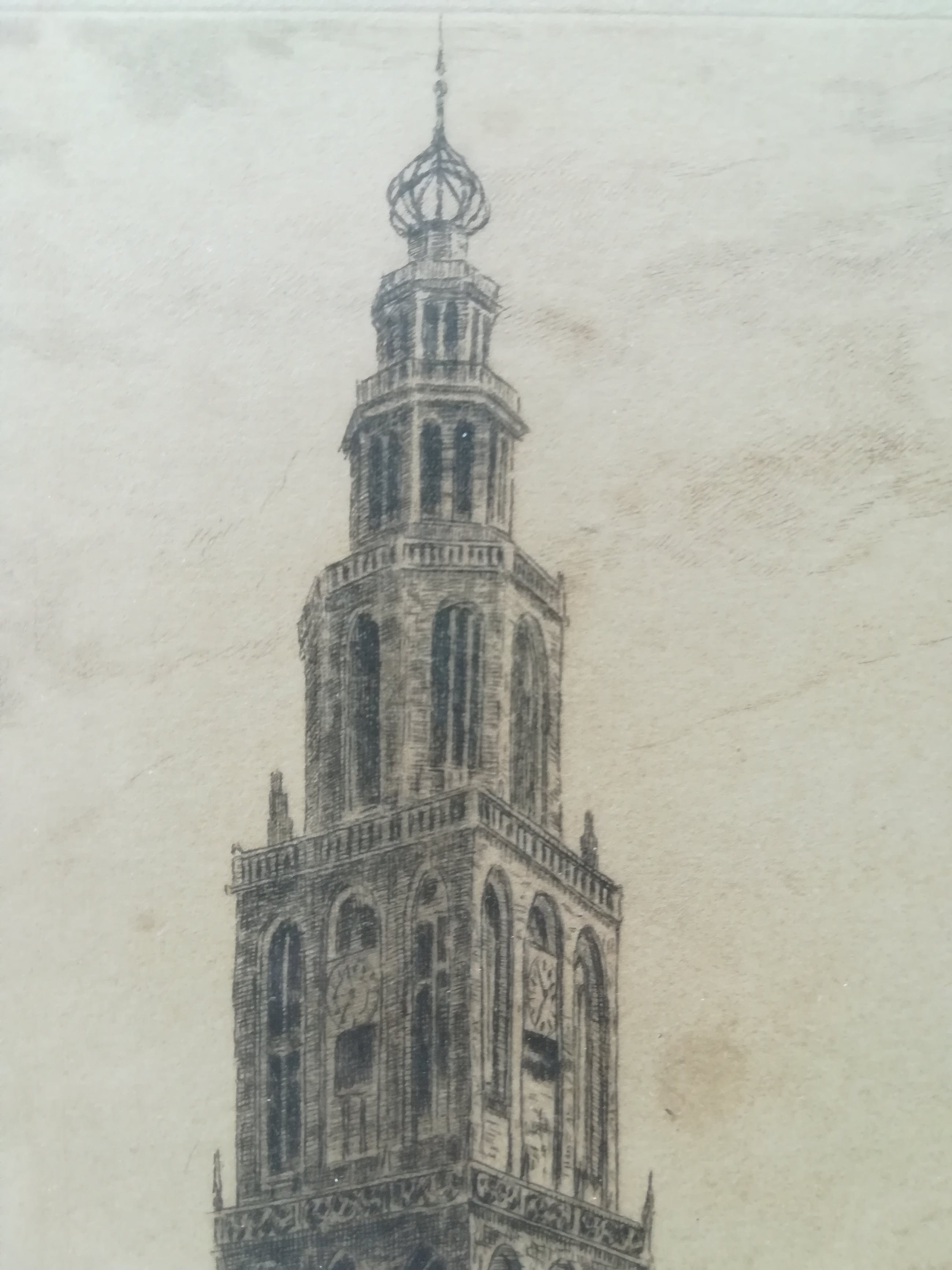 Prachtige sfeervolle voorstelling van de Martinitoren te Groningen. Gezien hetgeen op de afbeelding staat is het werk voor 1900 gemaakt.