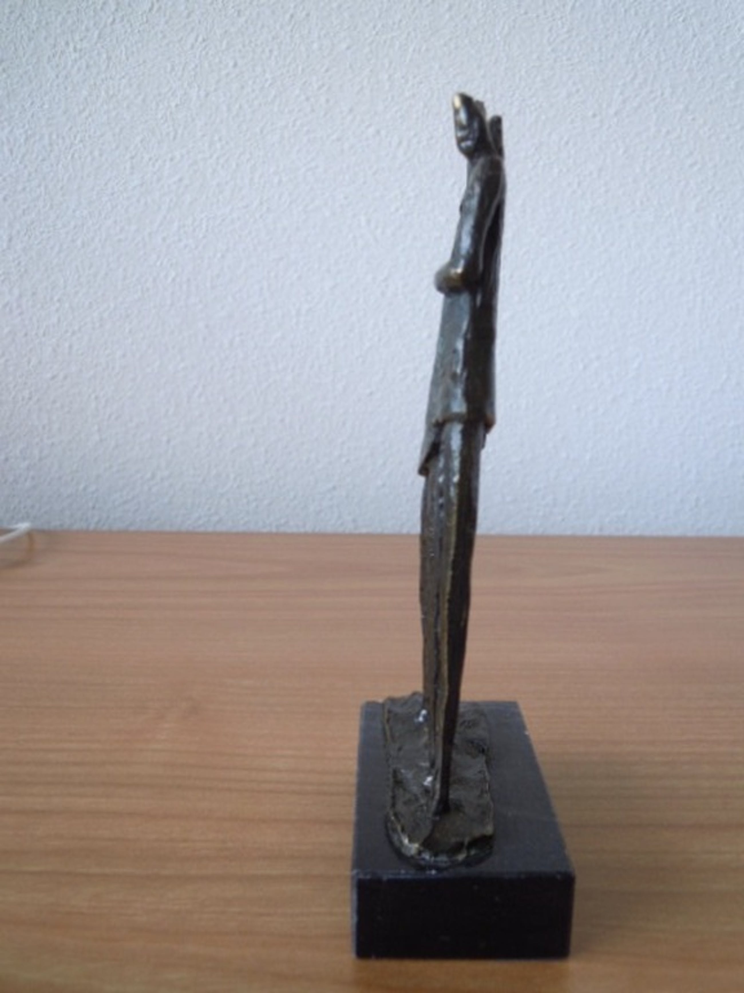 Massief bronzen beeld 18 cm hoog inclusief sokkel.