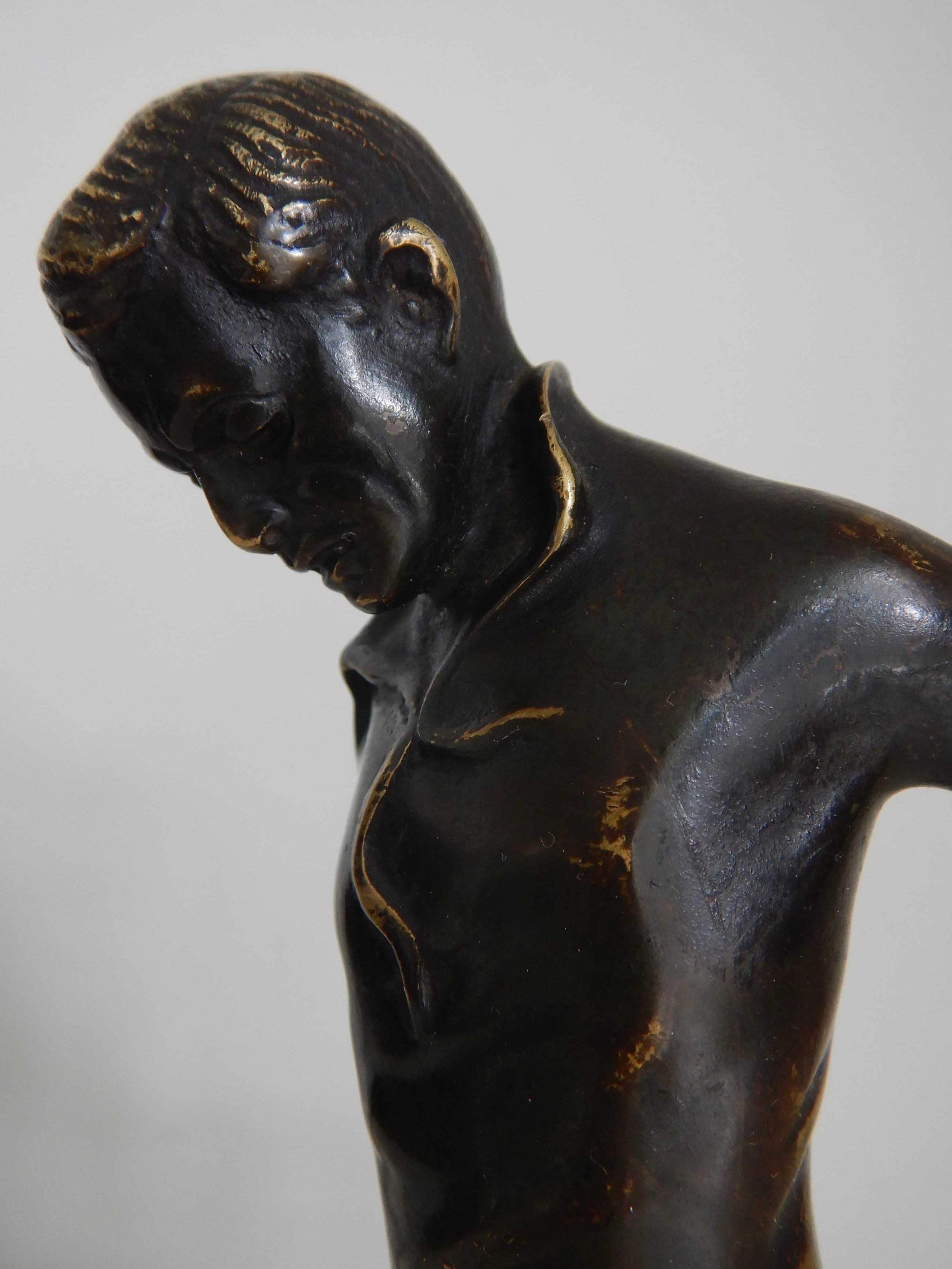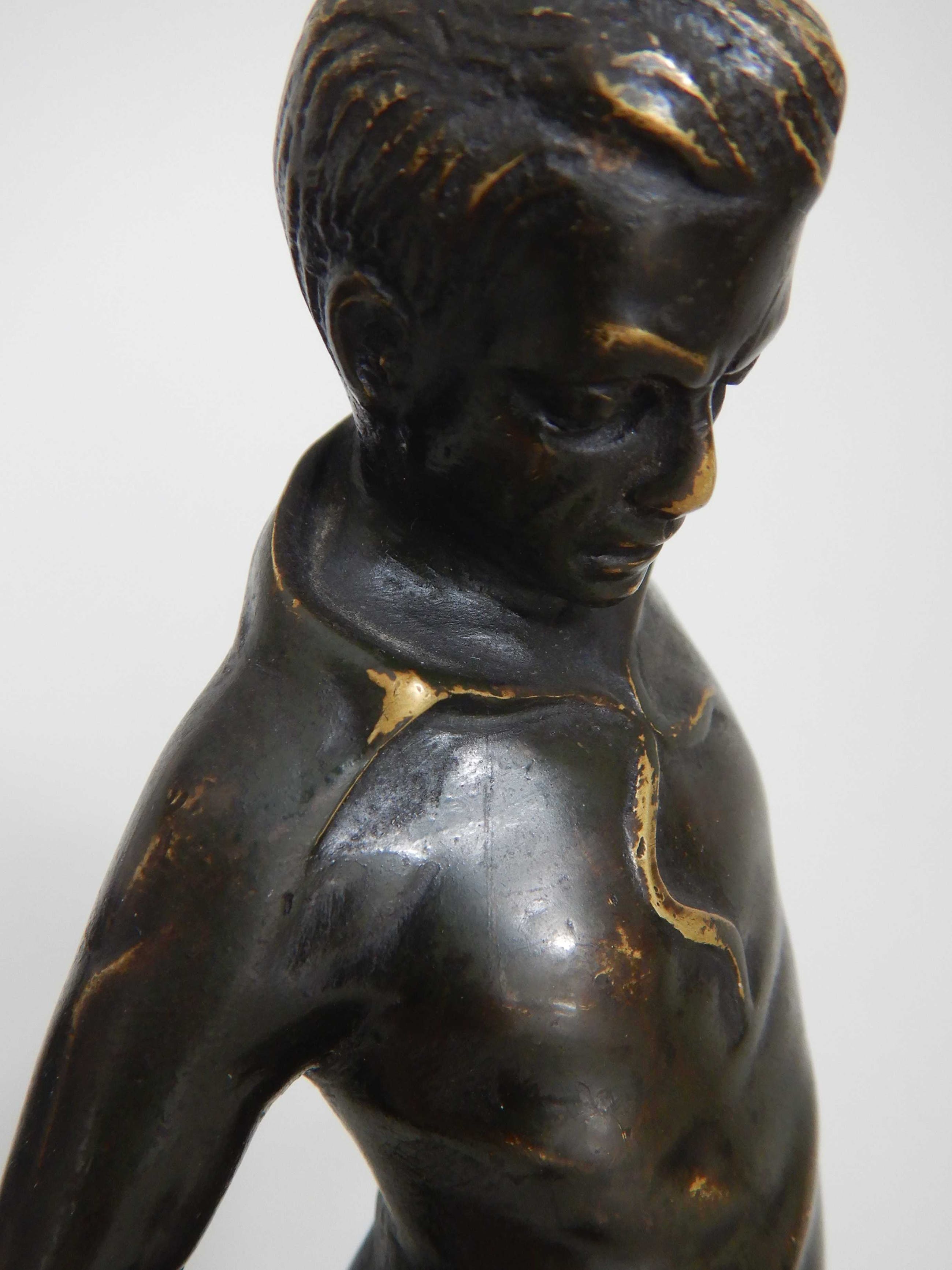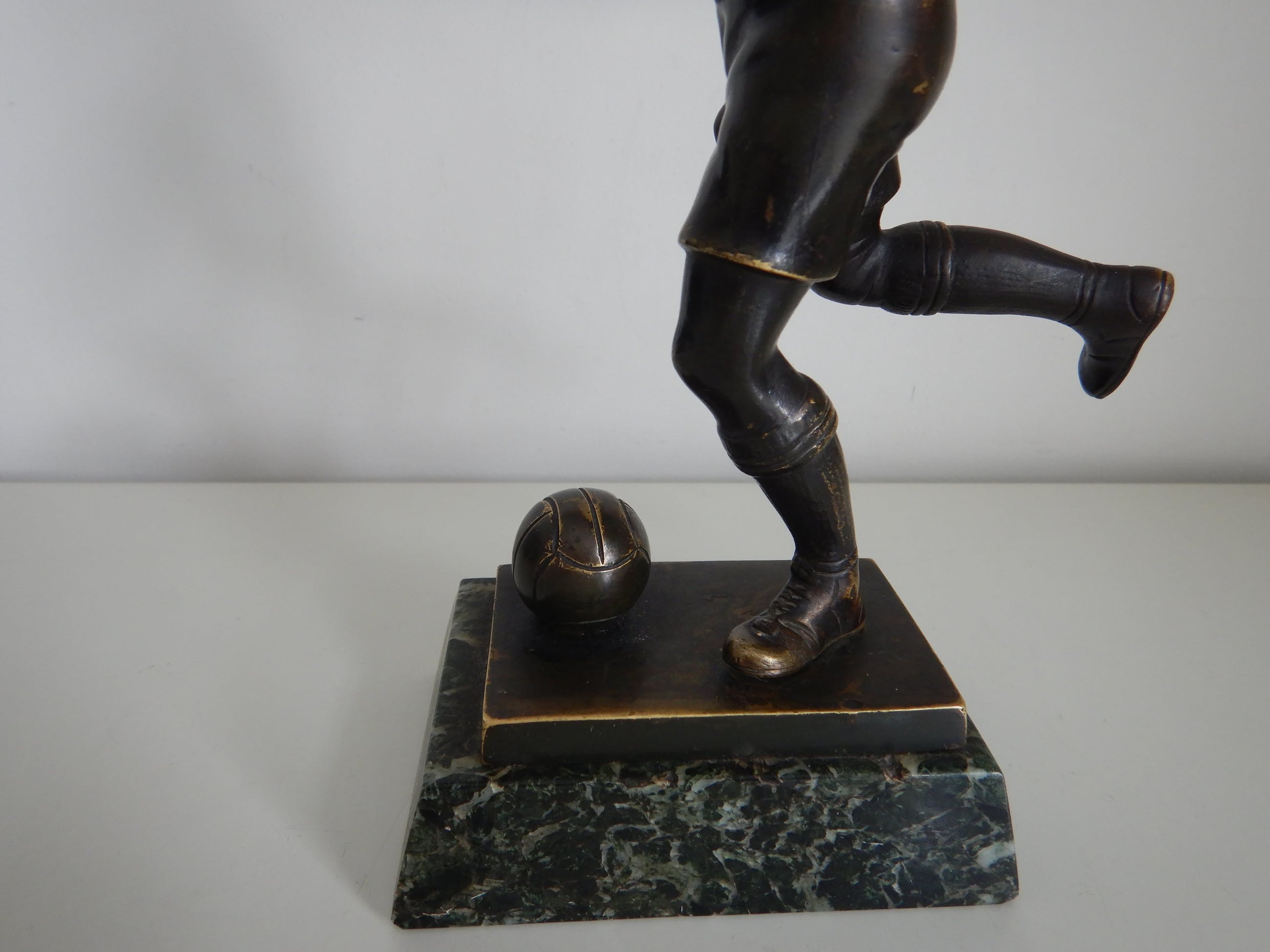 Nostalgisch bronzen beeld van een voetballer.Het beeld is van massief brons en staat op een donkergroene marmeren voet. De maker is onbekend: niet gesigneerd.Mooi gedetailleerd uitgevoerd. Totale hoogte is 26 cm. Maten voetstuk: 11 cm x 7.5 x 3 cm. Gewicht: 2,3 kg Het beeld verkeert in heel goede staat.