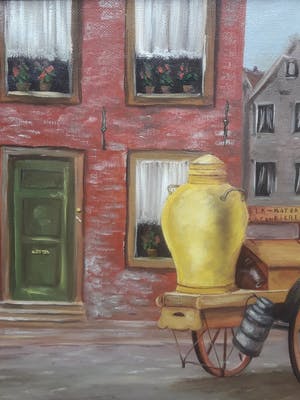 Leuk werkje van een traditionele Hollandse melkboer. Verkoop van melk, boter, kaas en eieren vanaf de kar door de straten van de stad. Ouderdom Ca. 1950 Het werk is gesigneerd door G Verbrugge. Er zijn meerdere werken van deze schilder bekend en geveild maar er zijn weinig gegevens van hem te achterhalen. Het werk is in zeer goede staat, de lijst heeft wel wat slechte plekken. Het zal worden verzonden in een op maat gemaakte kist om beschadiging te voorkomen.