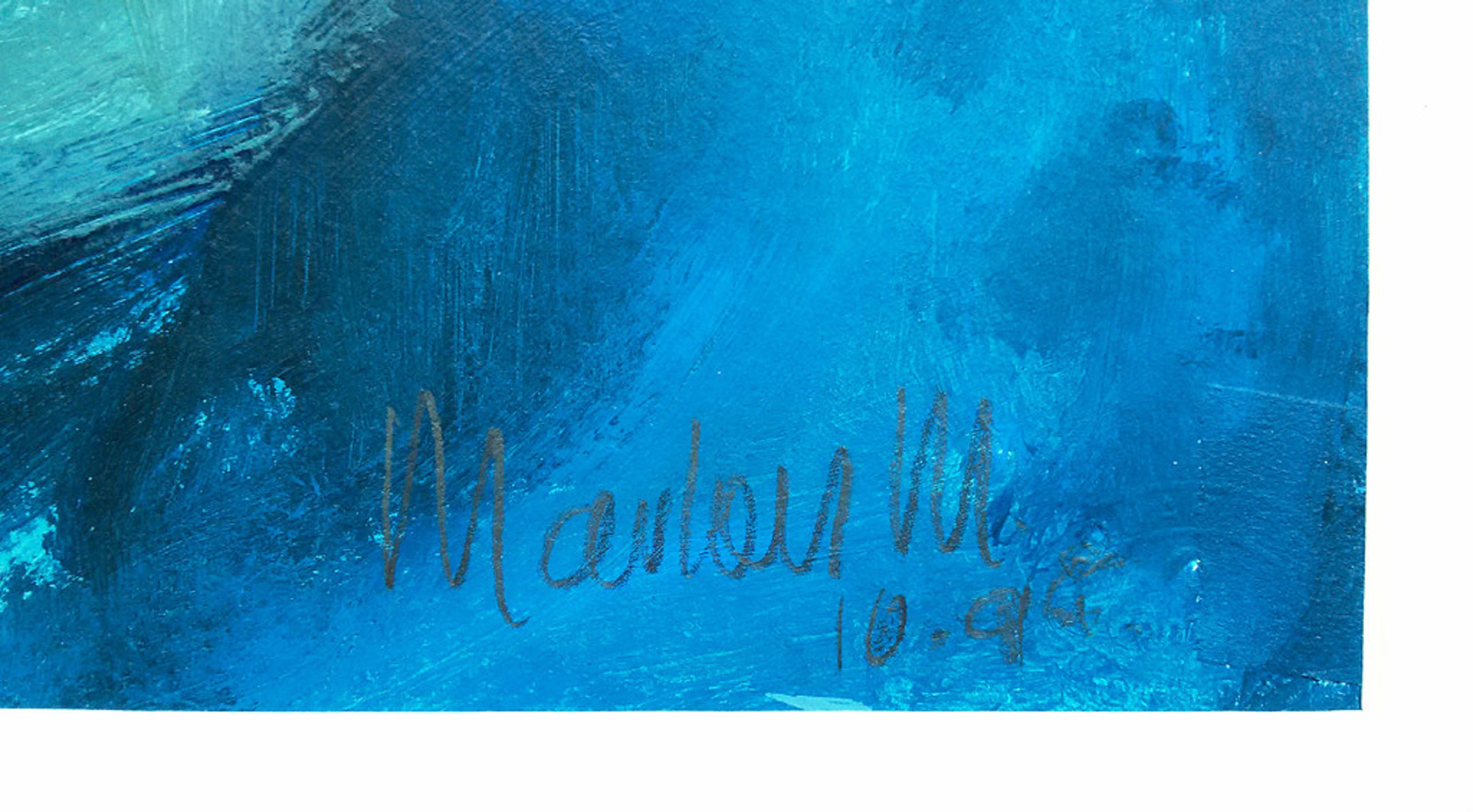 Prachtig werk van een onbekende kunsten(a)ar(es), voorstellende een soort mensfiguur met een paard. Acrylverf op zeer dik aquarel papier (Canson Montval Aquarelle, met blindstempel) in zuurvrij passe-partout. Met potlood gesigneerd (Marlou M.?) en gedateerd (10 94). Afkomstig uit de kunstcollectie van ABNAMRO, in uitstekende staat. Gezien de herkomst moet de kunsten(a)ar(es) te herleiden zijn, maar het is mij niet gelukt.
