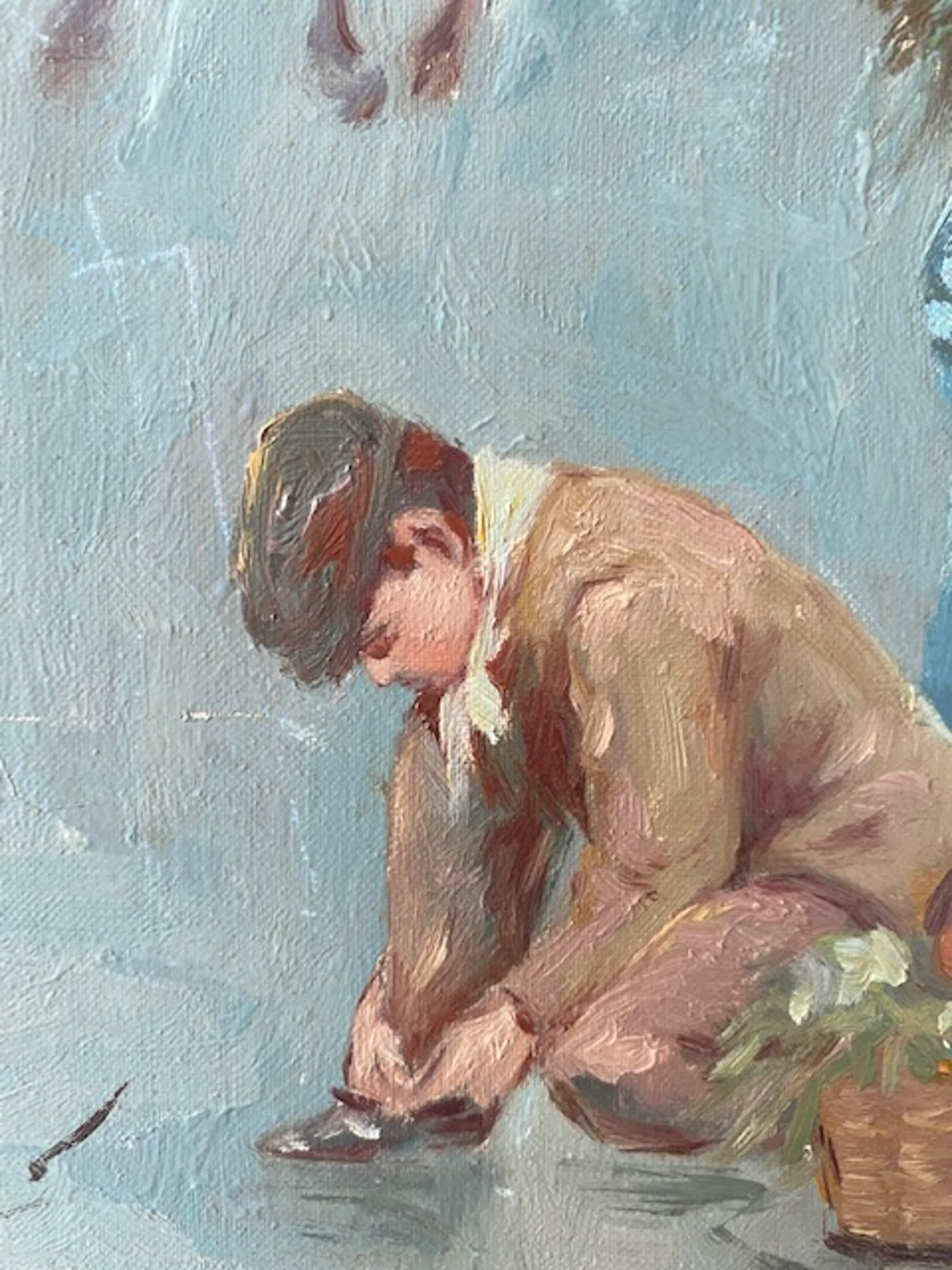 het doekje is in redelijk goede staat en zit goed in de vernis. Het vertoont weinig ouderdomssporen.