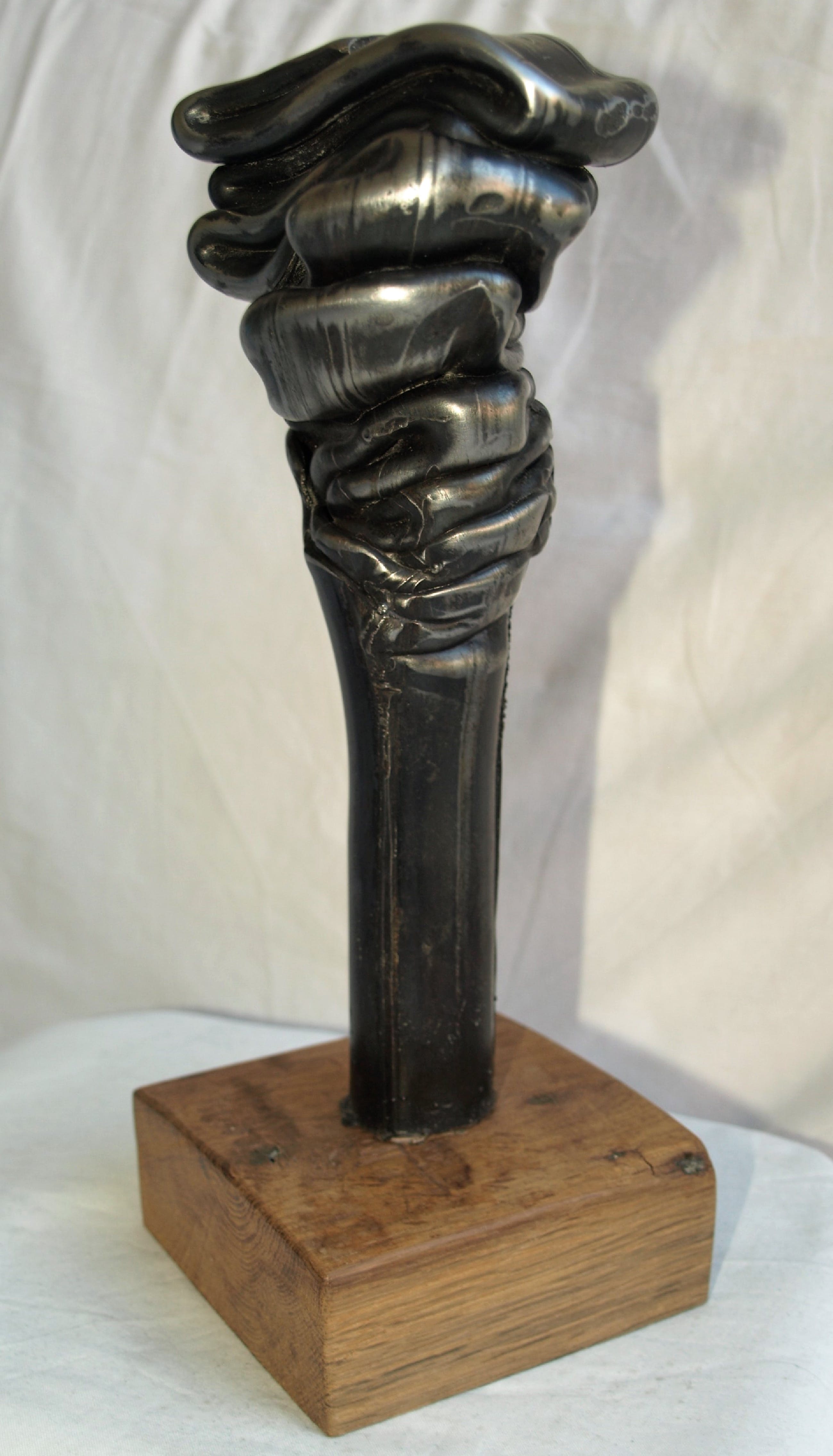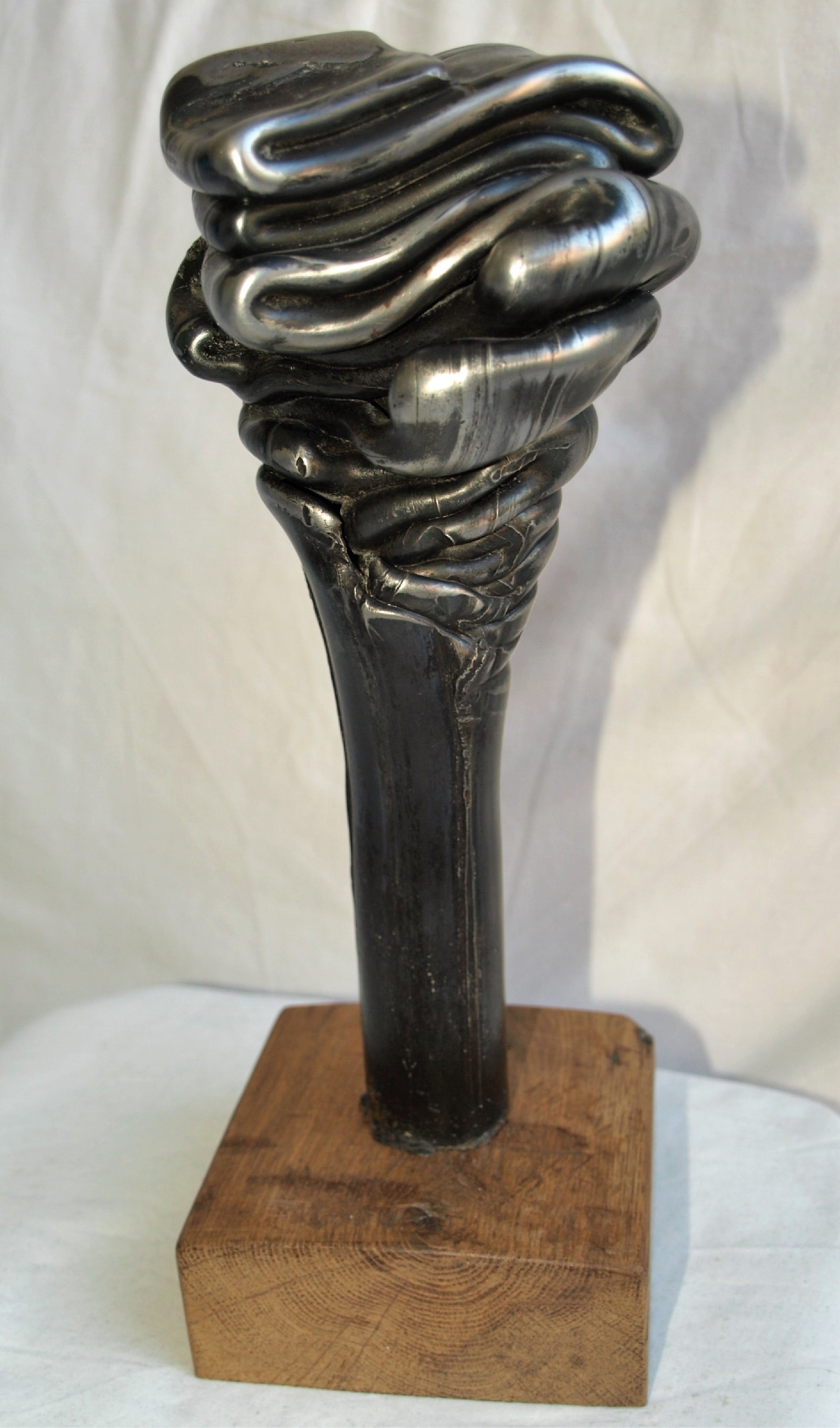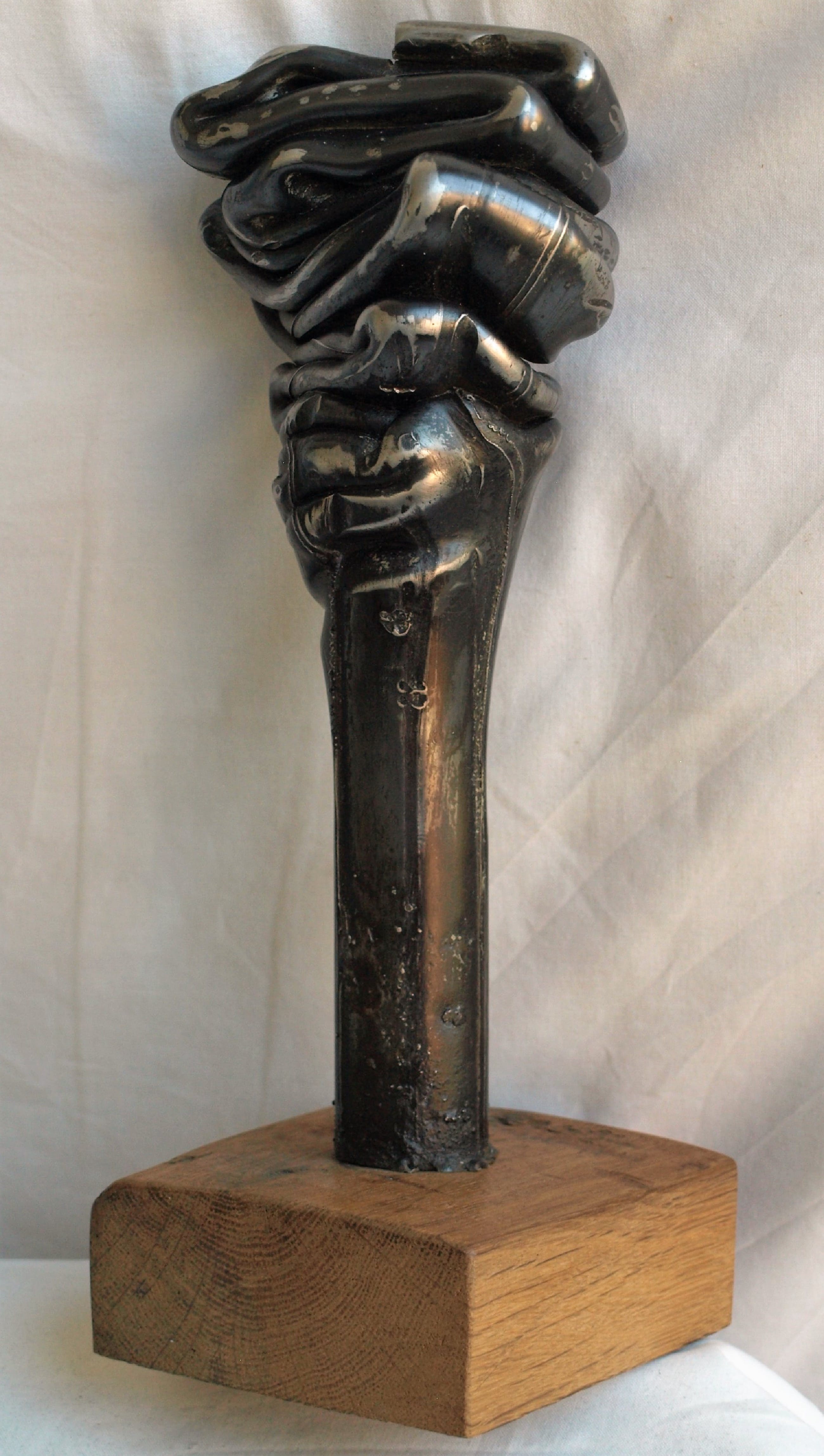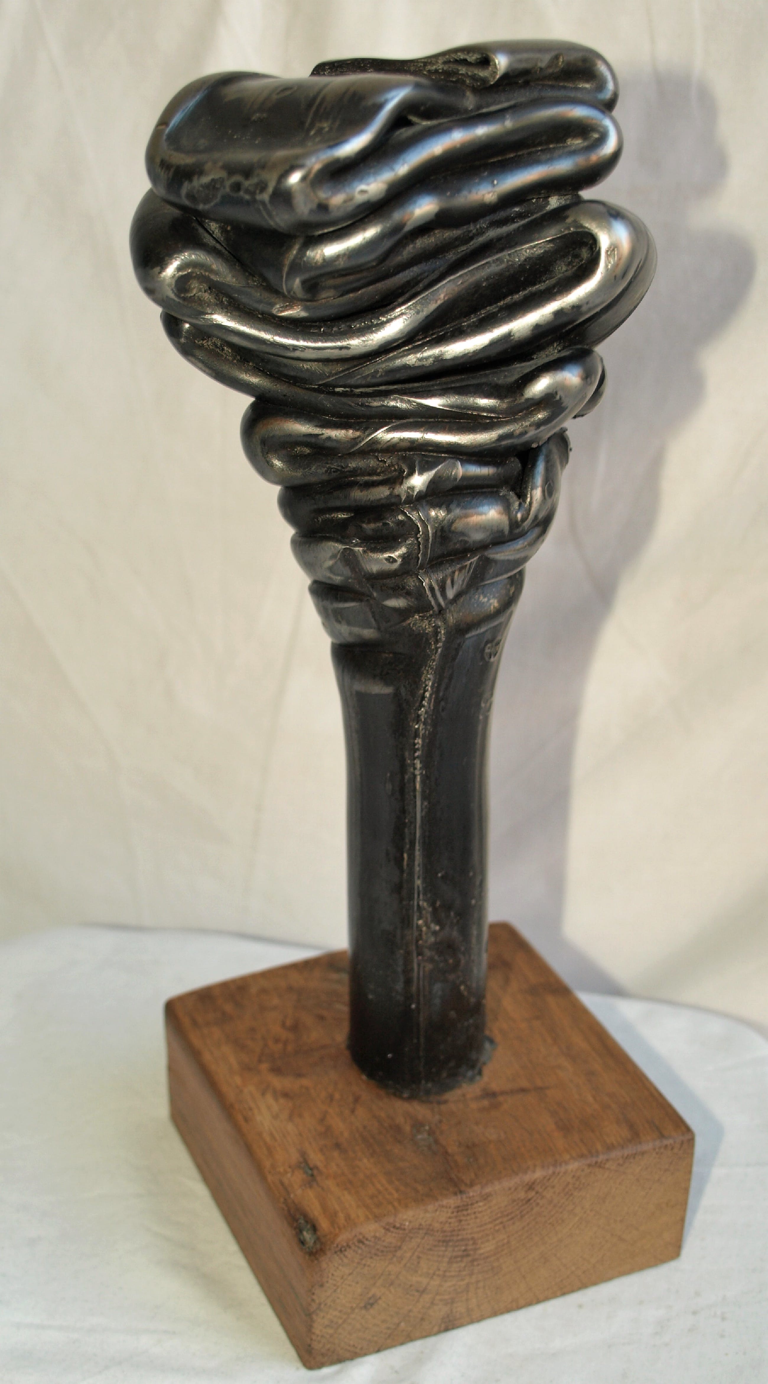 Een beeld van een ons onbekende kunstenaar, op een houten voet.