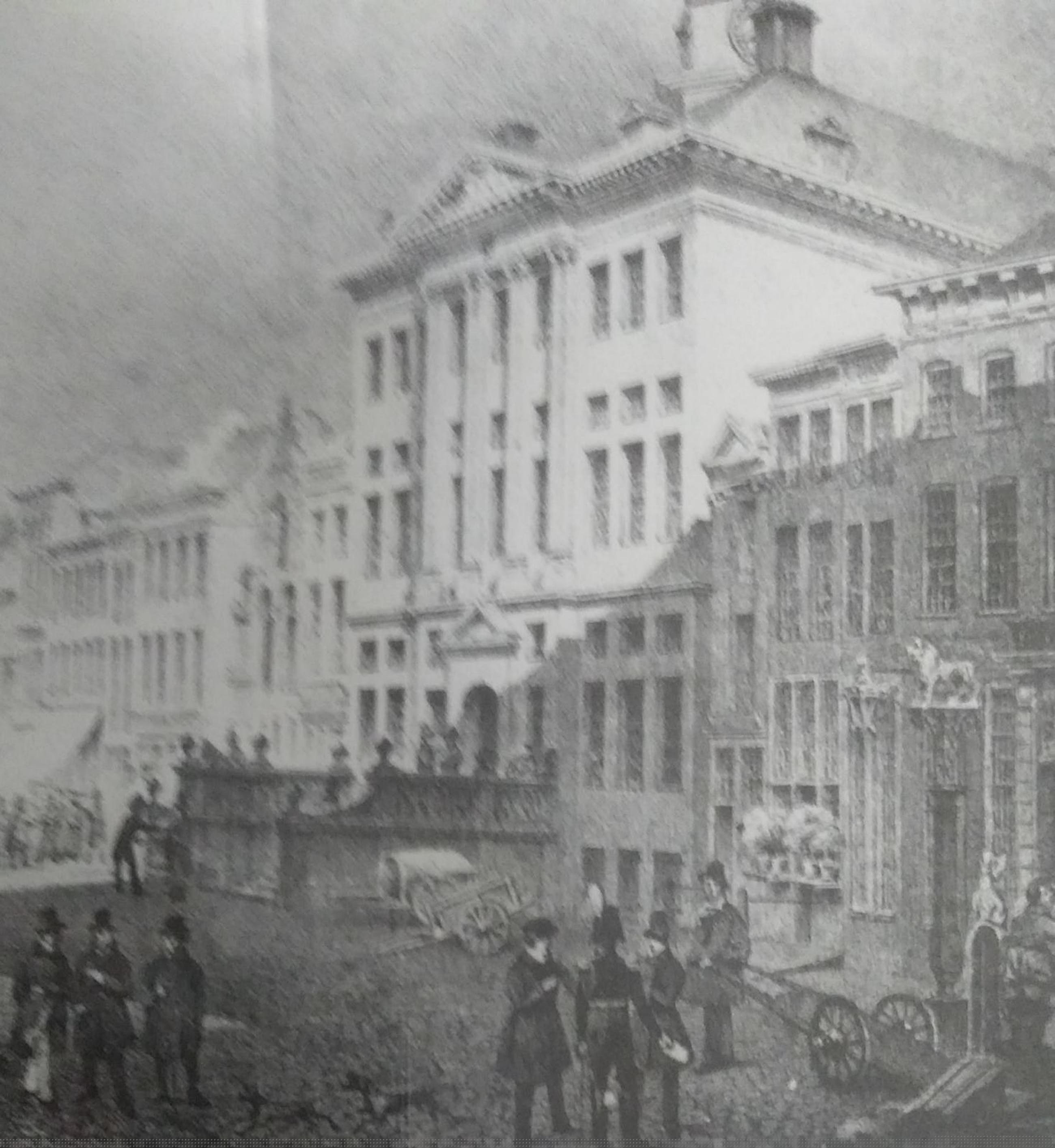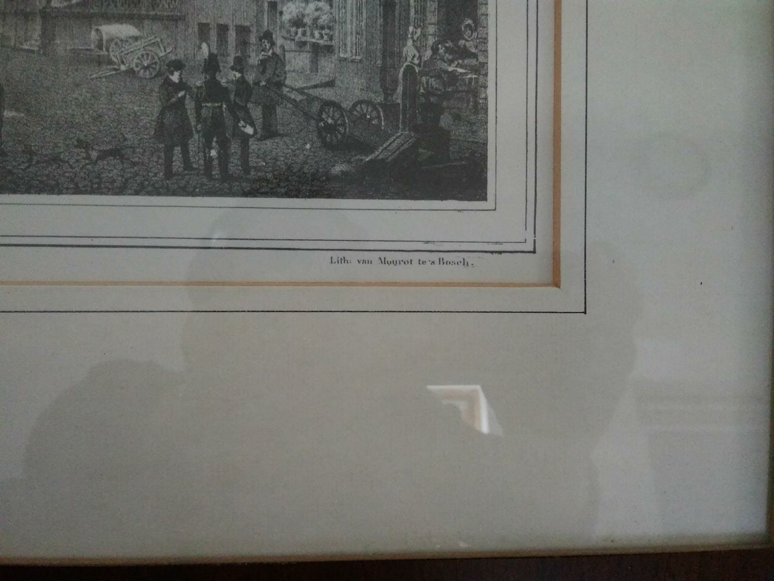 Prachtige Steendruk van Michel Mourot van de markt van Den Bosch met stadhuis van Den Bosch. Michel Mourot: Werkzame periode 1818 - 1847 Amsterdam 1822 - 1824Utrecht 1828 - 1830illustreerde met I.P. Houtman 'Gezichten van Buitenplaatsen en Gebouwen gelegen tusschen de stad Utrecht en de Grebbe', uitgegeven door Houtman in 1829Den Bosch 1835 - 1838hier vestigde hij een steendrukkerij, die geen succes bleekDen HaagAmsterdam 1842Utrecht 1844 - 1847