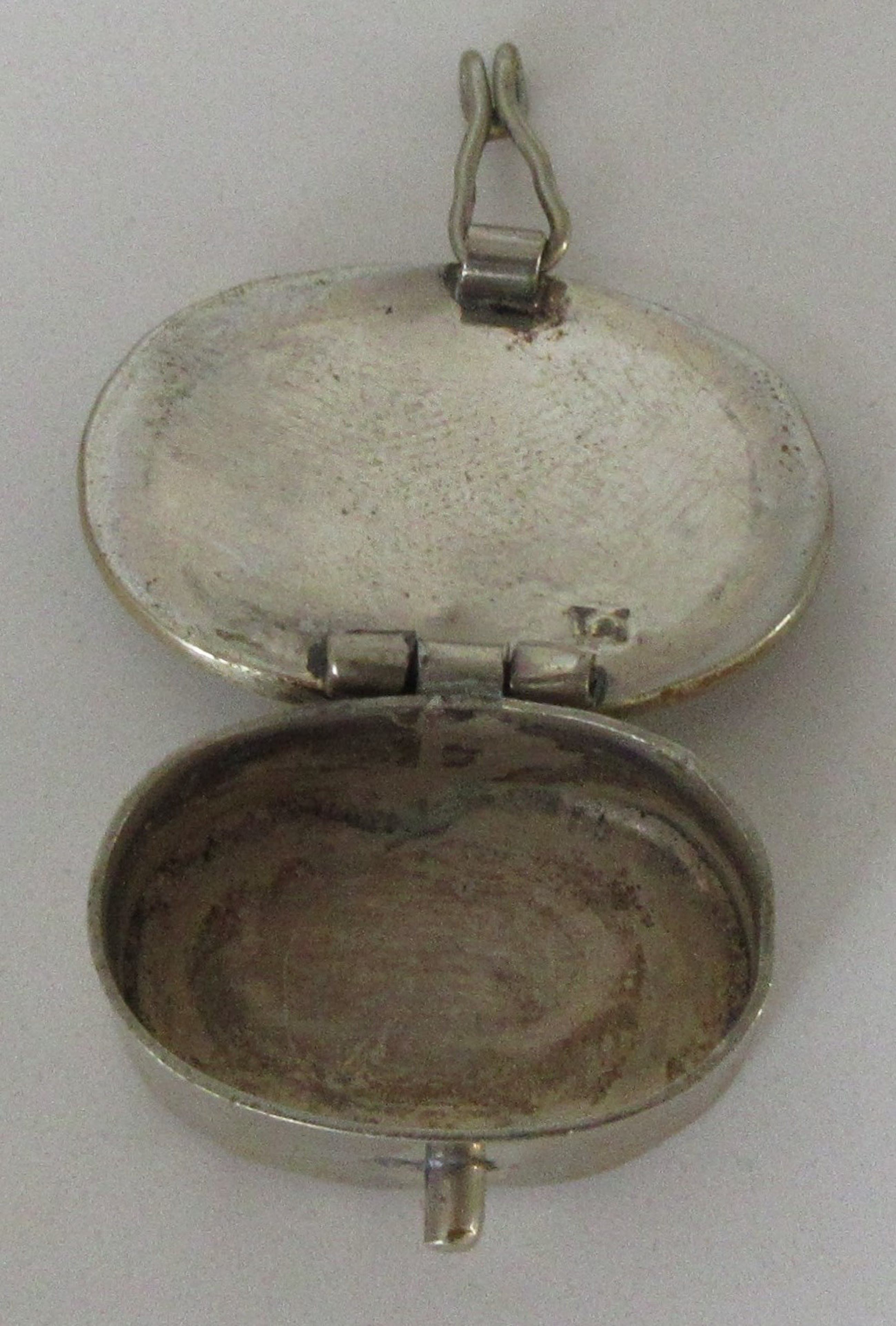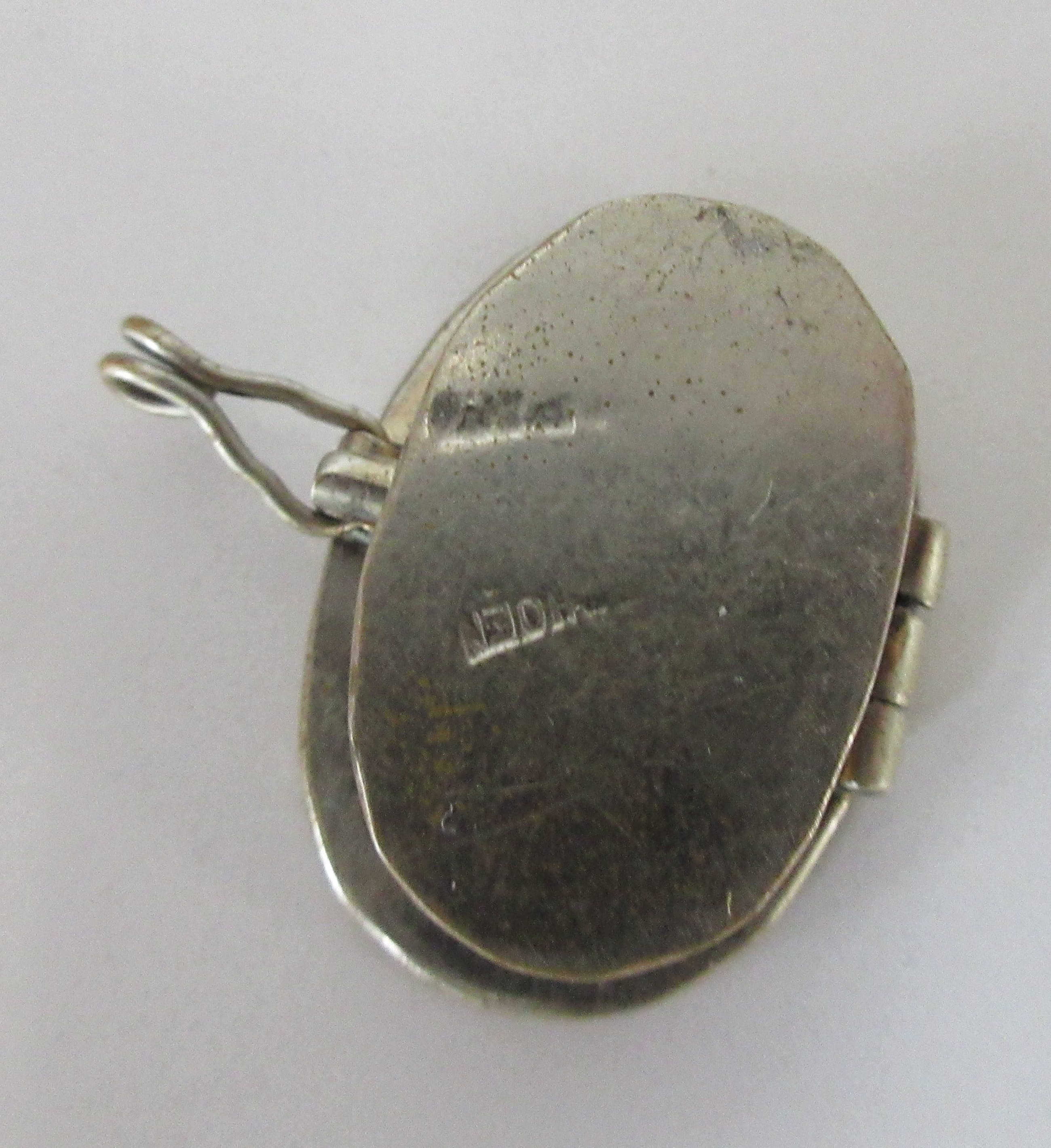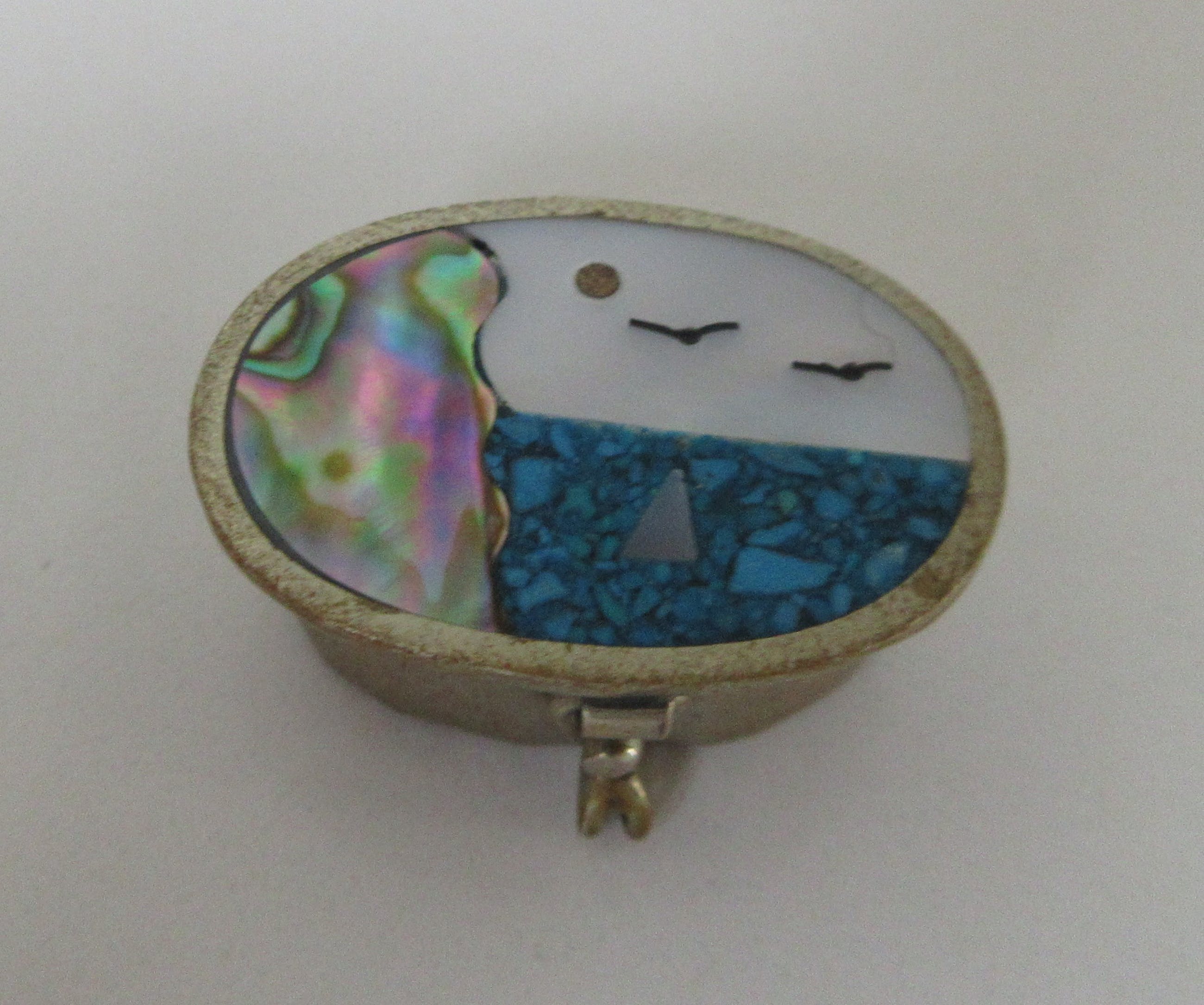 Miniatuur zilveren doosje met parelmoer decoratie van een zeegezicht; lucht, vogels, zee en rotsen. Het doosje is in de deksel gemerkt en op de onderzijde. Maker helaas onbekend.