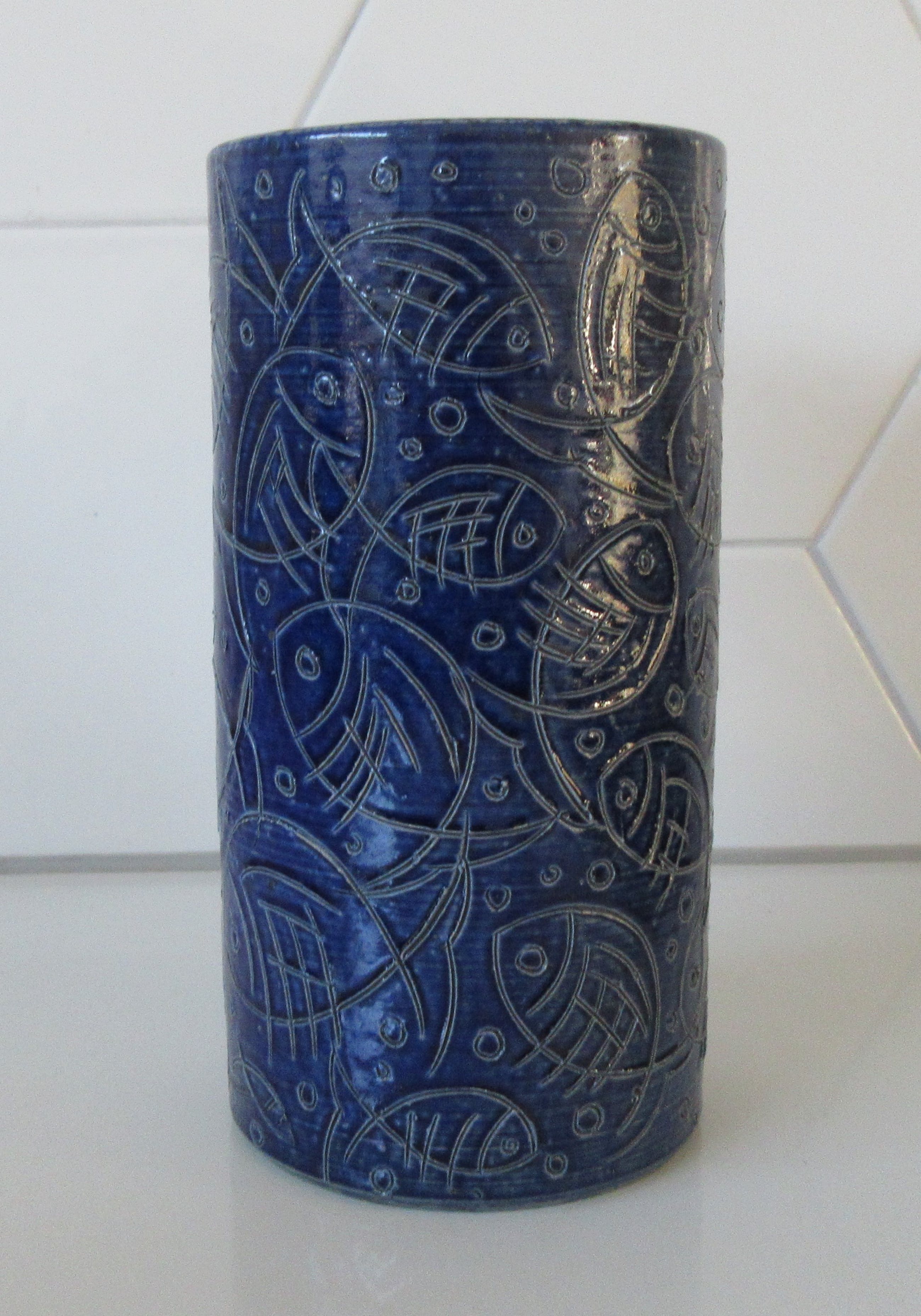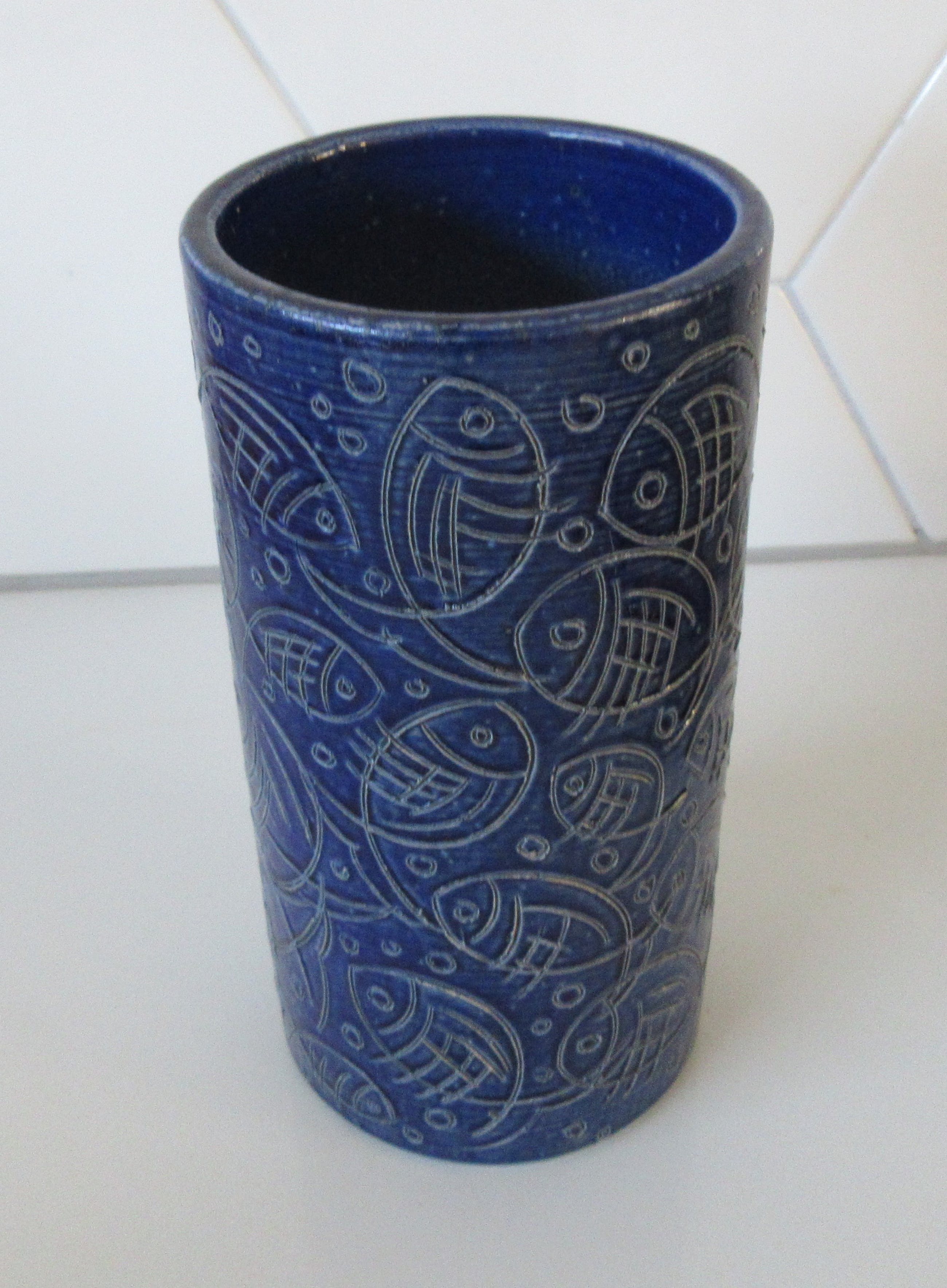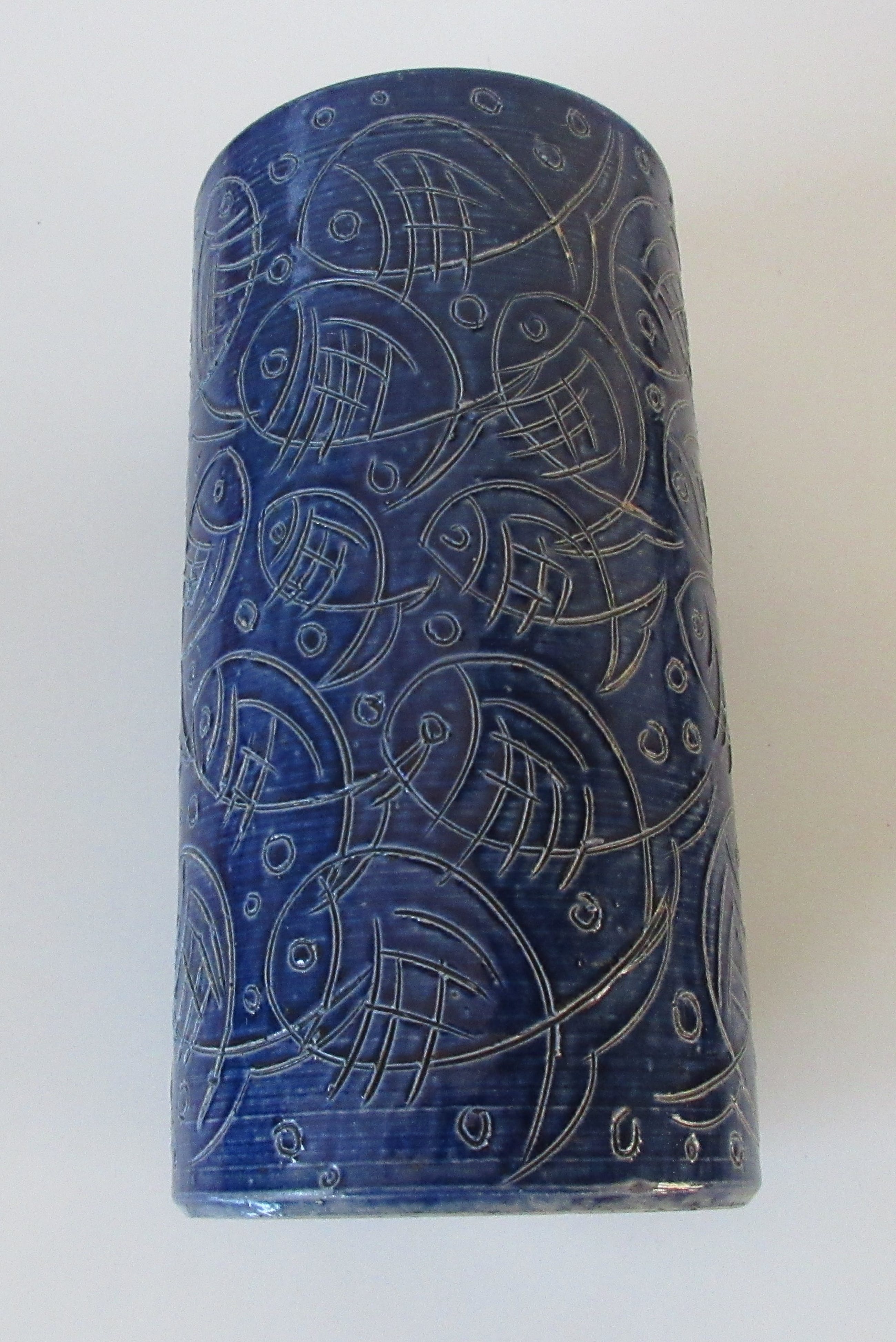 Moderne Westerwald hand gemaakte steengoed zoutglazuren vaas met incisie decor vissen. In prima onbeschadigde conditie. Niet gemerkt, dus fabriek onbekend. Wel voorzien van de ingedrukte tekst 'Handarbeit'.