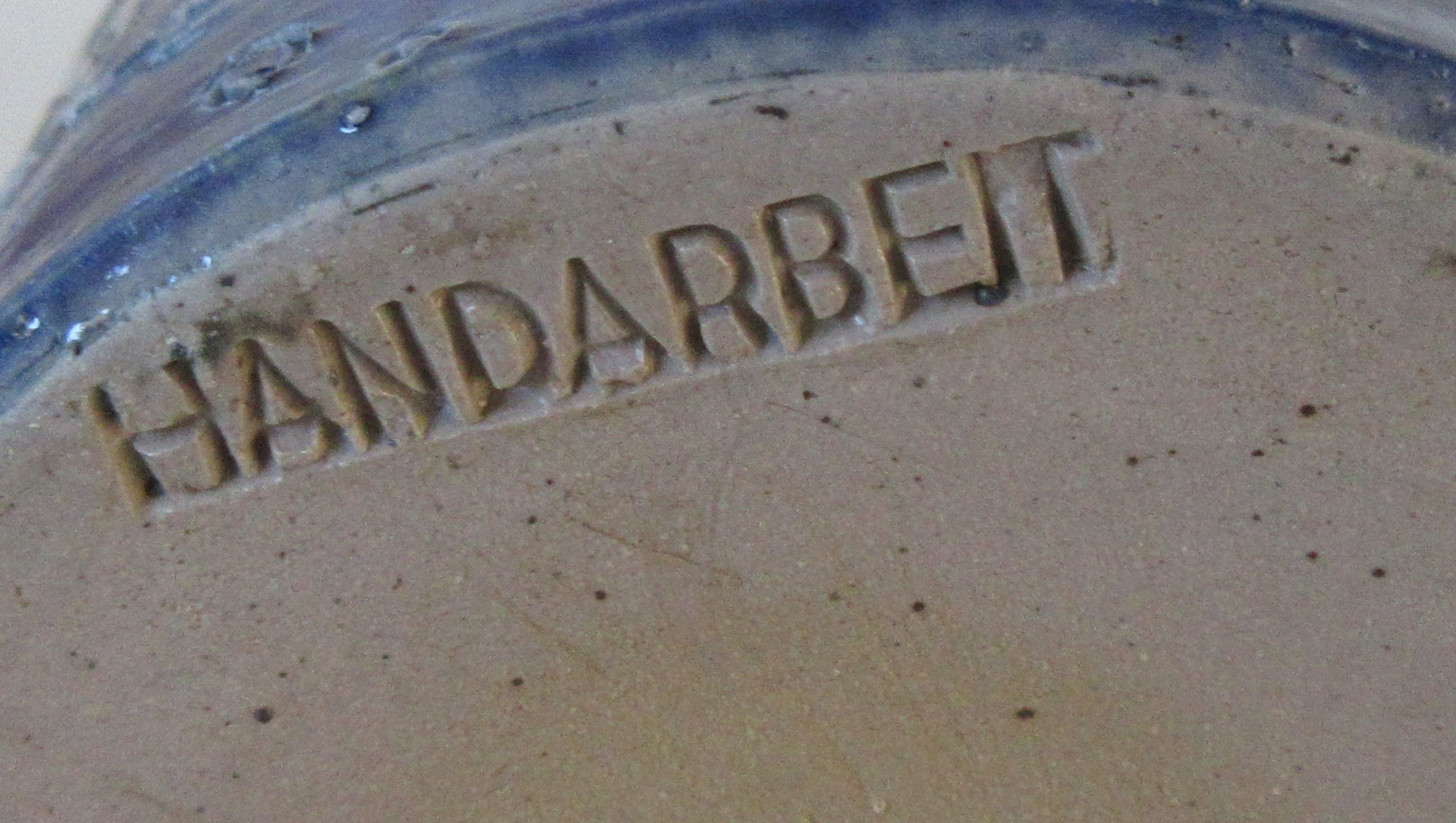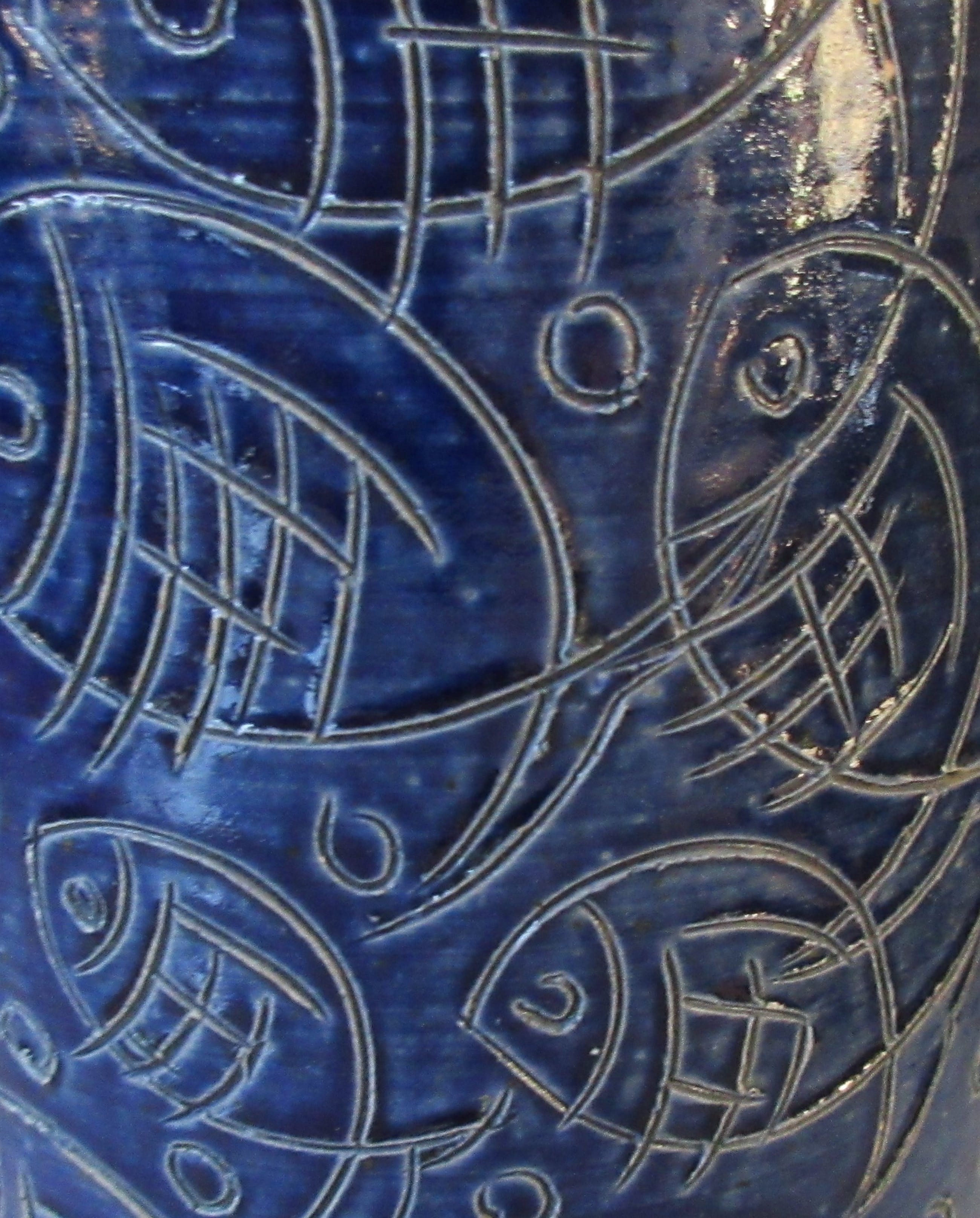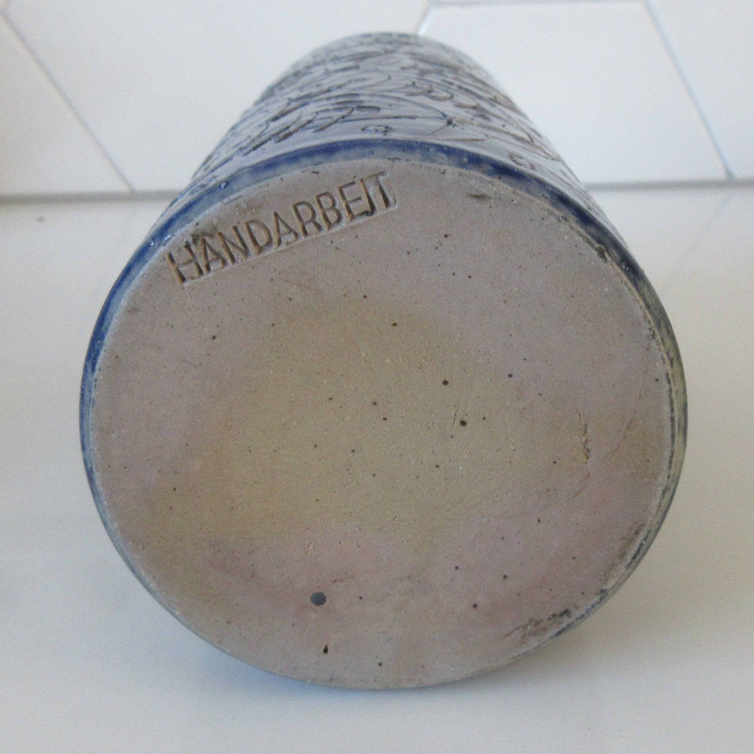 Moderne Westerwald hand gemaakte steengoed zoutglazuren vaas met incisie decor vissen. In prima onbeschadigde conditie. Niet gemerkt, dus fabriek onbekend. Wel voorzien van de ingedrukte tekst 'Handarbeit'.