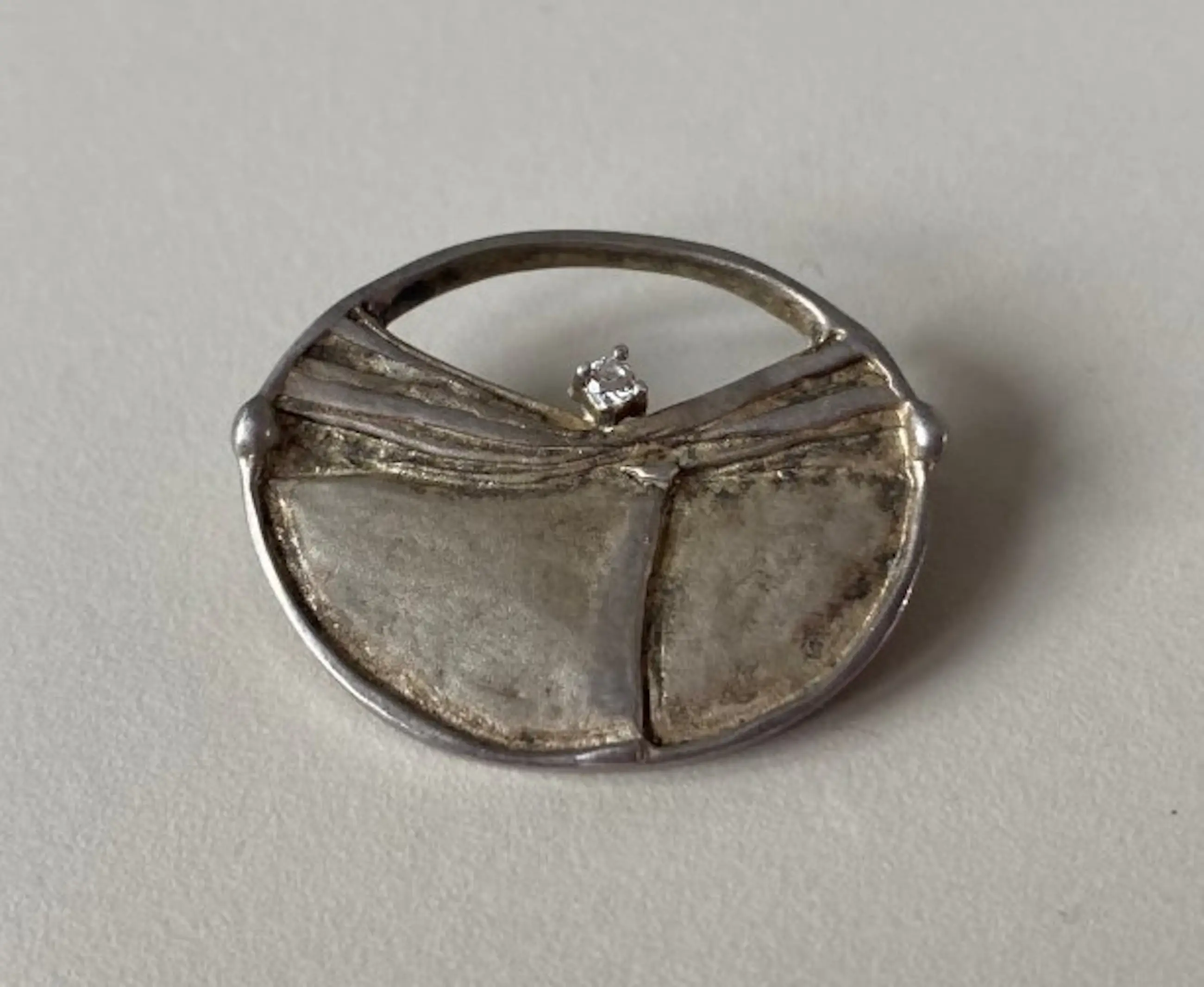 Moderne zilveren broche met steen mogelijk een diamantje. Mooi hang gemaakt designer sieraad, helaas niet gesigneerd. Gewicht 6,8 gram