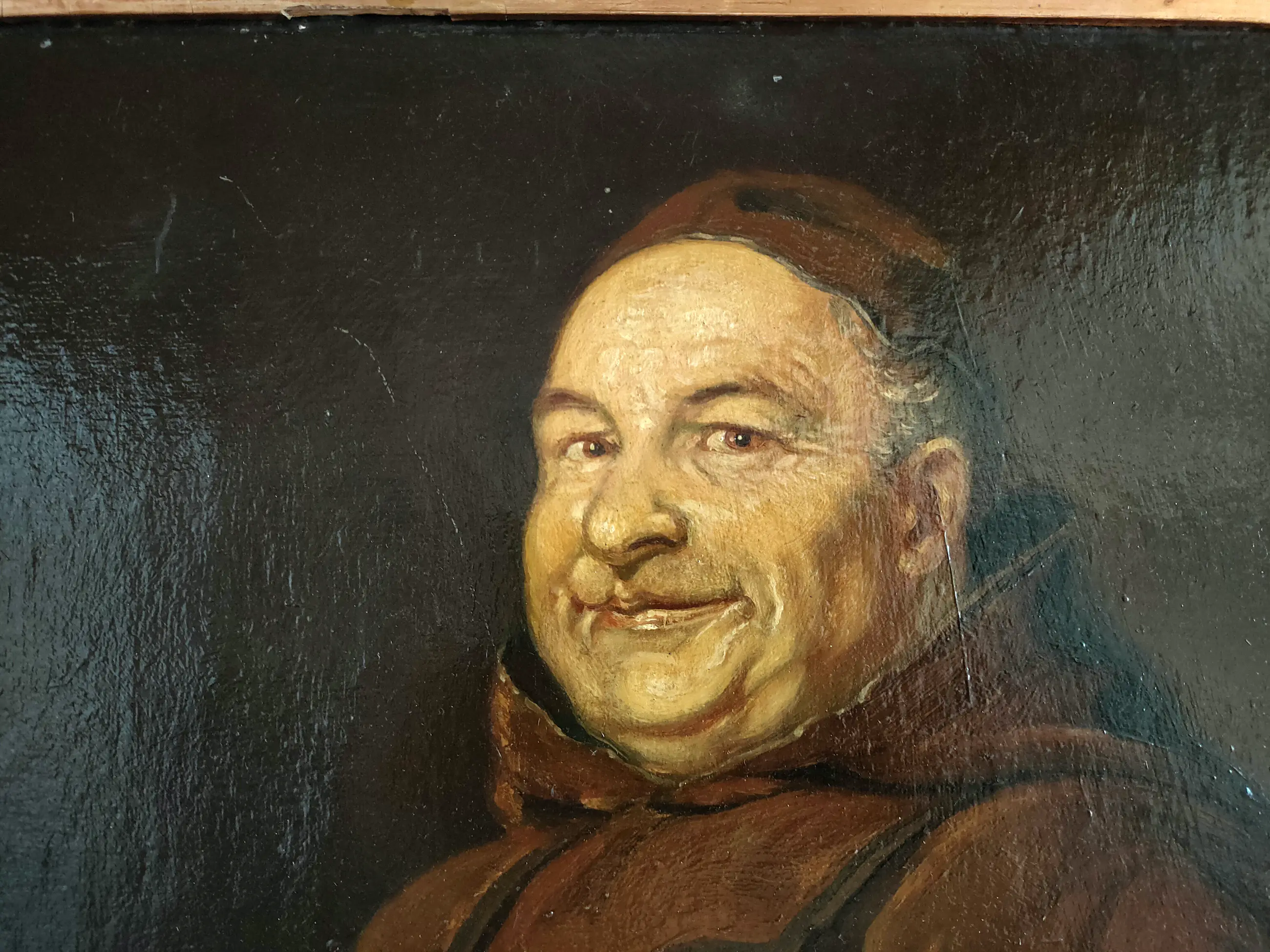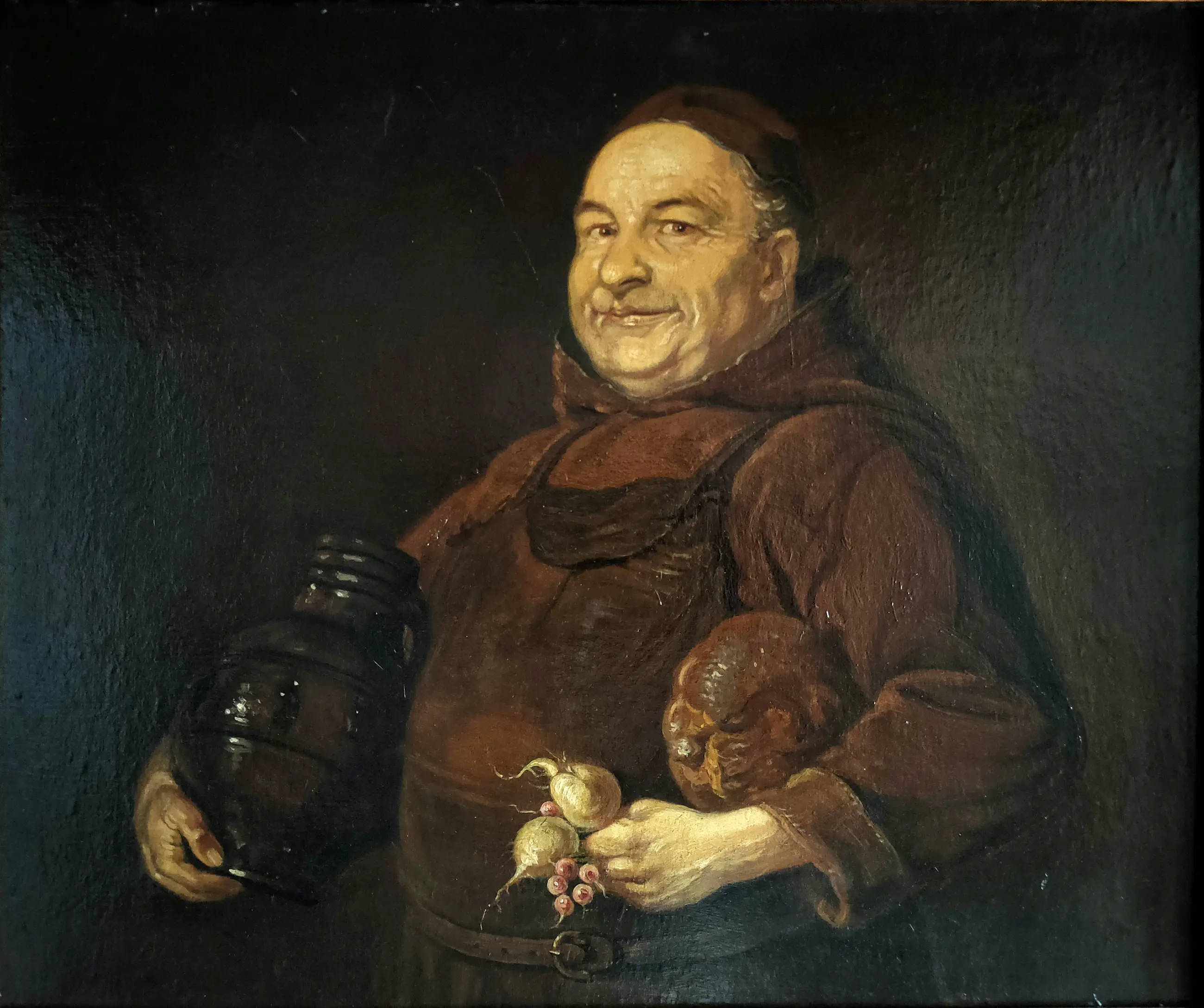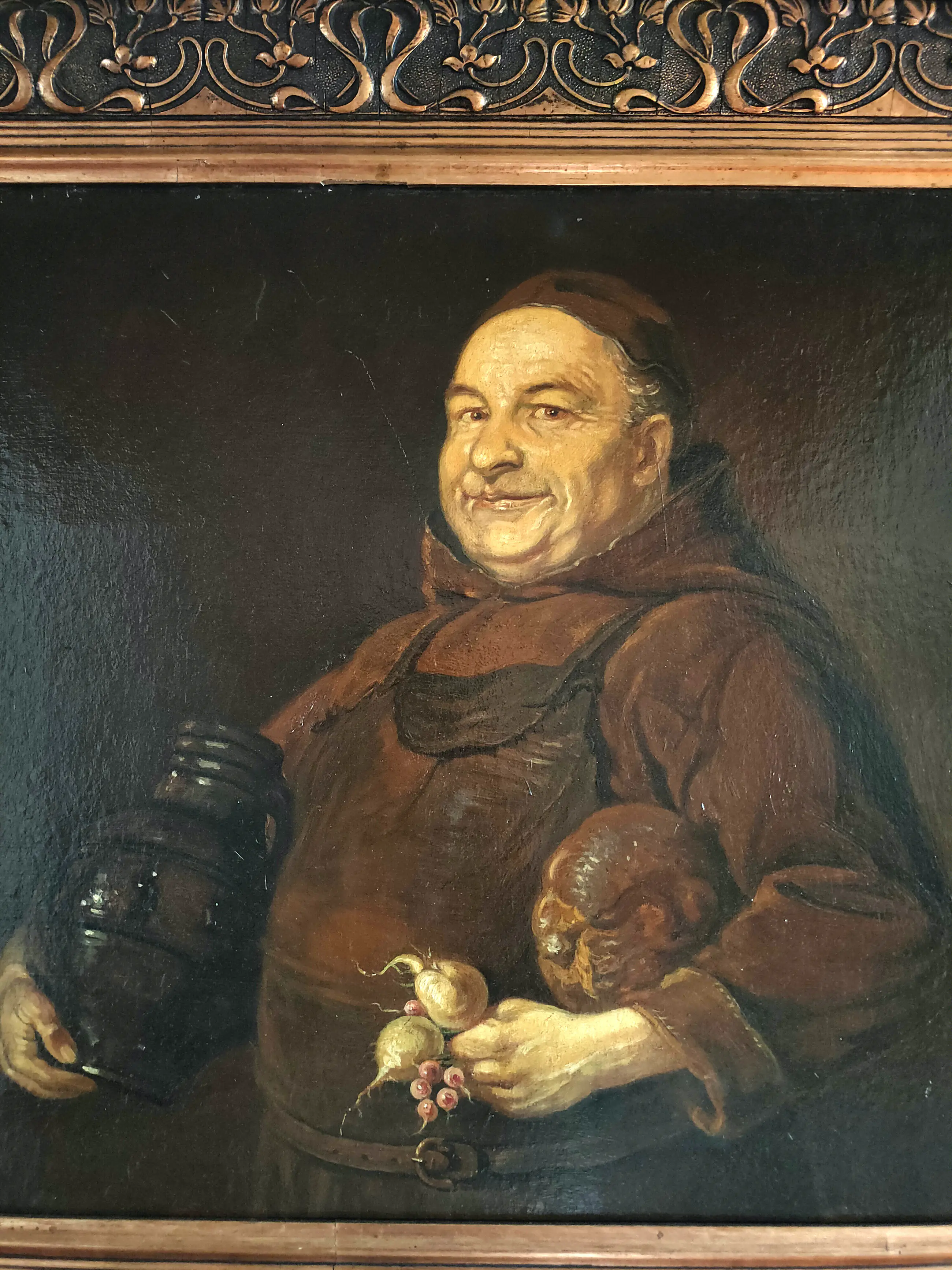Monnik/kok met aardewerken kan - mogelijk Duitse school. Olijke, dikke monnik of kok met attributen (bierkan, knollen en brood). Het werk heeft enkele lichte krasjes en de lijst heeft een aantal beschadigingen en ontbrekende stukken. (zie foto's).