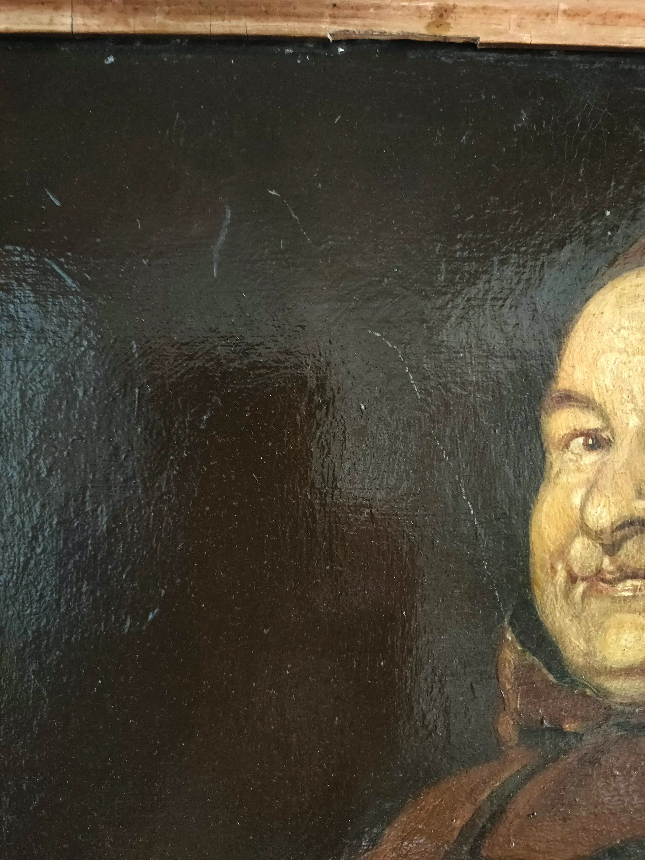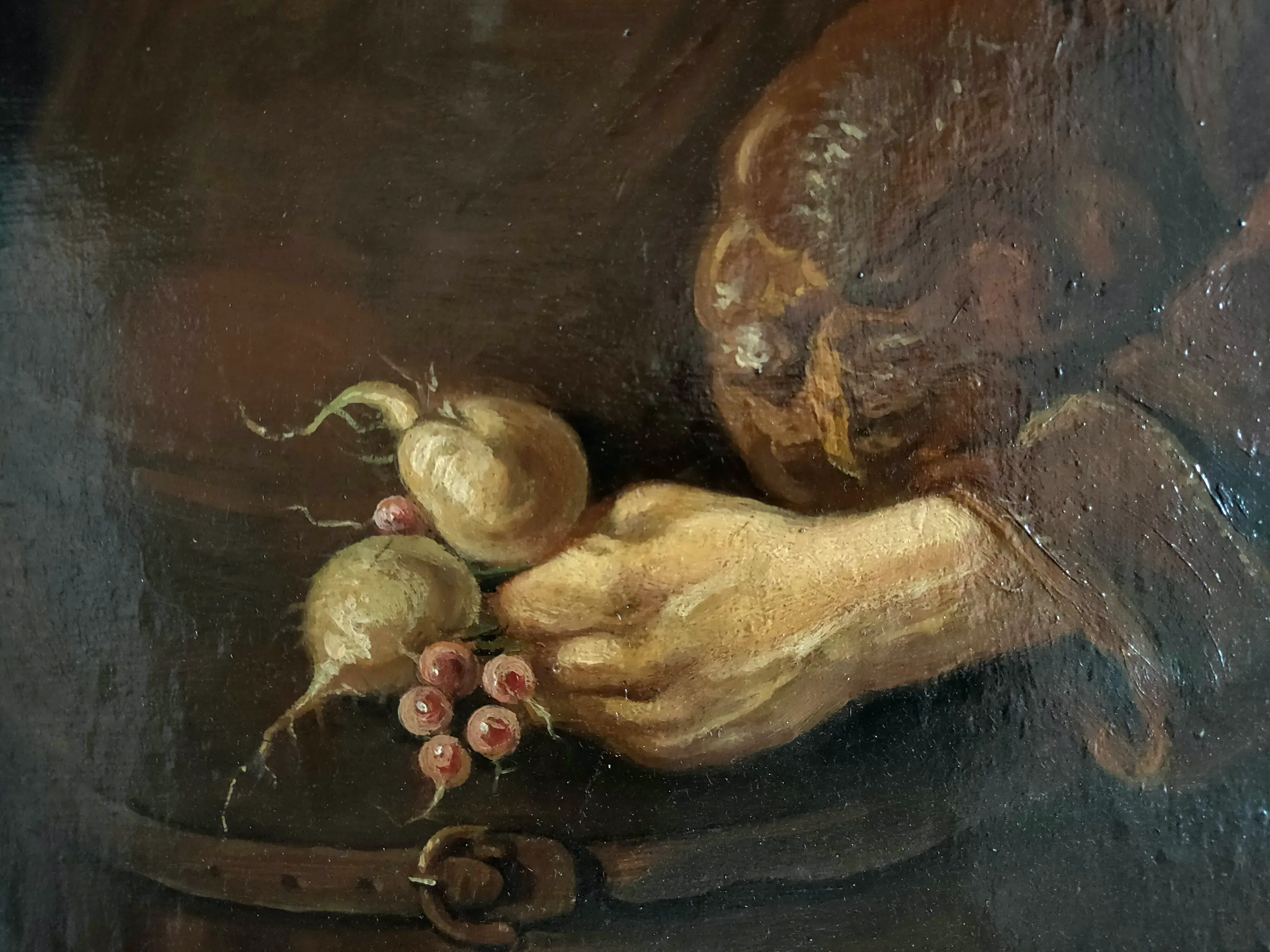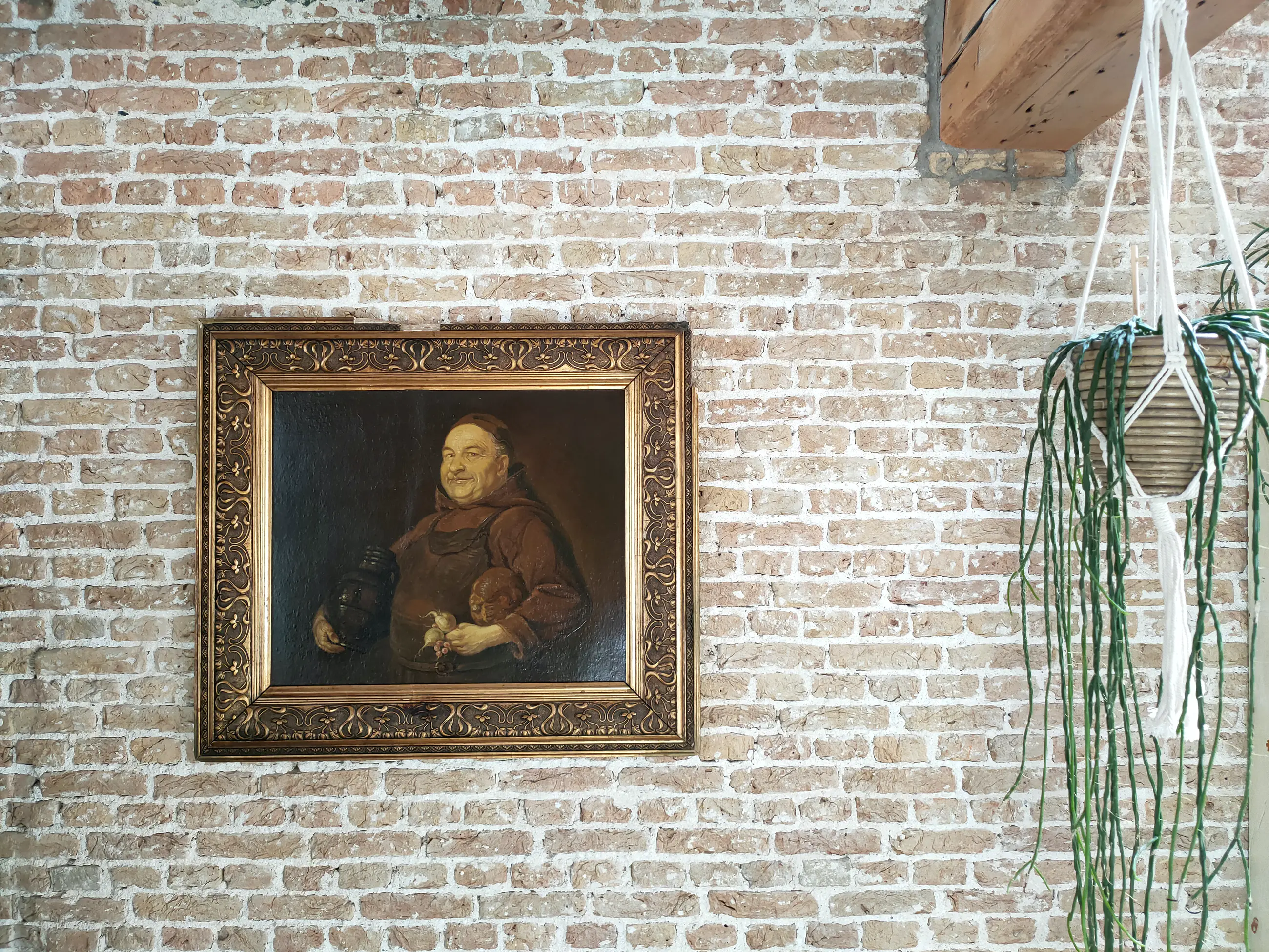 Monnik/kok met aardewerken kan - mogelijk Duitse school. Olijke, dikke monnik of kok met attributen (bierkan, knollen en brood). Het werk heeft enkele lichte krasjes en de lijst heeft een aantal beschadigingen en ontbrekende stukken. (zie foto's).